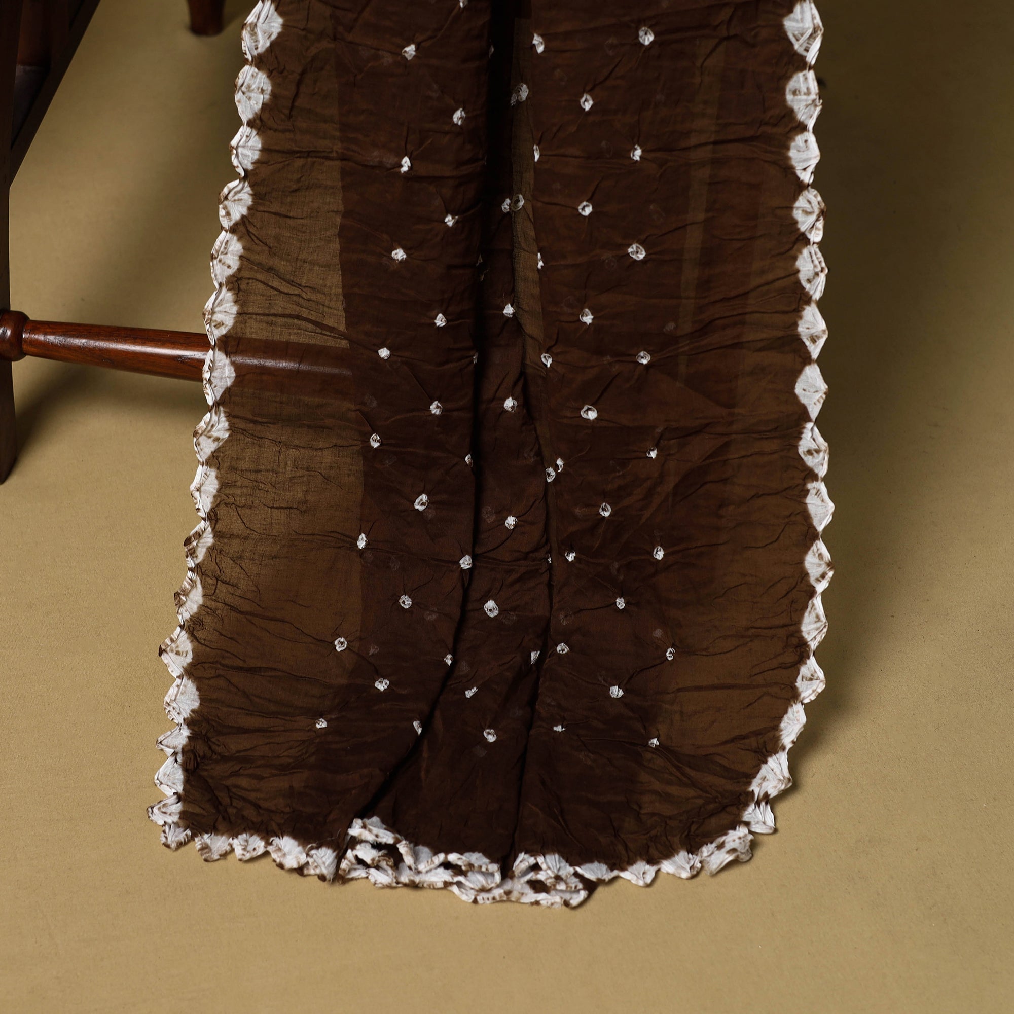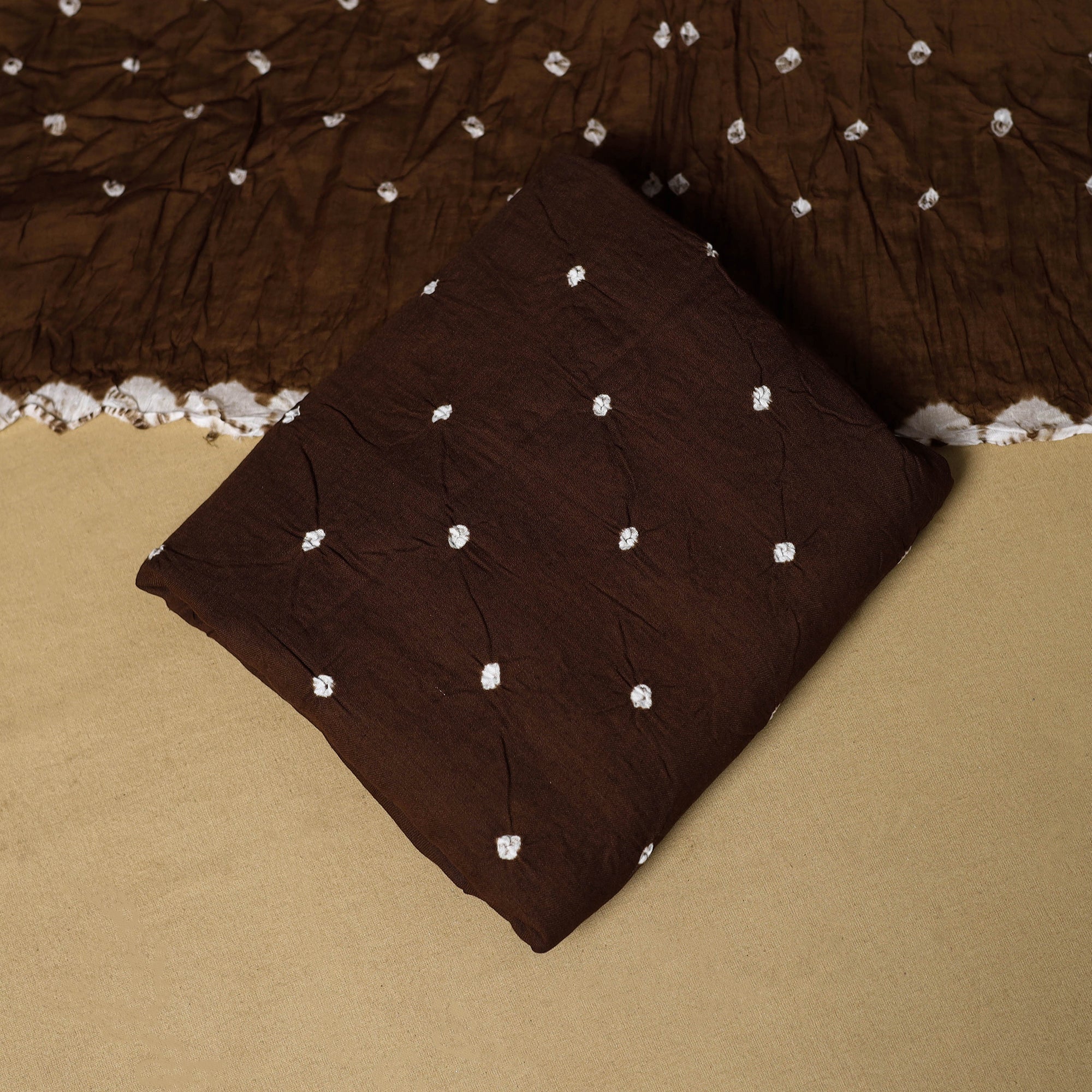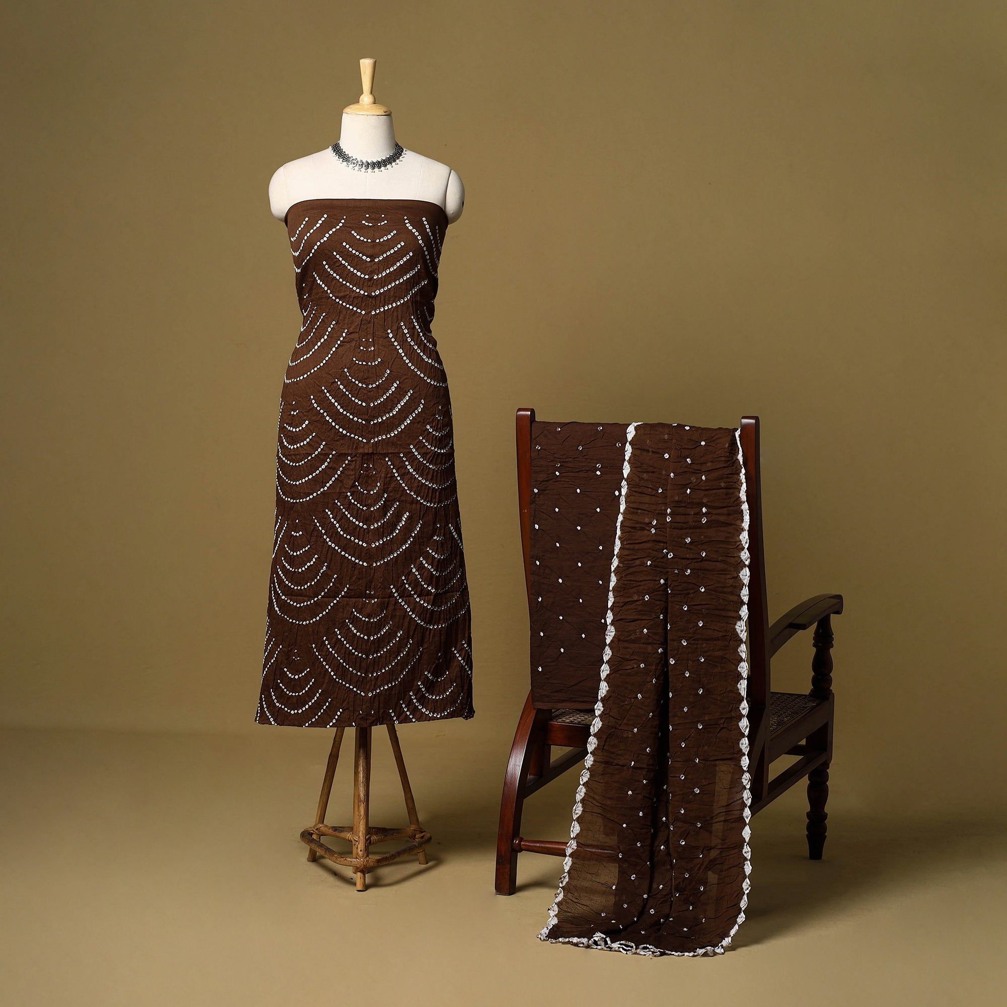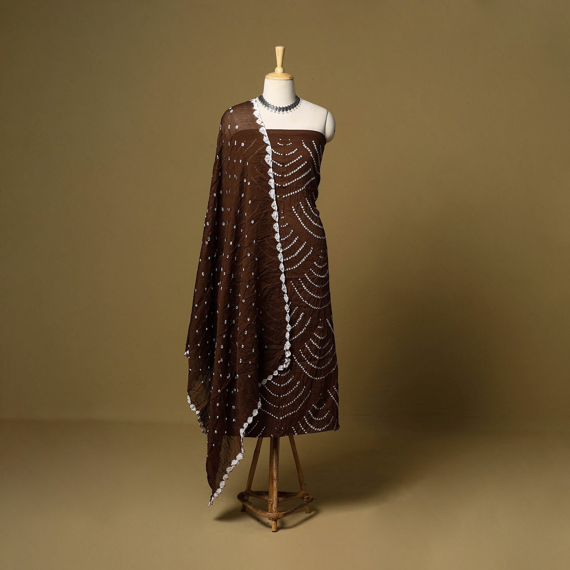 Brown 3pc satin cotton bandhani dress material is crafted by artisan Shabana Khatri from Kutch. Made using the traditional tie & dye technique, each fabric piece shows beautiful bandhani patterns. The set includes fabric for a kurta, bottom and dupatta, giving you the freedom to design your own outfit. Ideal for festive occasions or everyday wear, it adds a vibrant and traditional touch to your wardrobe.