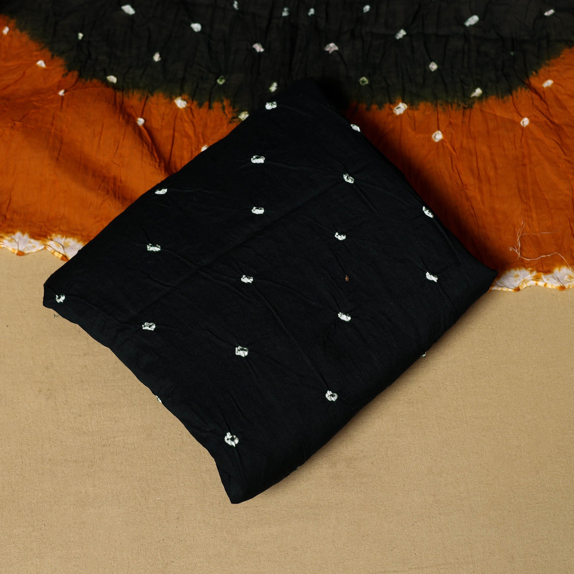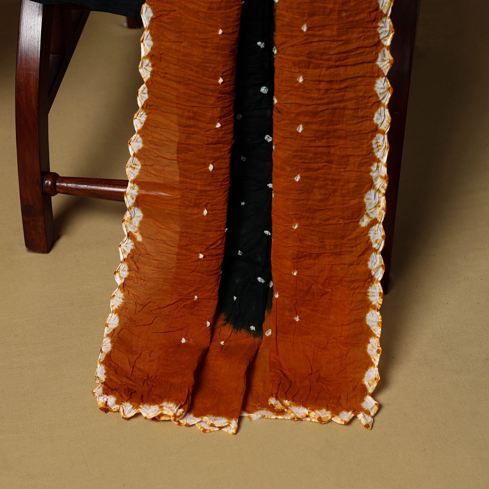 Orange 3pc satin cotton bandhani dress material is crafted by artisan Shabana Khatri from Kutch. Made using the traditional tie & dye technique, each fabric piece shows beautiful bandhani patterns. The set includes fabric for a kurta, bottom and dupatta, giving you the freedom to design your own outfit. Ideal for festive occasions or everyday wear, it adds a vibrant and traditional touch to your wardrobe.