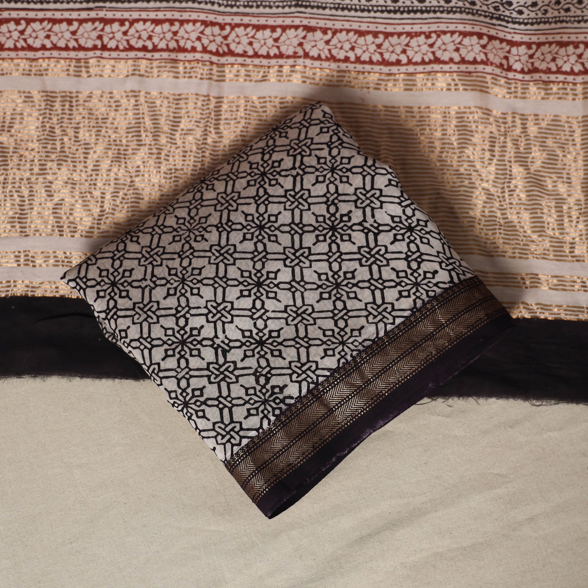 Enhance your wardrobe with this elegant black 3pc maheshwari silk-cotton bagh print dress material set. Made in Bagh, Madhya Pradesh, it features traditional hand block printing by skilled artisans. The patterns are created using natural dyes, and each set has its own unique look. Accented with a subtle zari border, it's perfect for casual days, family visits, or festive occasions.