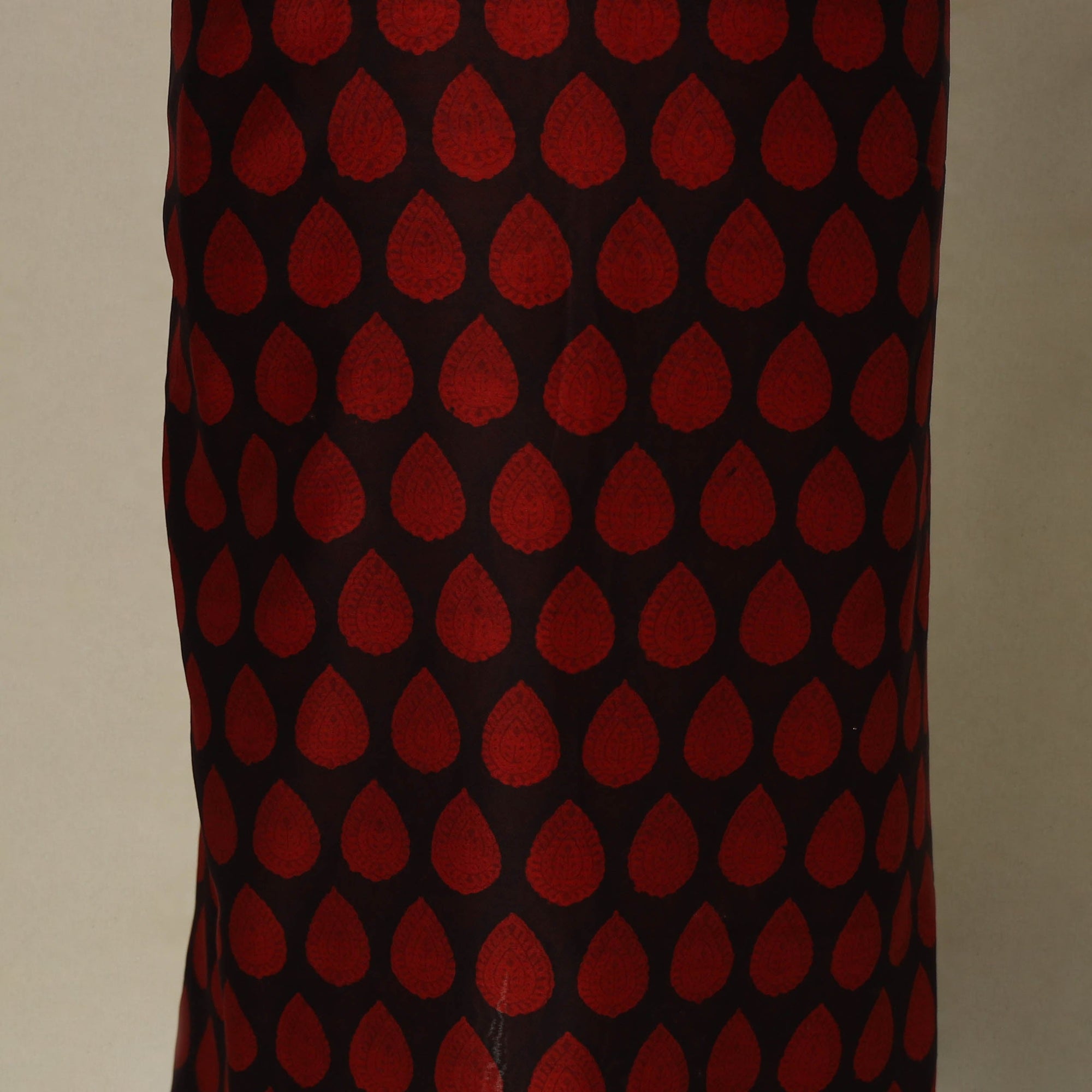 Enhance your wardrobe with this elegant red 3pc maheshwari silk-cotton bagh print dress material set. Made in Bagh, Madhya Pradesh, it features traditional hand block printing by skilled artisans. The patterns are created using natural dyes, and each set has its own unique look. Accented with a subtle zari border, it's perfect for casual days, family visits, or festive occasions.