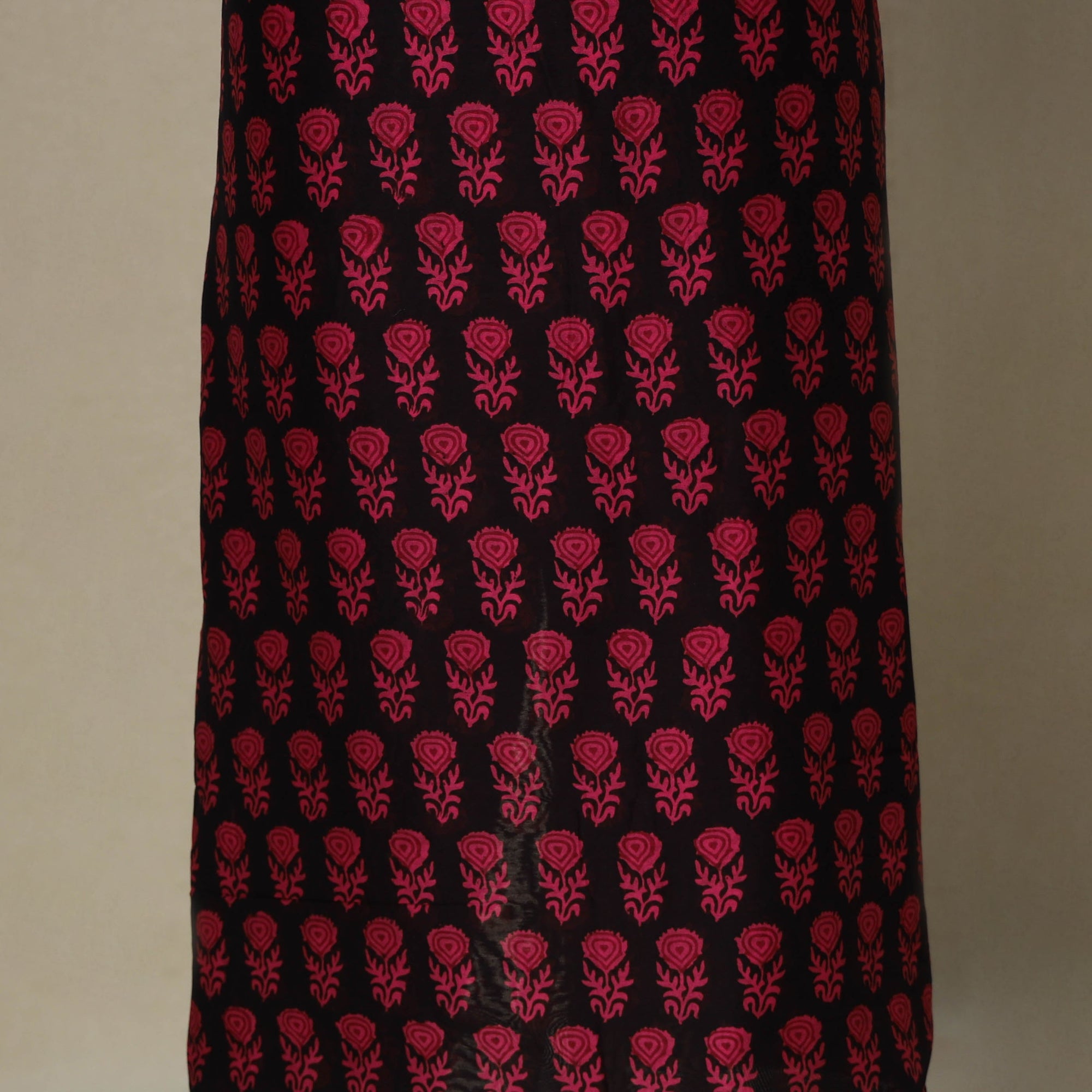 Bagh layouts are dramatic with the use of black and red alternately on a white background. Its production process is manually painstaking. Though the techniques and designs are age-old the prints retain their contemporary appeal.