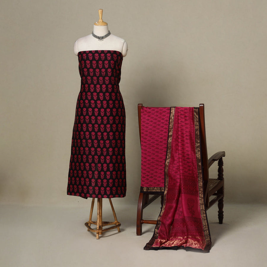Enhance your wardrobe with this elegant pink 3pc maheshwari silk-cotton bagh print dress material set. Made in Bagh, Madhya Pradesh, it features traditional hand block printing by skilled artisans. The patterns are created using natural dyes, and each set has its own unique look. Accented with a subtle zari border, it's perfect for casual days, family visits, or festive occasions.
