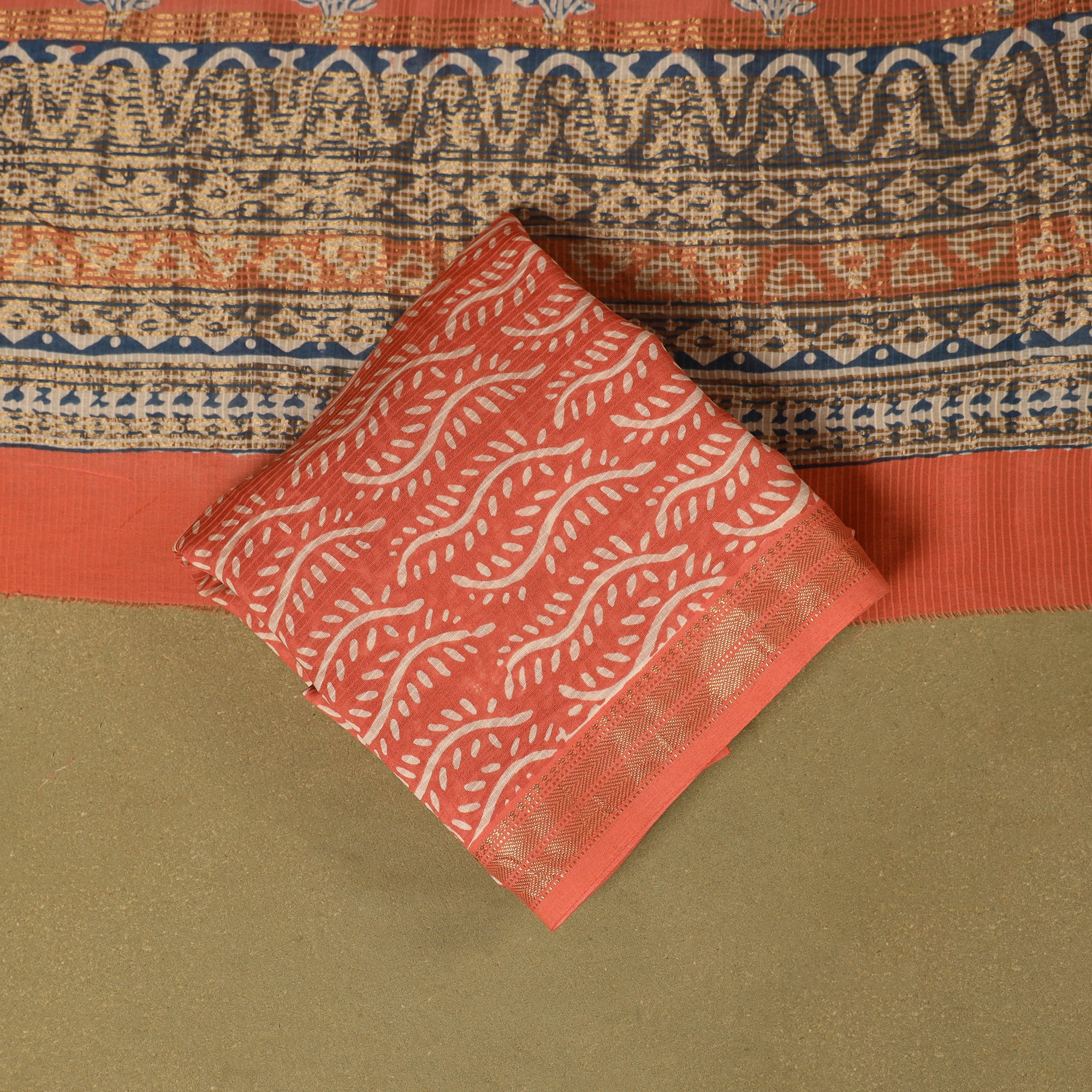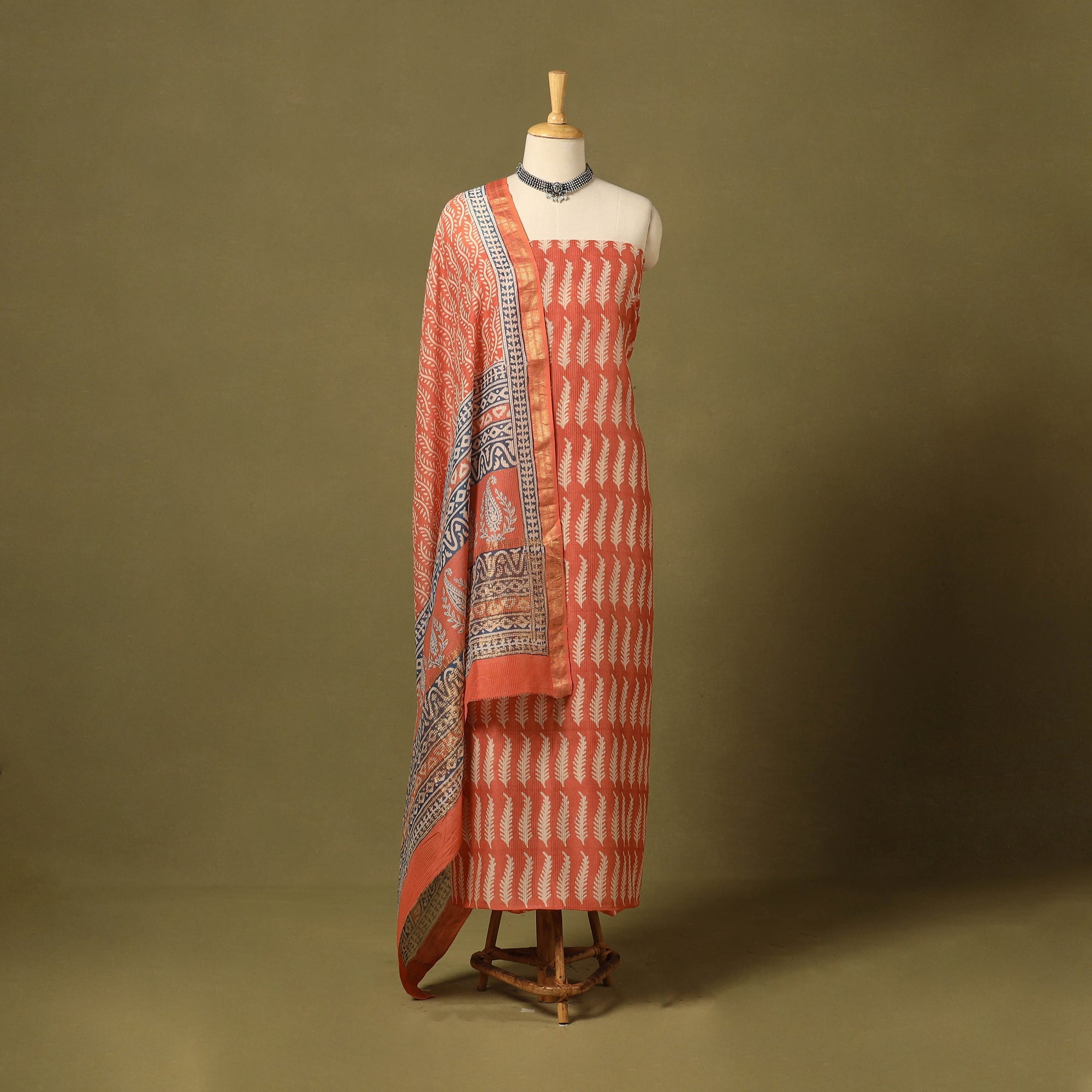 This ed 3pc maheshwari silk cotton unstitched dress material is beautifully adorned with traditional bagh block prints from Madhya Pradesh. Made using natural dyes, the set includes a coordinated top, bottom, and dupatta. The elegant zari border enhances its festive appeal, adding a refined touch of charm. A graceful blend of tradition, artistry, and comfort, perfect for everyday elegance and special occasions.