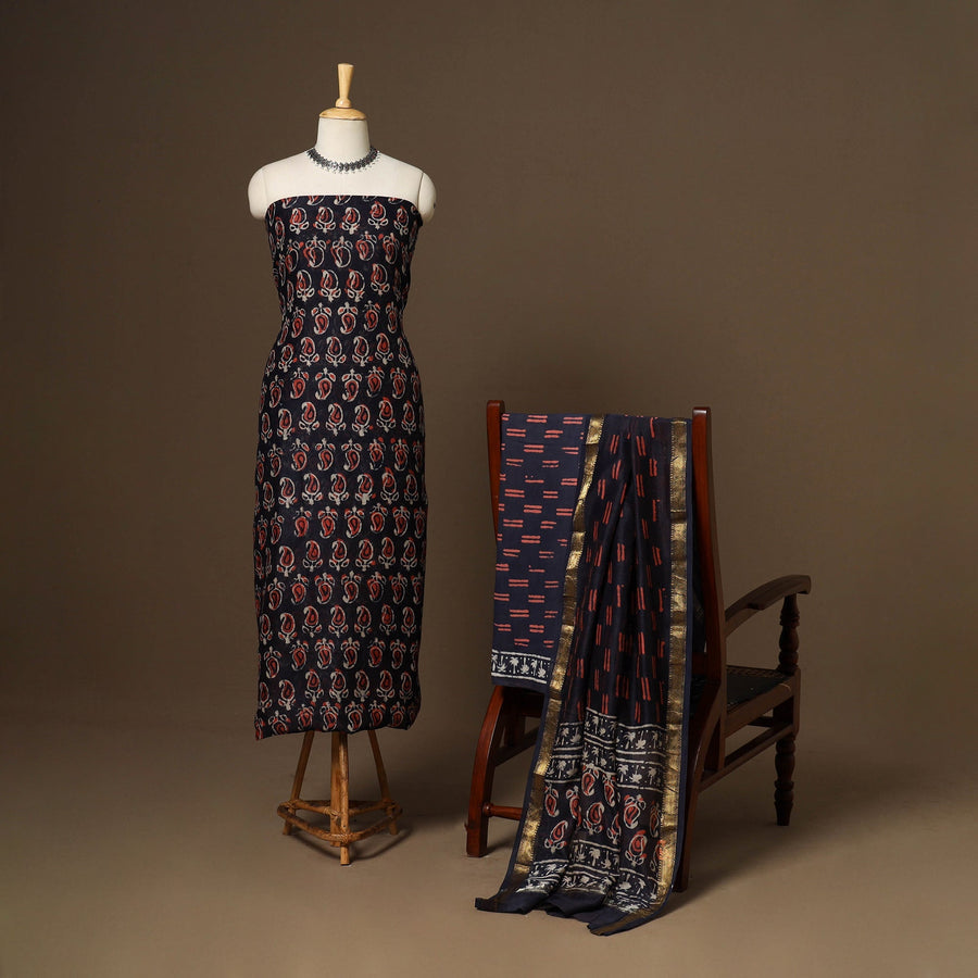 Blue 3pc bagru hand block print dress material with zari border is crafted from chanderi silk-cotton fabric and includes a kurta, a matching dupatta and a cotton bottom. Adorned with fine motifs from Rajasthan, each piece is made using the traditional hand block printing technique, where artisans use hand-carved wooden blocks dipped in natural dyes to imprint intricate designs perfect for festive and everyday elegance.