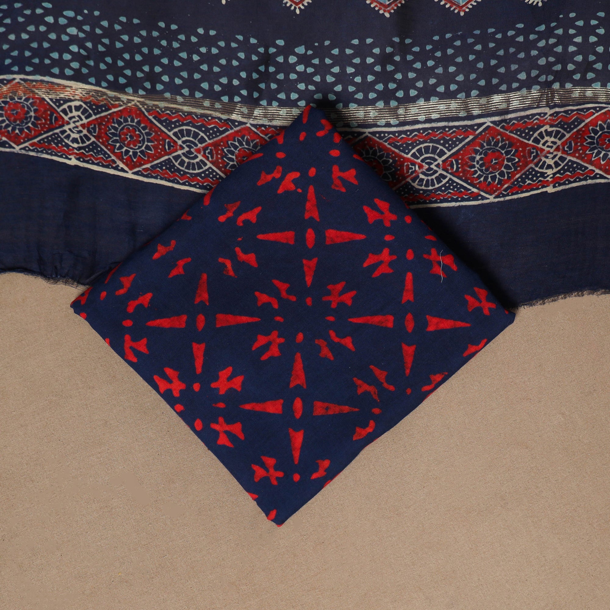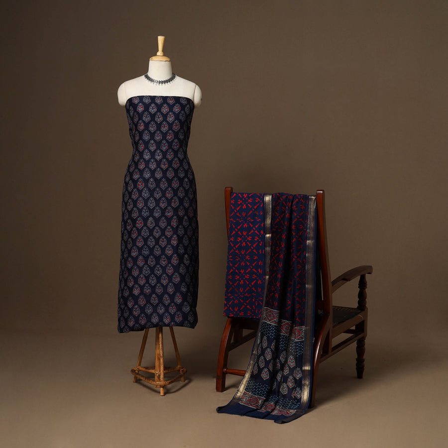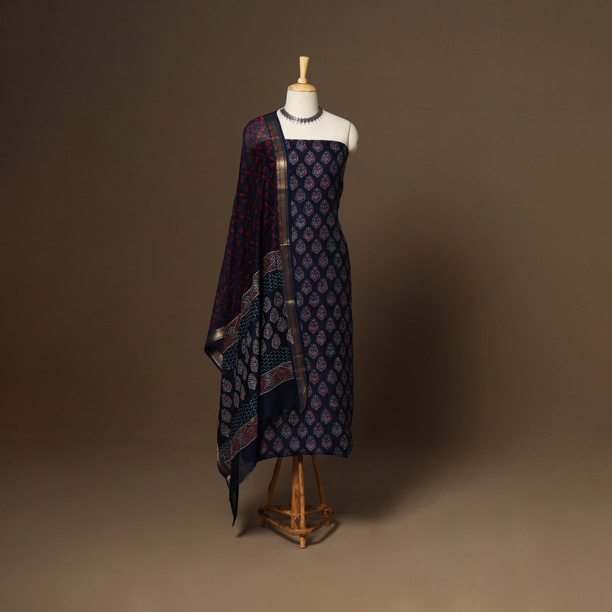 Blue 3pc bagru hand block print dress material with zari border is crafted from chanderi silk-cotton fabric and includes a kurta, a matching dupatta and a cotton bottom. Adorned with fine motifs from Rajasthan, each piece is made using the traditional hand block printing technique, where artisans use hand-carved wooden blocks dipped in natural dyes to imprint intricate designs perfect for festive and everyday elegance.