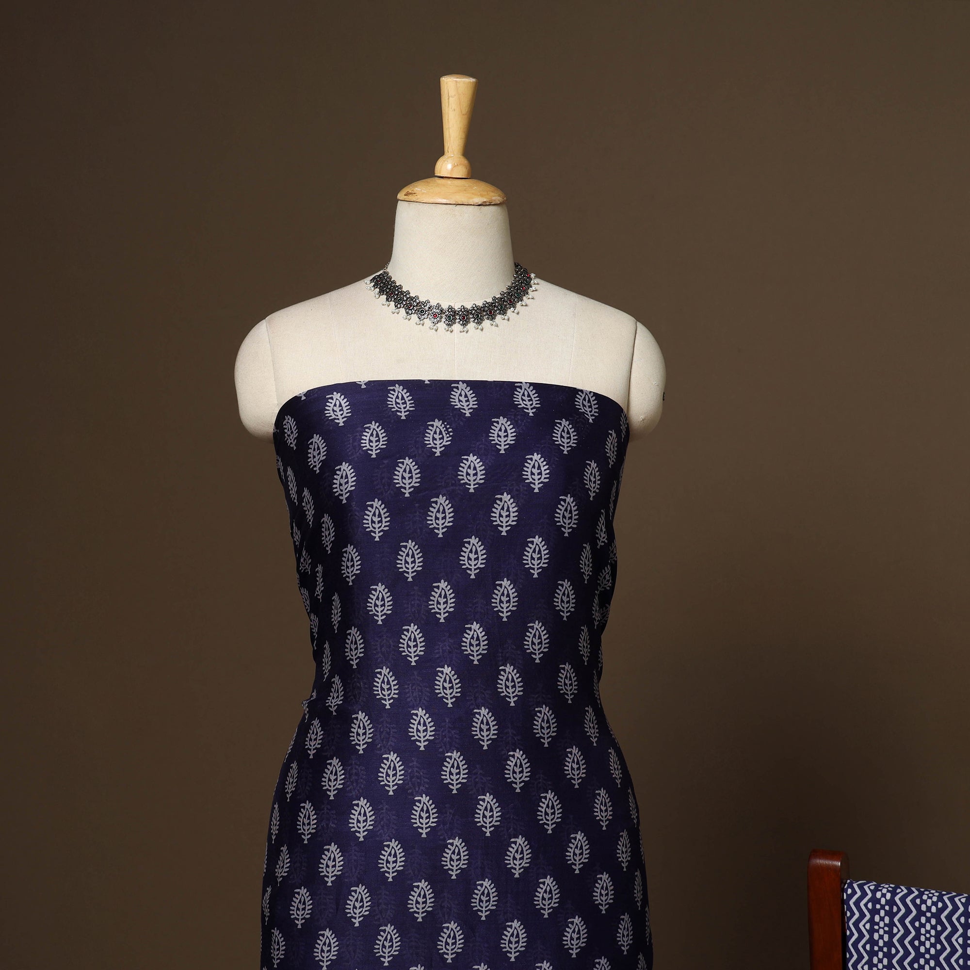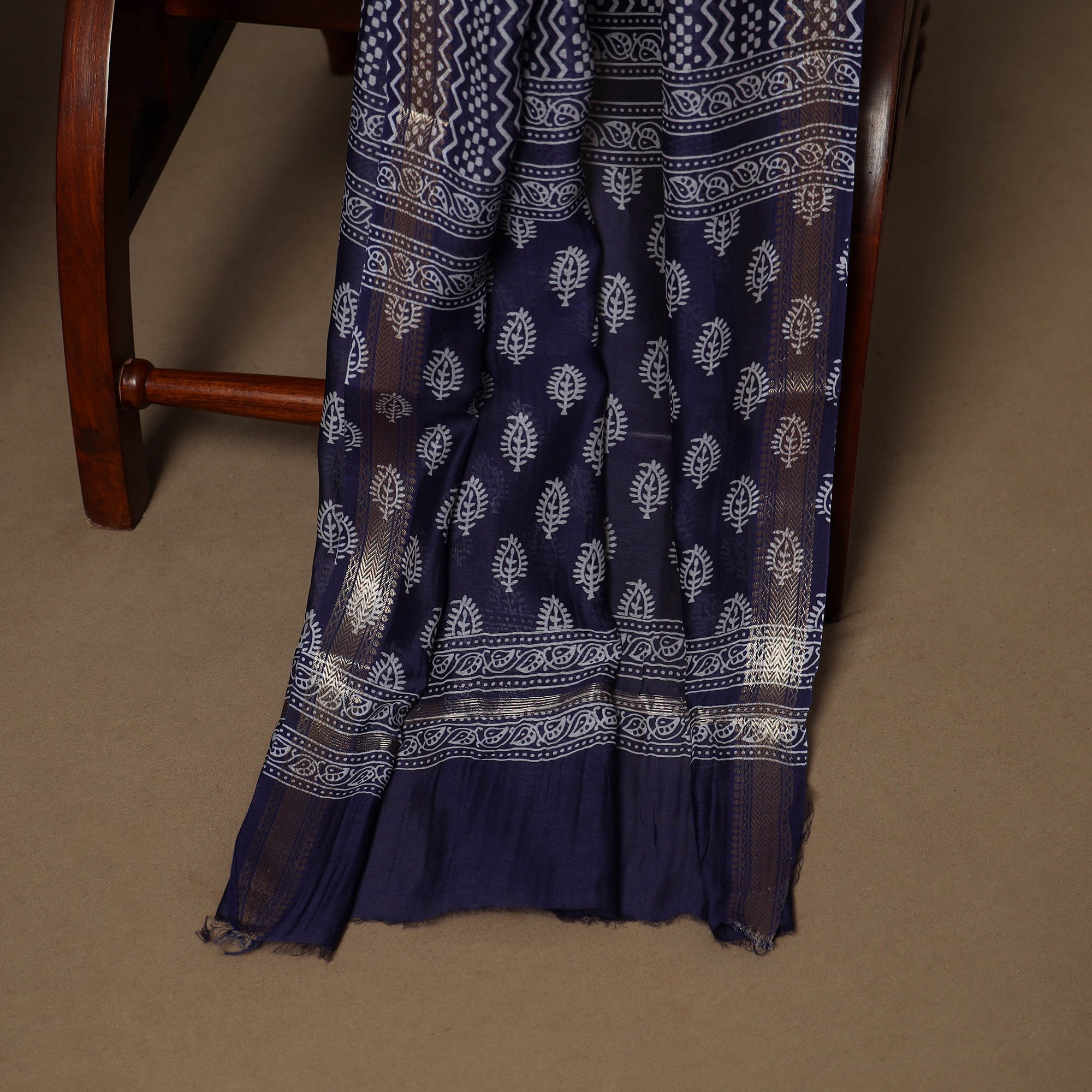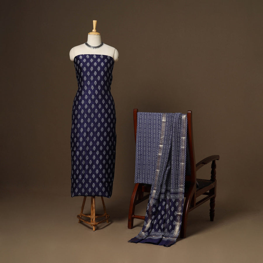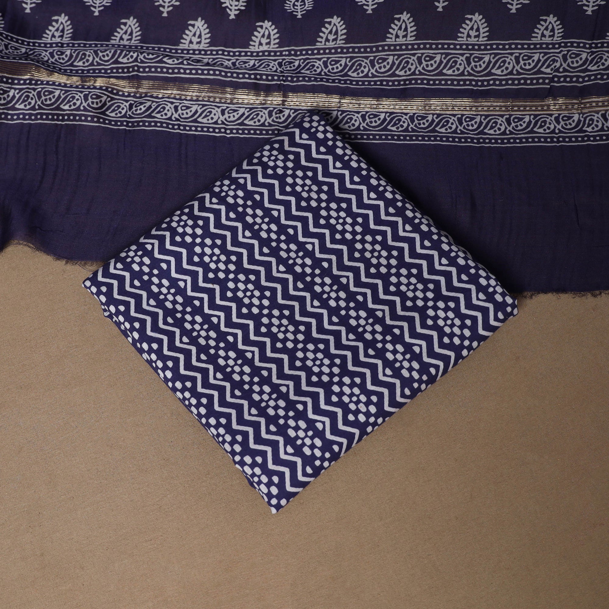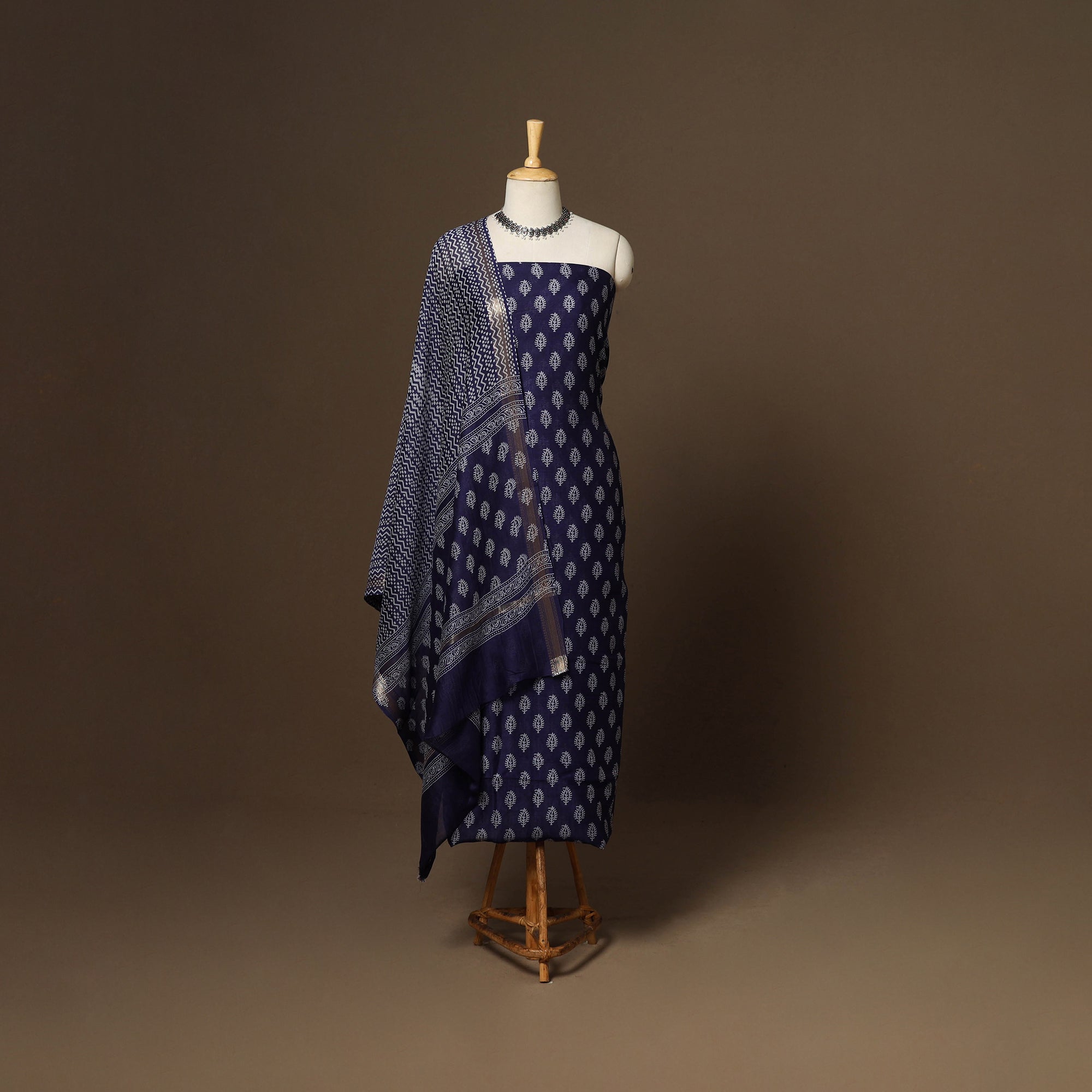 Blue 3pc bagru hand block print dress material with zari border is crafted from chanderi silk-cotton fabric and includes a kurta, a matching dupatta and a cotton bottom. Adorned with fine motifs from Rajasthan, each piece is made using the traditional hand block printing technique, where artisans use hand-carved wooden blocks dipped in natural dyes to imprint intricate designs perfect for festive and everyday elegance.