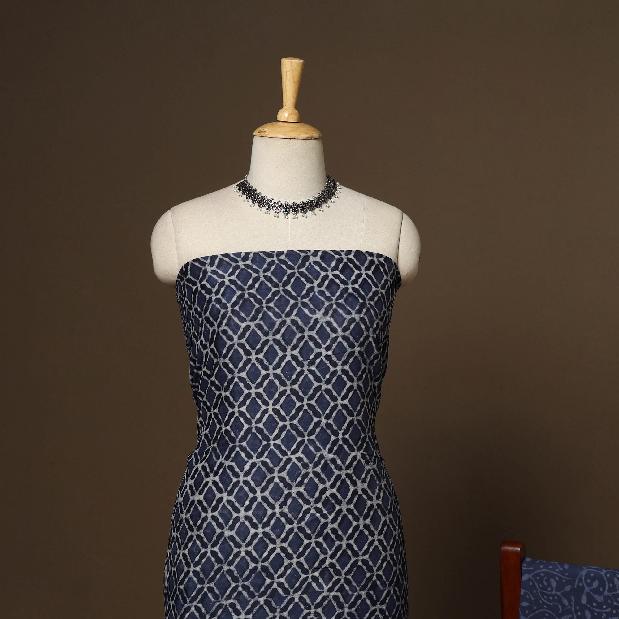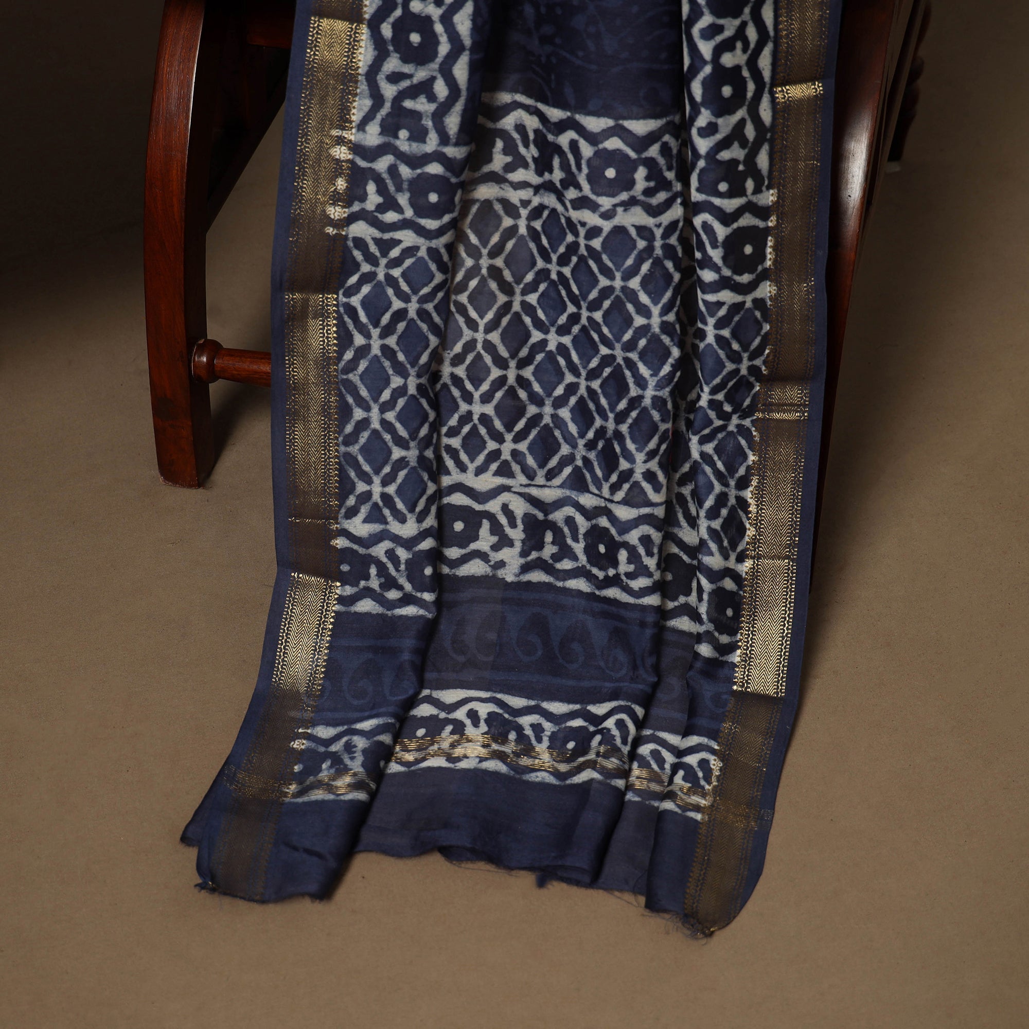 Blue 3pc bagru hand block print dress material with zari border is crafted from chanderi silk-cotton fabric and includes a kurta, a matching dupatta and a cotton bottom. Adorned with fine motifs from Rajasthan, each piece is made using the traditional hand block printing technique, where artisans use hand-carved wooden blocks dipped in natural dyes to imprint intricate designs perfect for festive and everyday elegance.