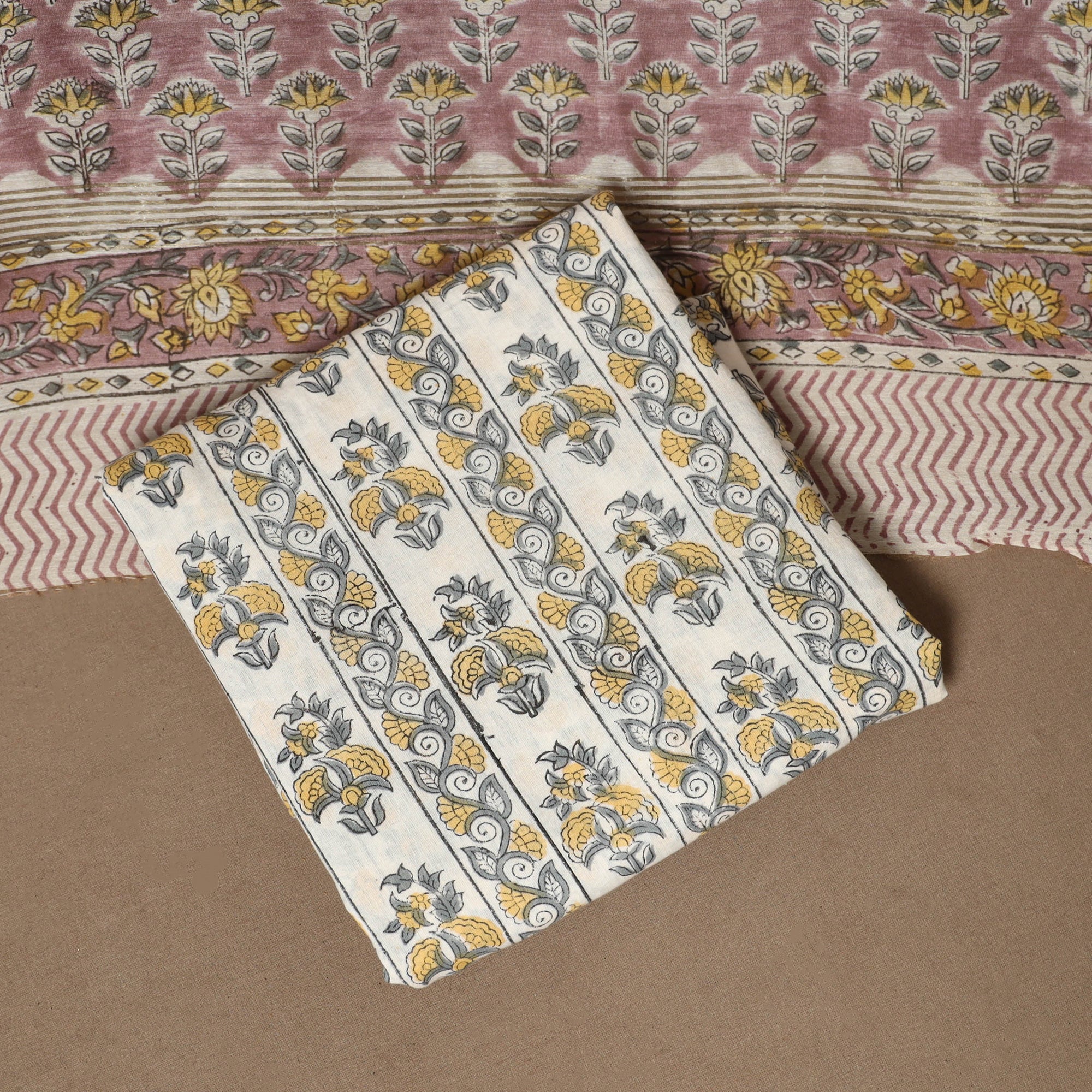 This pink 3pc sanganeri print dress material with zari border is crafted from maheshwari silk-cotton fabric and includes a kurta, a matching dupatta, and a cotton bottom. Adorned with fine floral motifs from Rajasthan, each piece is created using the traditional hand block printing technique, where artisans use hand-carved wooden blocks dipped in vat dyes to imprint intricate designs, perfect for both festive occasions and everyday elegance.
