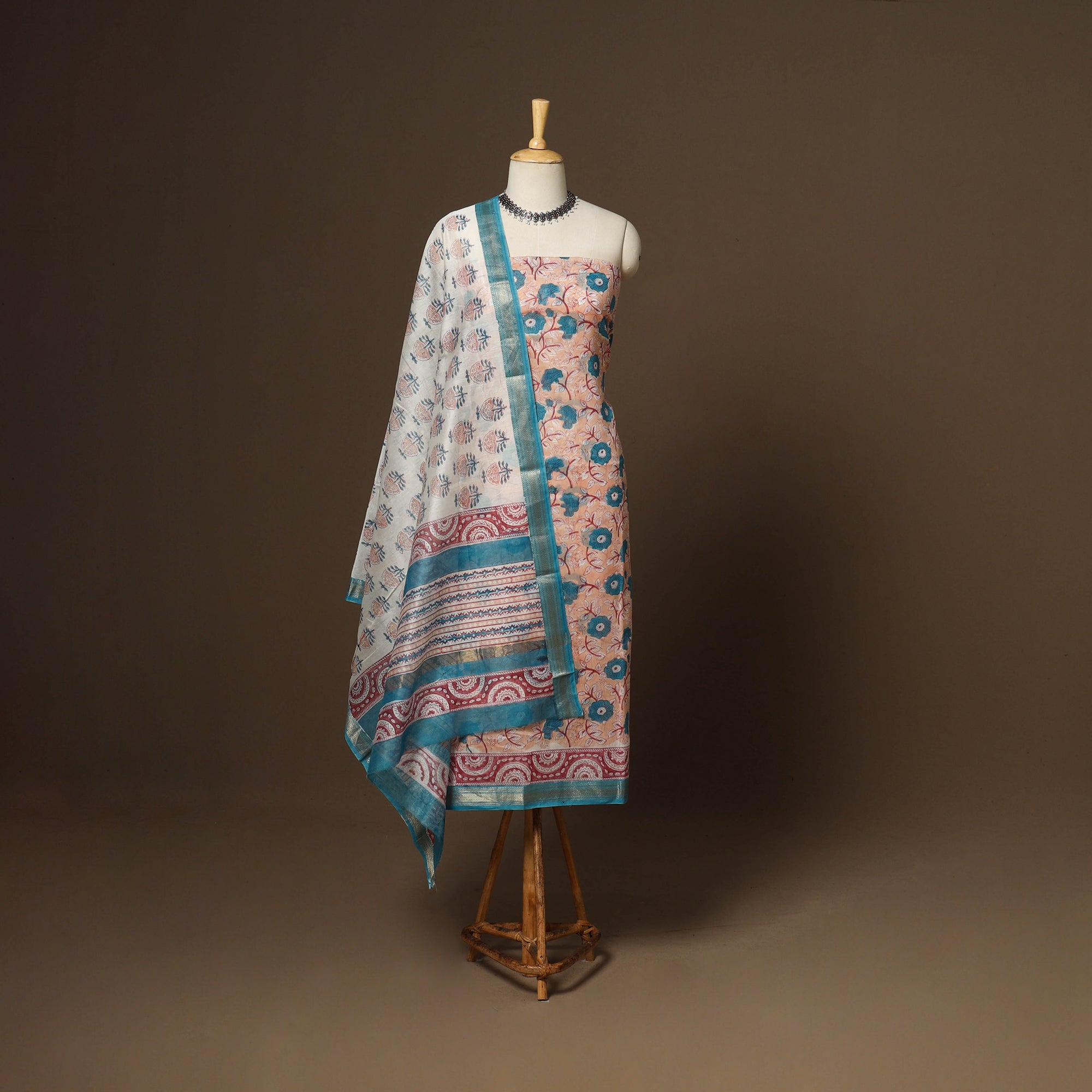 This pink 3pc sanganeri print dress material with zari border is crafted from maheshwari silk-cotton fabric and includes a kurta, a matching dupatta, and a cotton bottom. Adorned with fine floral motifs from Rajasthan, each piece is created using the traditional hand block printing technique, where artisans use hand-carved wooden blocks dipped in vat dyes to imprint intricate designs, perfect for both festive occasions and everyday elegance.