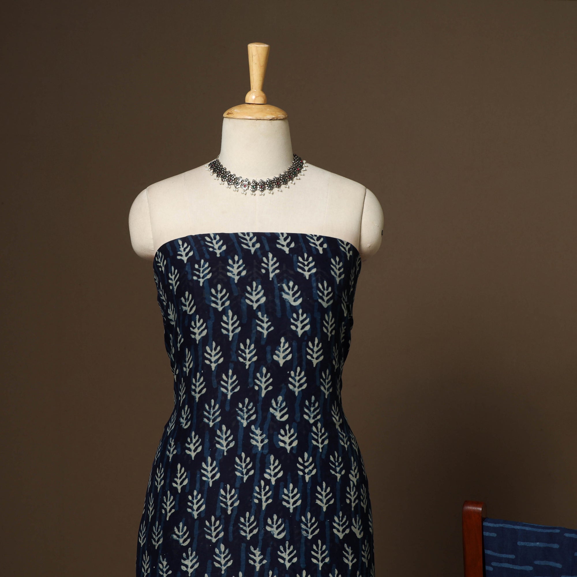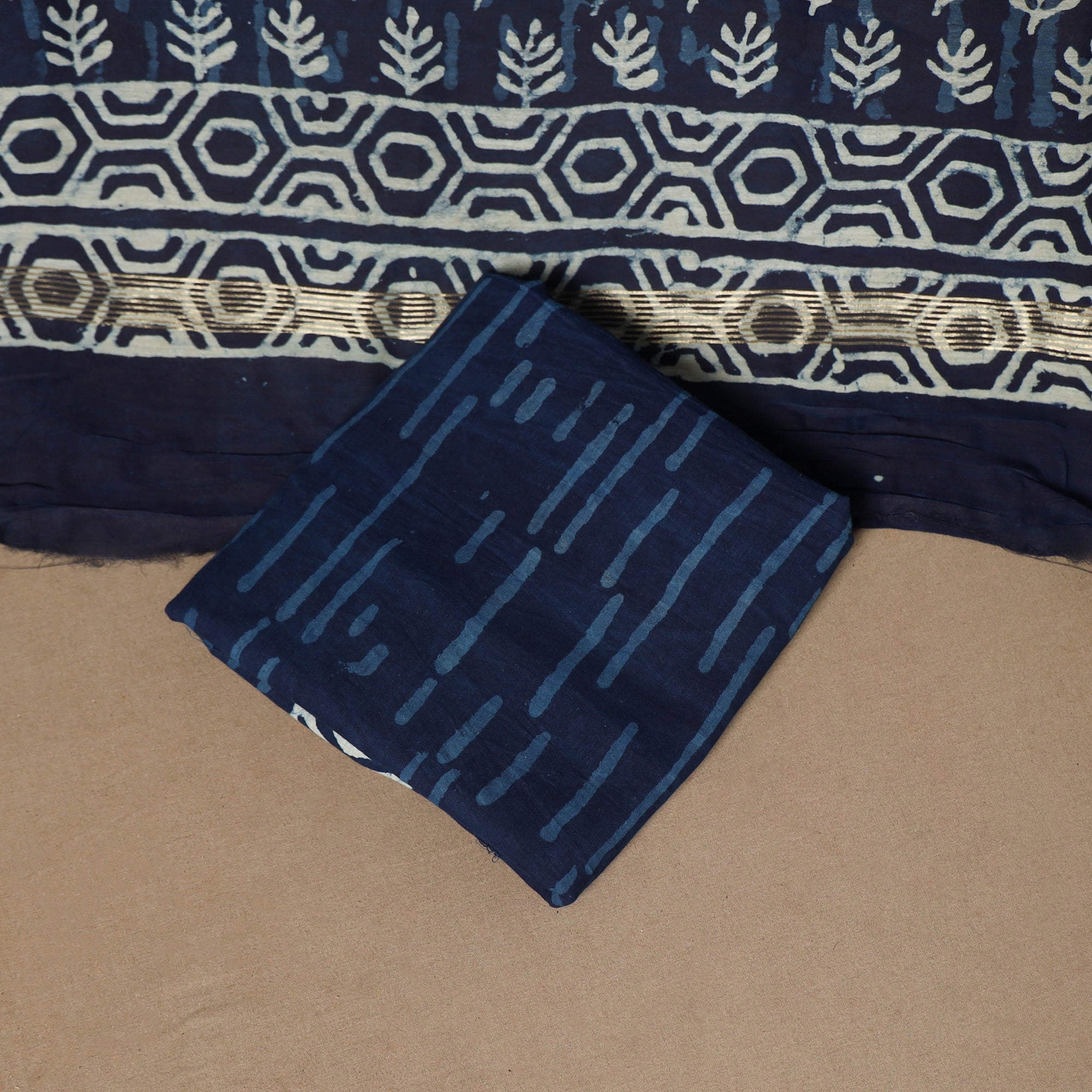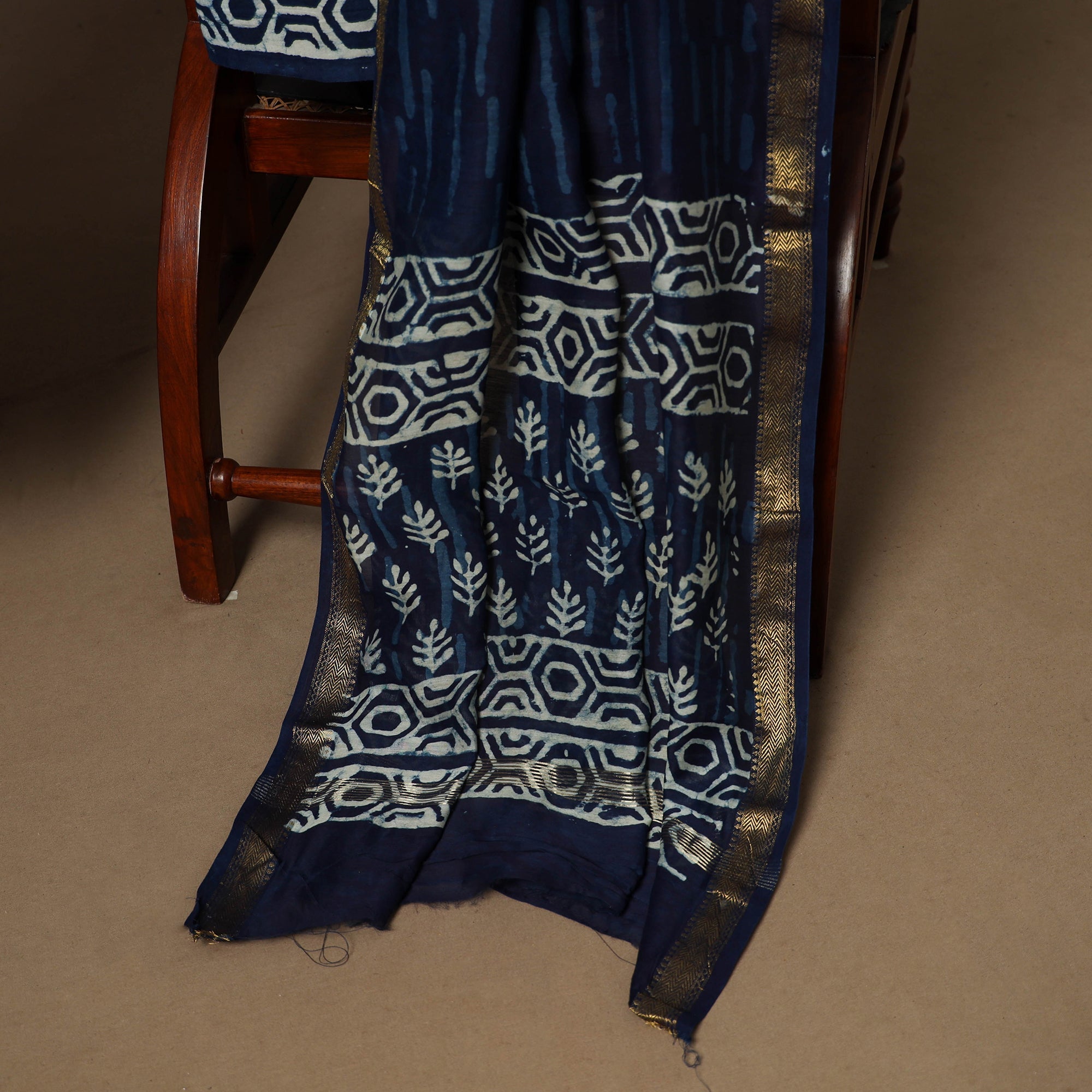 Blue 3pc indigo bagru hand block print dress material with zari border is crafted from chanderi silk-cotton fabric and includes a kurta, a matching dupatta and a cotton bottom. Adorned with fine motifs from Rajasthan, each piece is made using the traditional hand block printing technique, where artisans use hand-carved wooden blocks dipped in natural dyes to imprint intricate designs perfect for festive and everyday elegance.