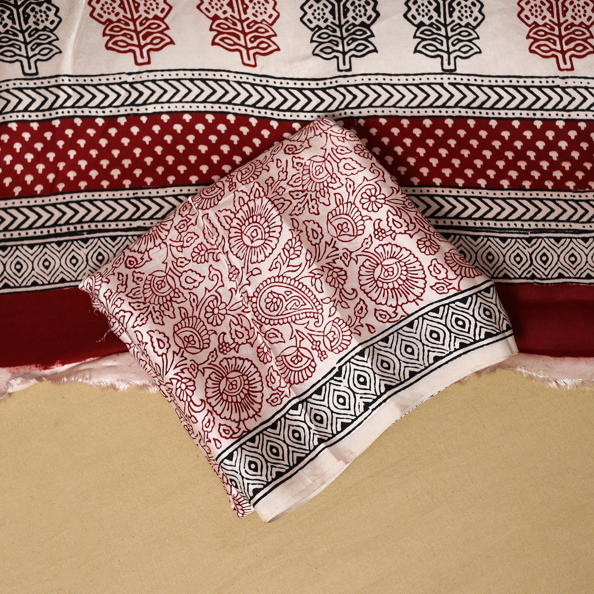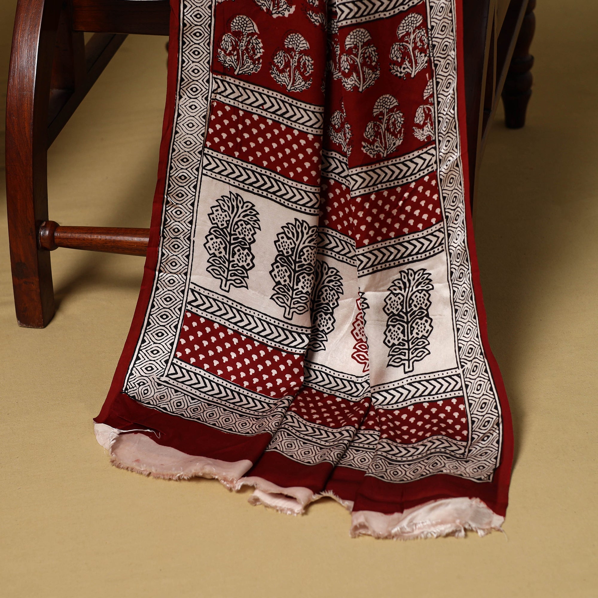 This red bagh hand block printed modal silk 3pc dress material is crafted using traditional techniques by master artisan Umar Faruk Khatri from Madhya Pradesh. The smooth and elegant modal silk fabric offers all-day comfort and effortless style, making it a perfect choice for both everyday wear and festive occasions.