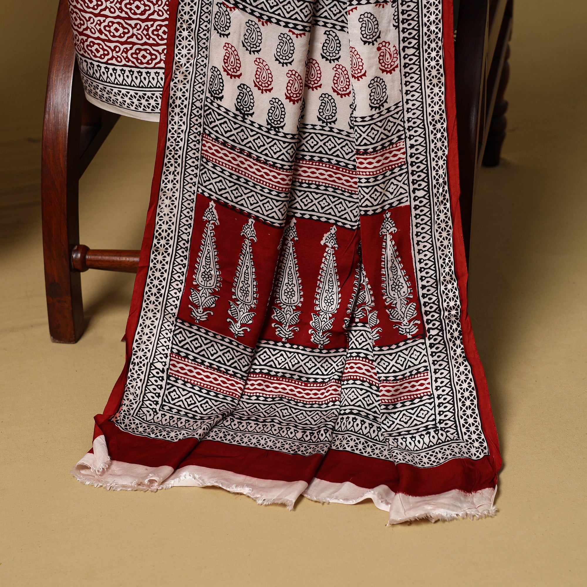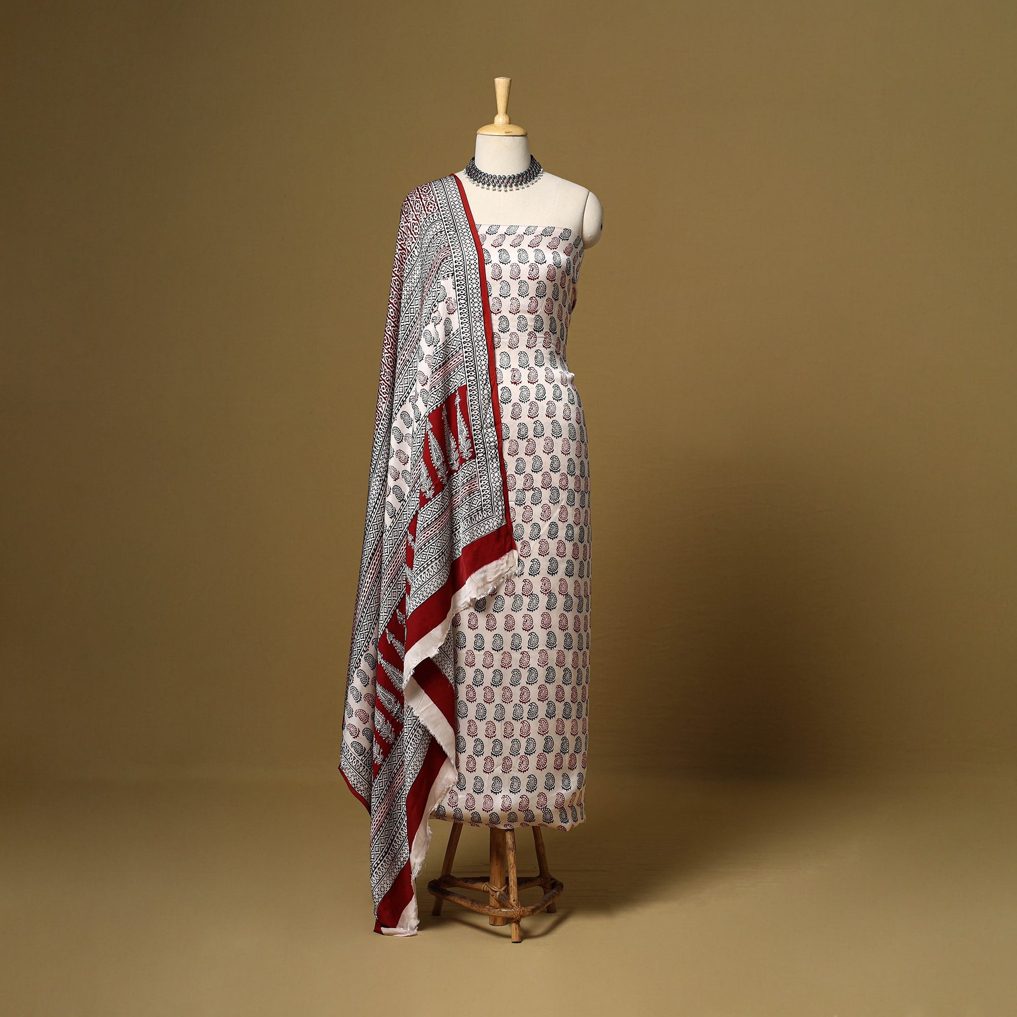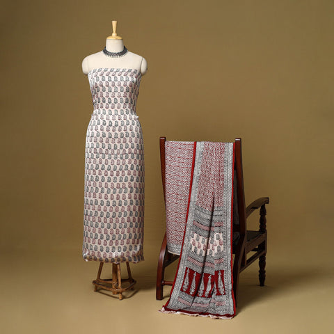 This bagh hand block printed modal silk 3pc dress material is crafted using traditional techniques by master artisan Umar Faruk Khatri from Madhya Pradesh. The smooth and elegant modal silk fabric offers all-day comfort and effortless style, making it a perfect choice for both everyday wear and festive occasions.