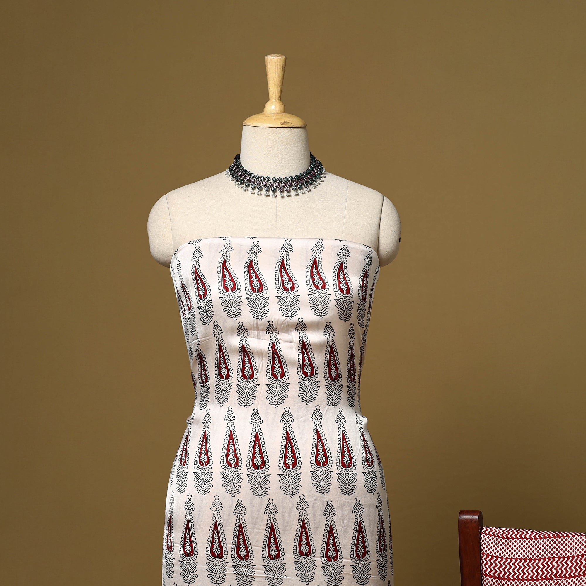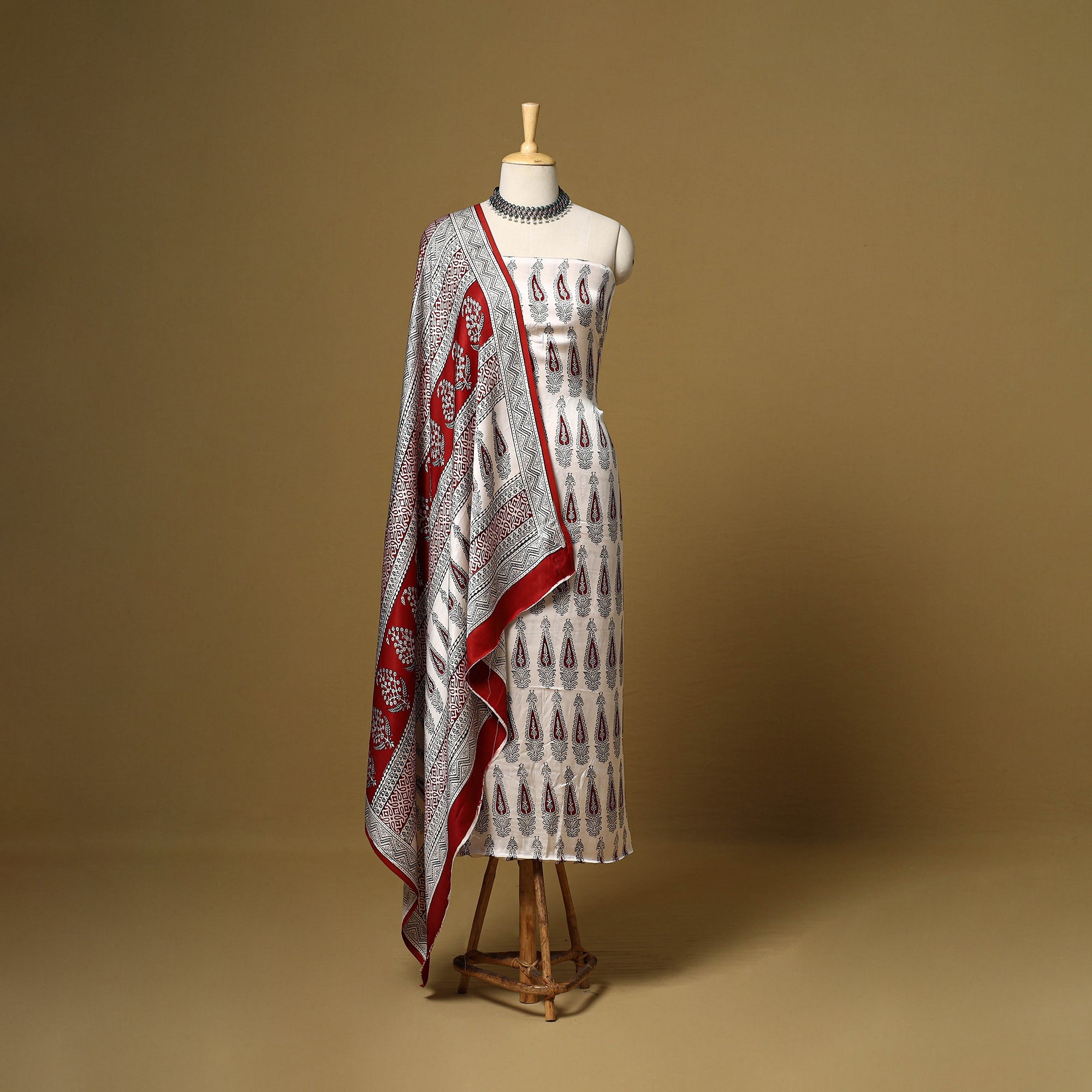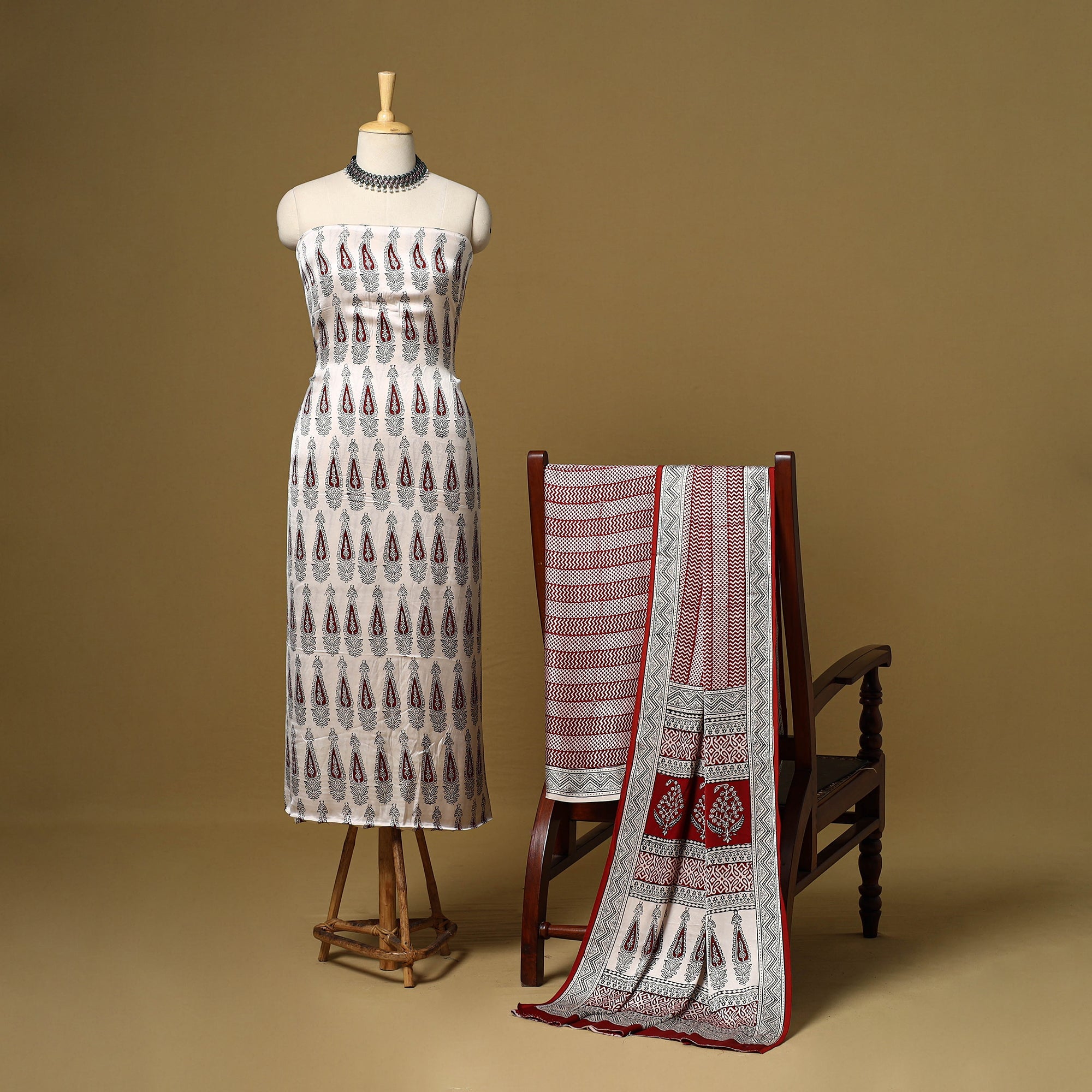 This bagh hand block printed modal silk 3pc dress material is crafted using traditional techniques by master artisan Umar Faruk Khatri from Madhya Pradesh. The smooth and elegant modal silk fabric offers all-day comfort and effortless style, making it a perfect choice for both everyday wear and festive occasions.