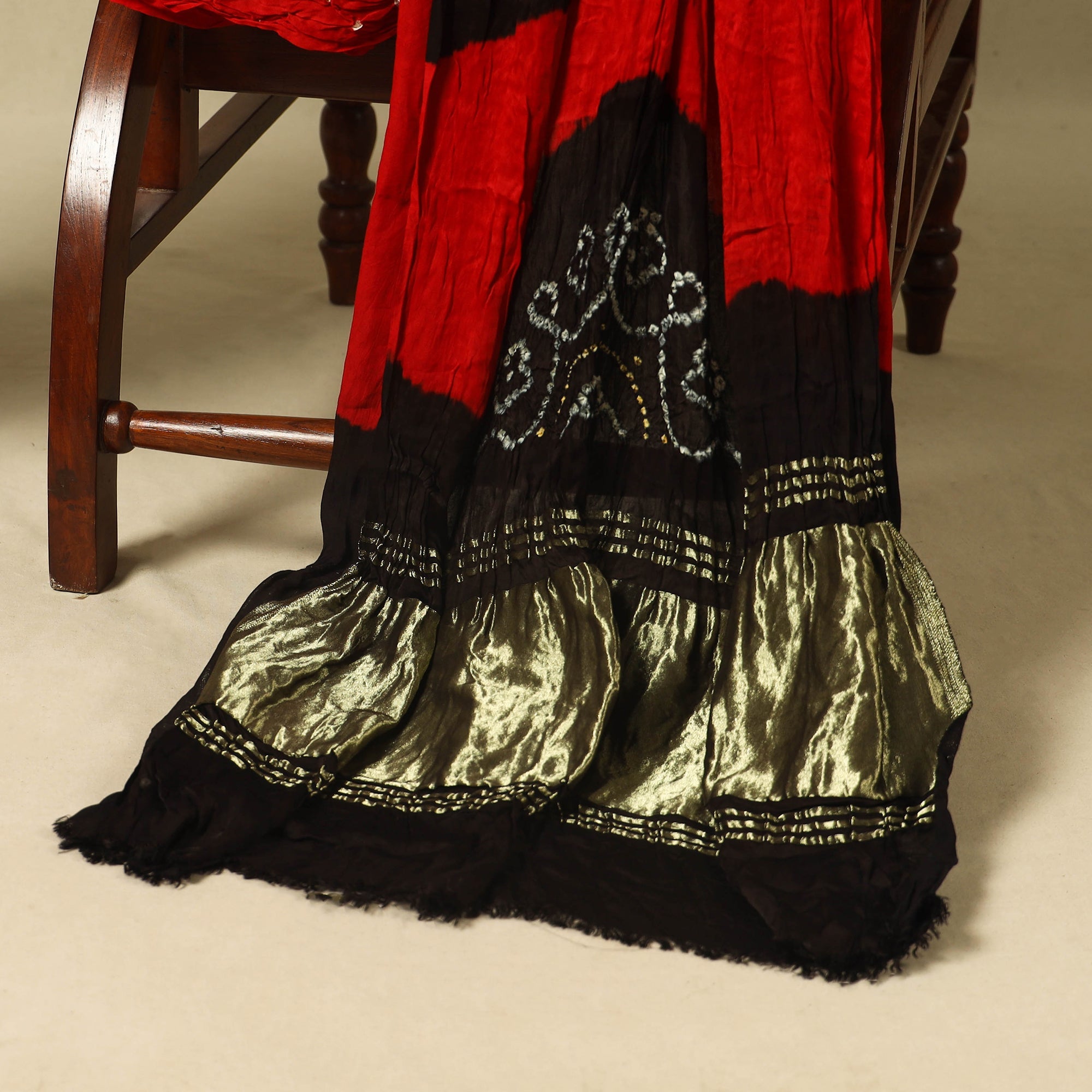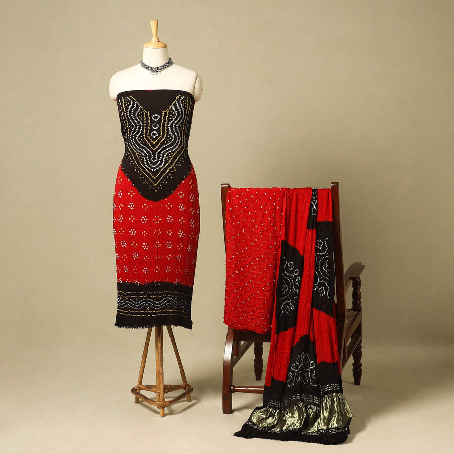This red 3pc unstitched kutch bandhani dress material set is crafted from soft modal silk. It includes fabric for the kurta, matching bottom, and a dupatta featuring the traditional lagdi patta design. Each piece is meticulously tied & dyed by skilled artisans from Kutch, showcasing the intricate beauty of bandhani work. Ideal for festive occasions or elegant ethnic wear, it perfectly blends tradition with timeless style.