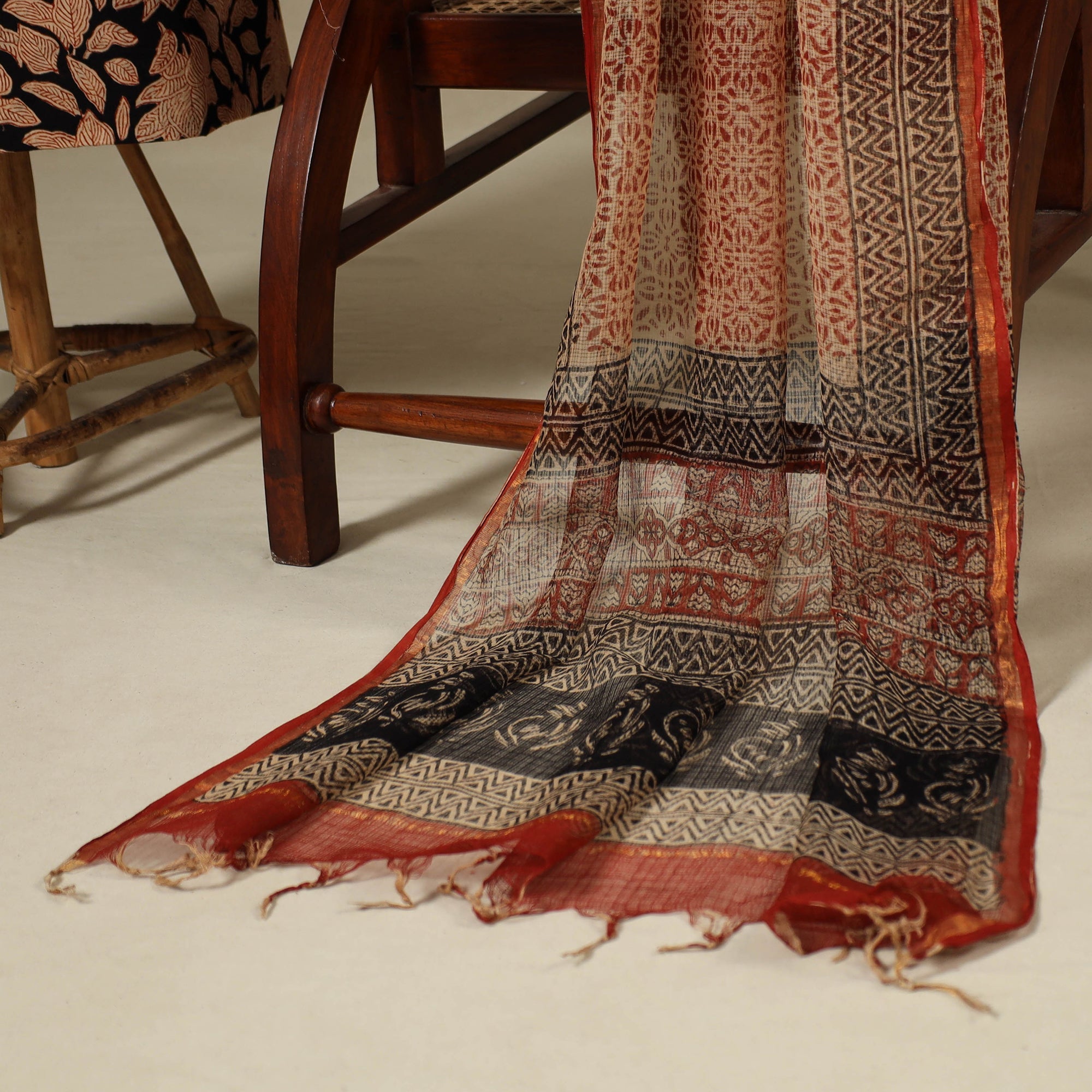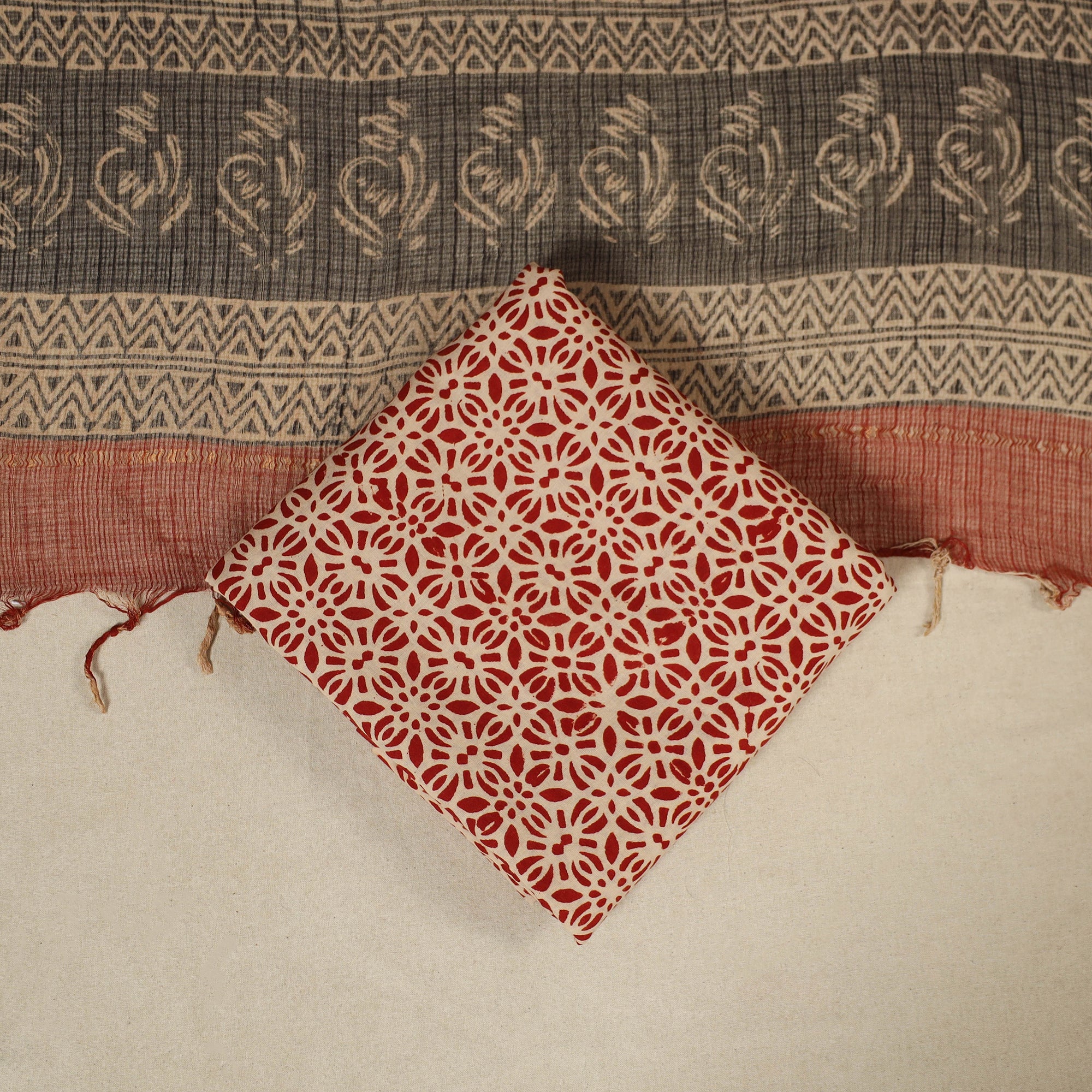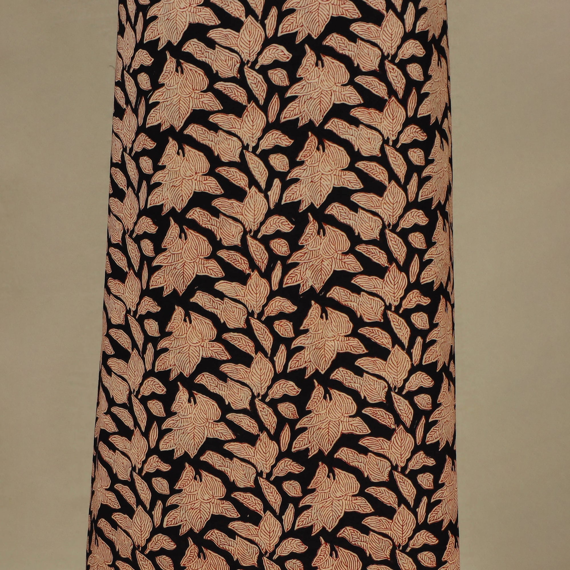 Take a piece of Rajasthan home with this beautiful black bagru dress material. Hand block printed using the traditional mud-resist technique and dyed with natural colours, this 3pc cotton suit set includes fabric for the kurta, bottom, and a kota doria dupatta. The dupatta is finished with a subtle zari border that adds a graceful charm. The intricate motifs, crafted by skilled artisans, reflect the charm of timeless craftsmanship. Ideal for those who appreciate ethnic styles woven with stories that speak of heritage and artistry.