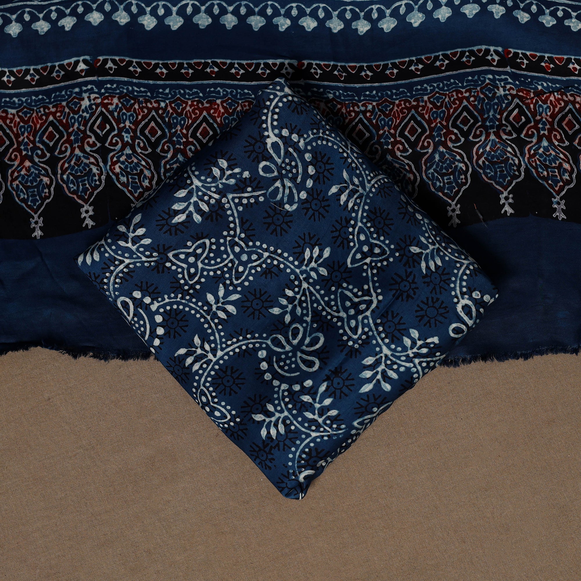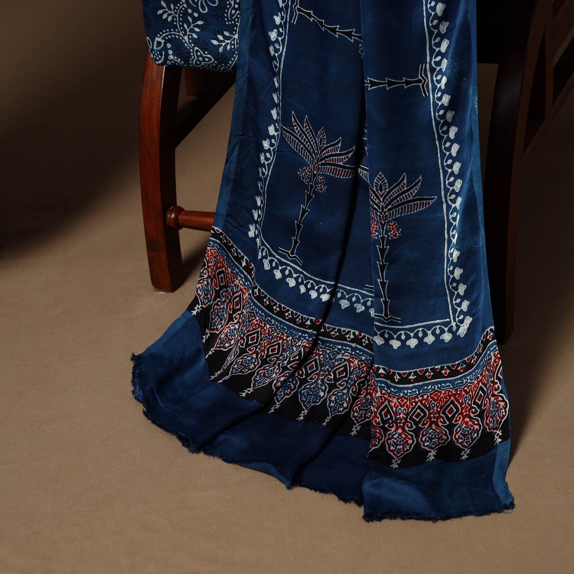 This blue modal silk ajrakh 3pc unstitched dress material set includes fabric for a kurta, bottom, and a dupatta. Showcasing traditional block prints with natural dyes, it reflects centuries-old artistry while blending seamlessly into modern wardrobes. Ideal for festive occasions or everyday styling, this ajrakh print dress material offers comfort with a touch of cultural elegance.
