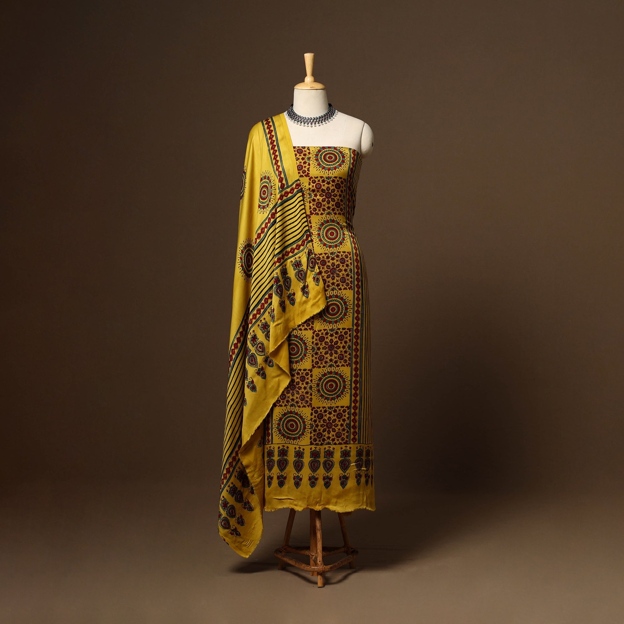 This yellow modal silk ajrakh 3pc unstitched dress material set includes fabric for a kurta, bottom, and a dupatta. Showcasing traditional block prints with natural dyes, it reflects centuries-old artistry while blending seamlessly into modern wardrobes. Ideal for festive occasions or everyday styling, this ajrakh print dress material offers comfort with a touch of cultural elegance.