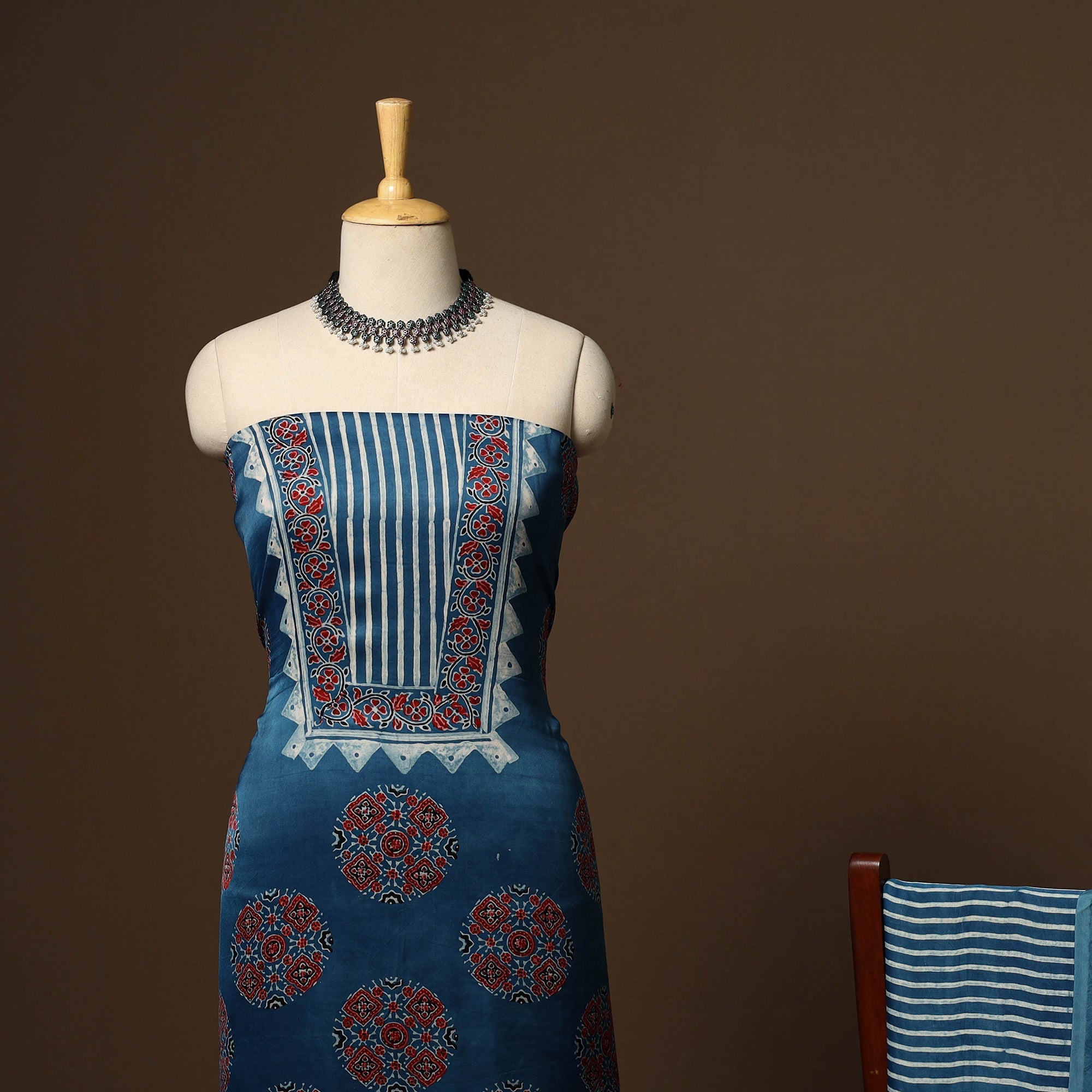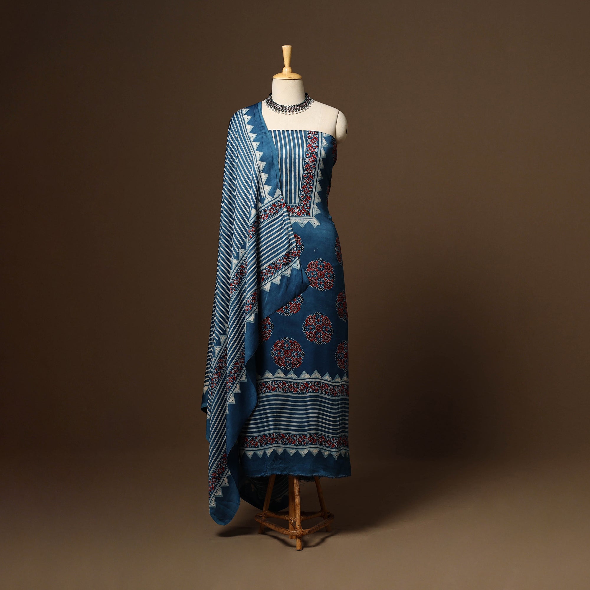 This blue modal silk ajrakh 3pc unstitched dress material set includes fabric for a kurta, bottom, and a dupatta. Showcasing traditional block prints with natural dyes, it reflects centuries-old artistry while blending seamlessly into modern wardrobes. Ideal for festive occasions or everyday styling, this ajrakh print dress material offers comfort with a touch of cultural elegance.