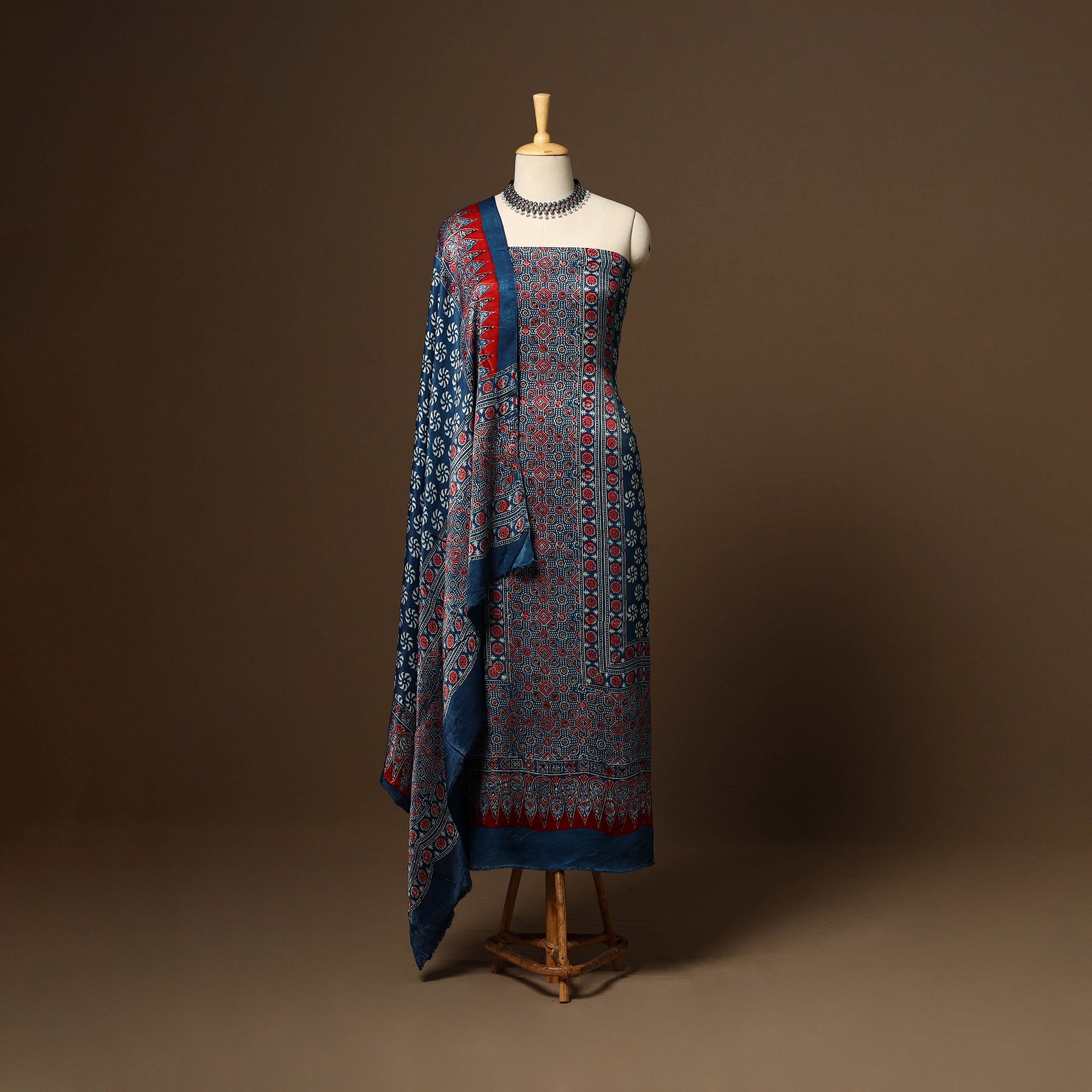 This blue modal silk ajrakh 3pc unstitched dress material set includes fabric for a kurta, bottom, and a dupatta. Showcasing traditional block prints with natural dyes, it reflects centuries-old artistry while blending seamlessly into modern wardrobes. Ideal for festive occasions or everyday styling, this ajrakh print dress material offers comfort with a touch of cultural elegance.