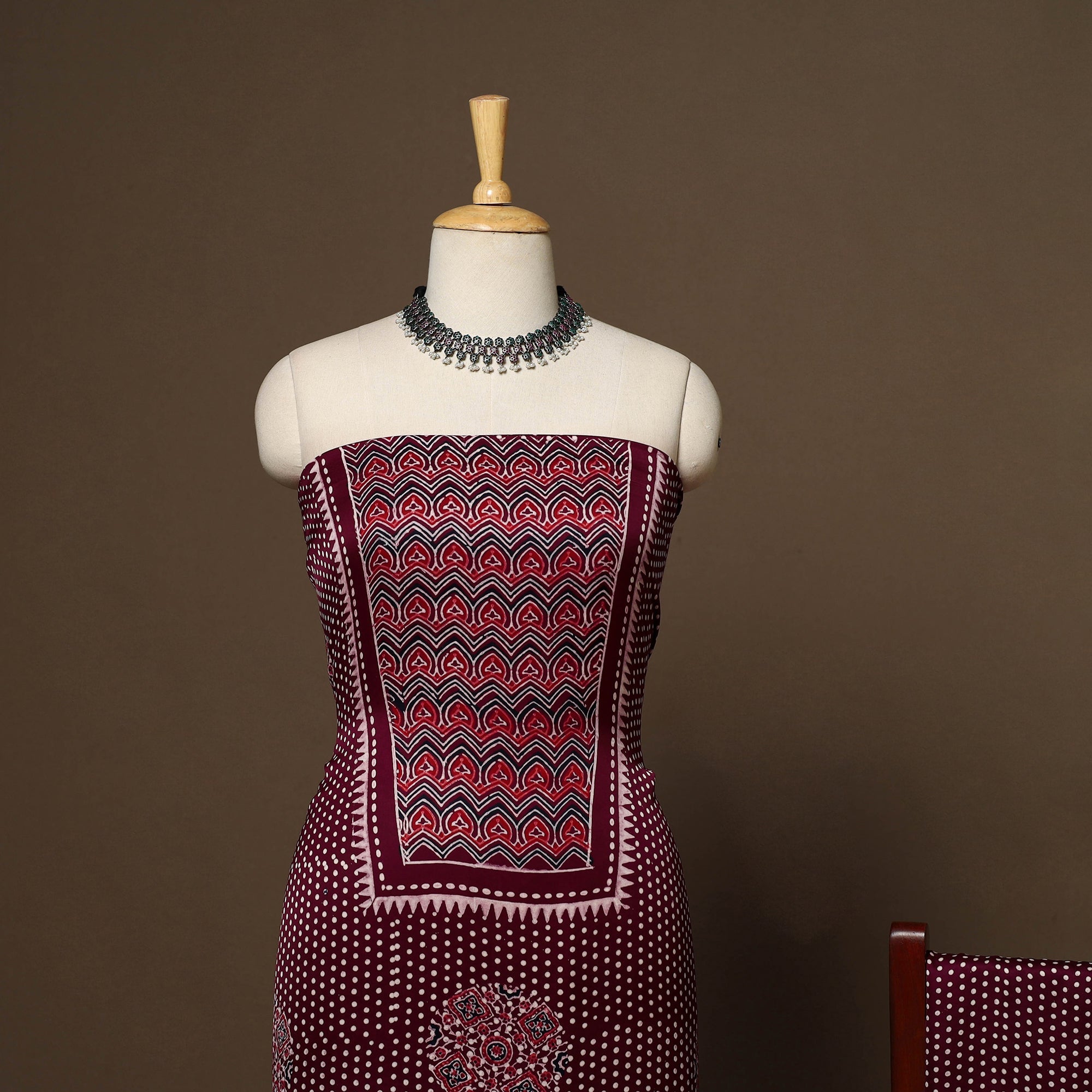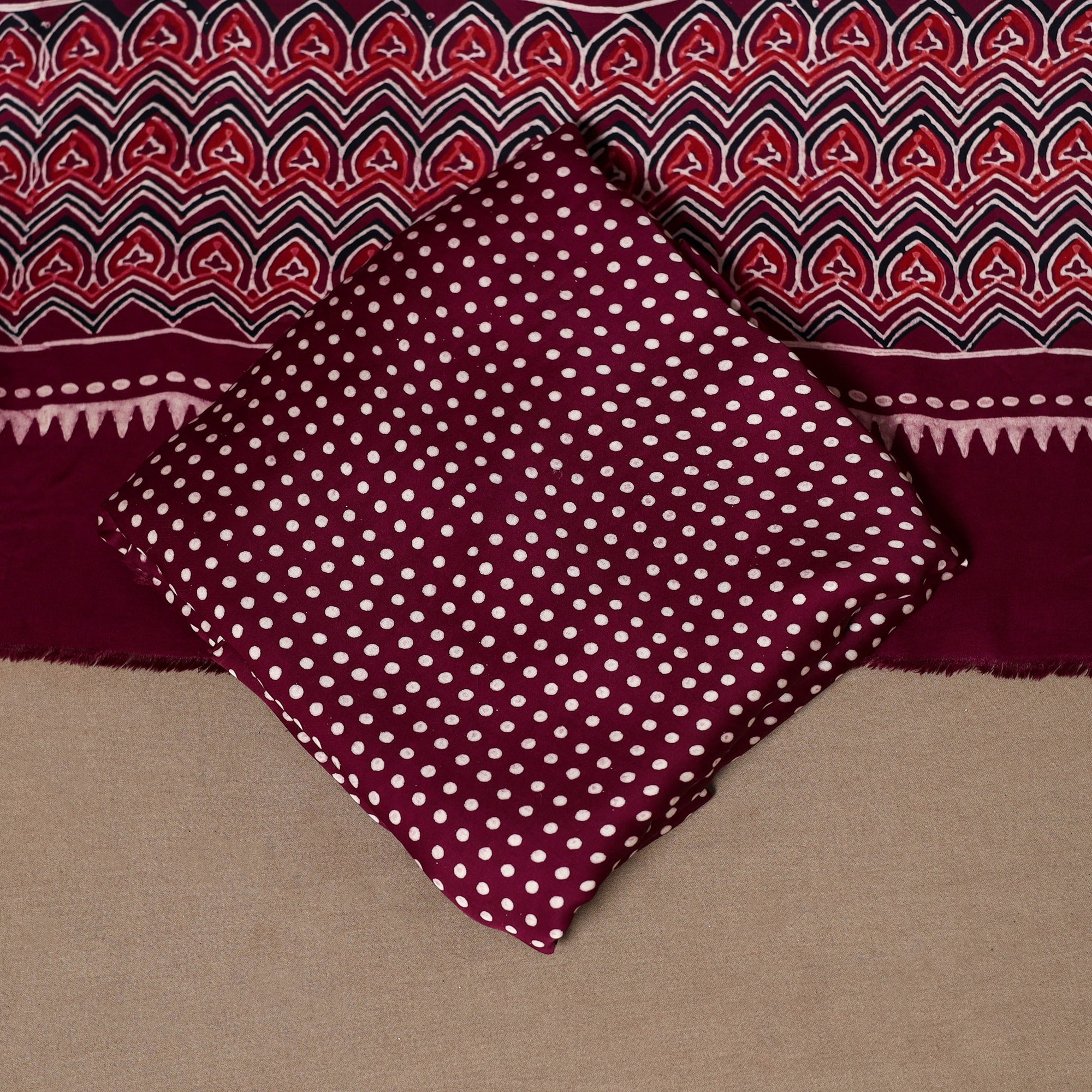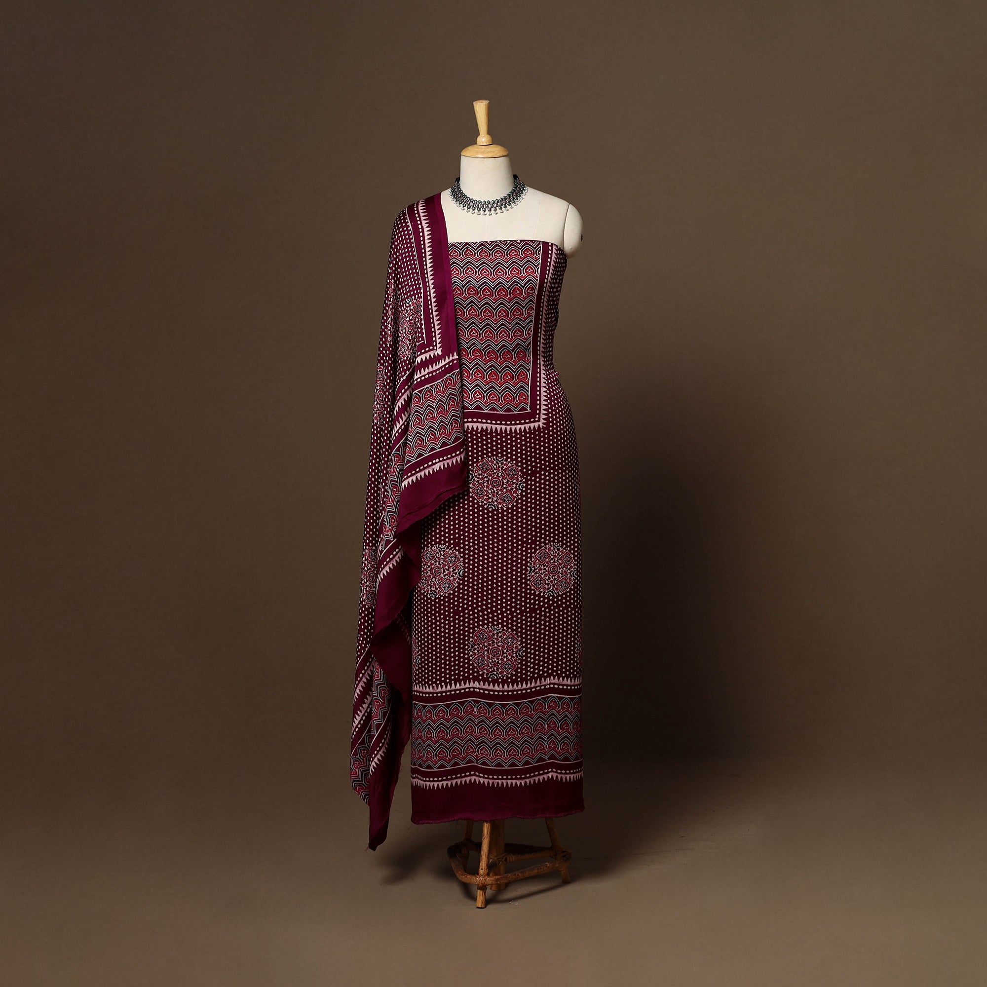 This modal silk ajrakh 3pc unstitched dress material set includes fabric for a kurta, bottom, and a dupatta. Showcasing traditional block prints with natural dyes, it reflects centuries-old artistry while blending seamlessly into modern wardrobes. Ideal for festive occasions or everyday styling, this ajrakh print dress material offers comfort with a touch of cultural elegance.