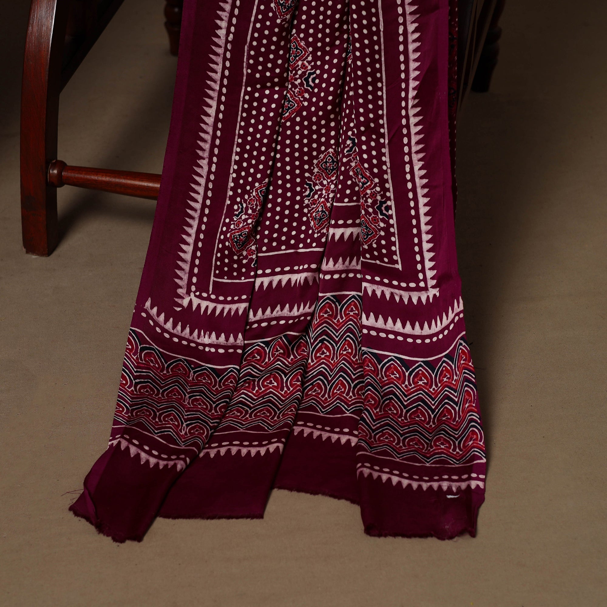Ajrakh is a well-known traditional vegetable dyeing that resists block-printing techniques on cloth. Originated in Kutch, It is nearly around 4,500 years old practised by Khatri community of Kutch and Sikh.