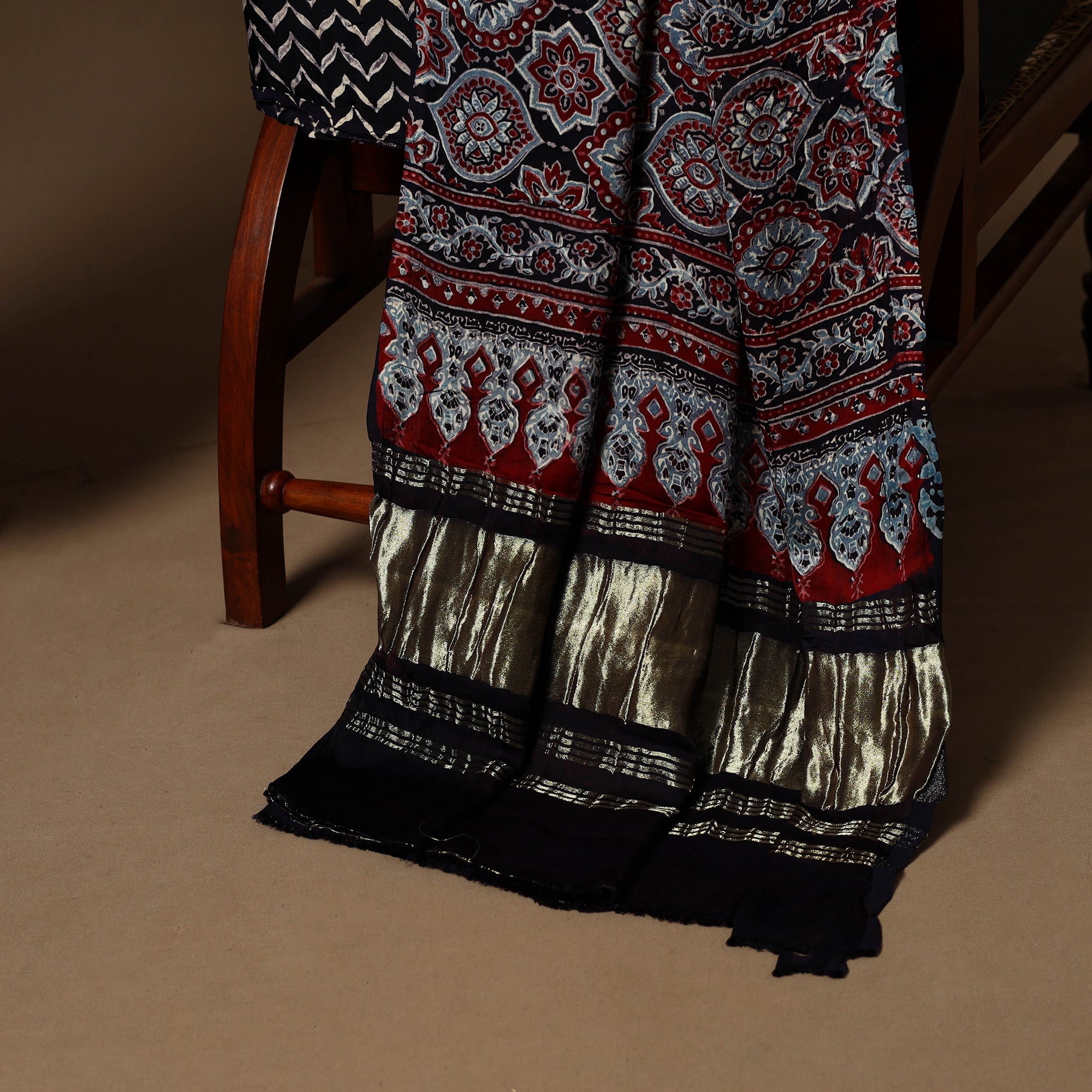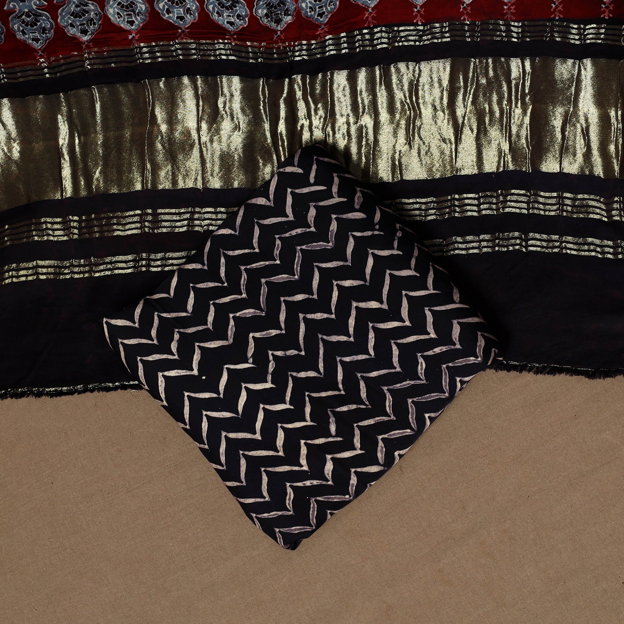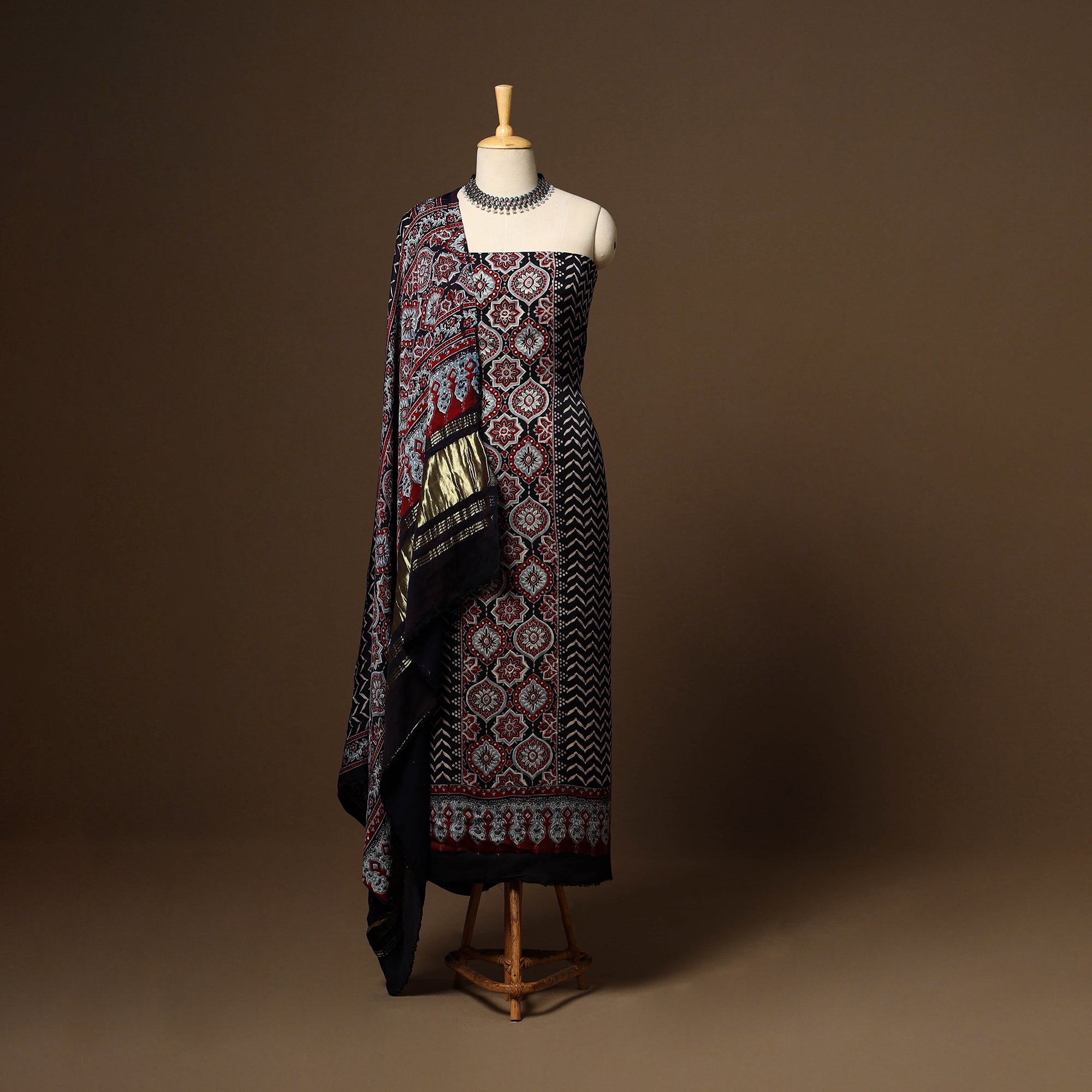 This black modal silk ajrakh 3pc unstitched dress material set includes fabric for a kurta, bottom, and a lagdi patta dupatta. Showcasing traditional block prints with natural dyes, it reflects centuries-old artistry while blending seamlessly into modern wardrobes. Ideal for festive occasions or everyday styling, this ajrak print dress material offers comfort with a touch of cultural elegance.