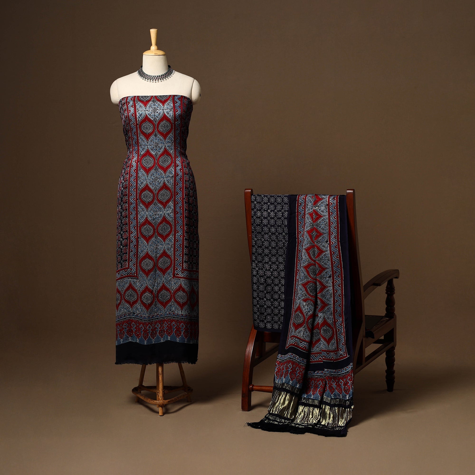 This black modal silk ajrakh 3pc unstitched dress material set includes fabric for a kurta, bottom, and a lagdi patta dupatta. Showcasing traditional block prints with natural dyes, it reflects centuries-old artistry while blending seamlessly into modern wardrobes. Ideal for festive occasions or everyday styling, this ajrak print dress material offers comfort with a touch of cultural elegance.