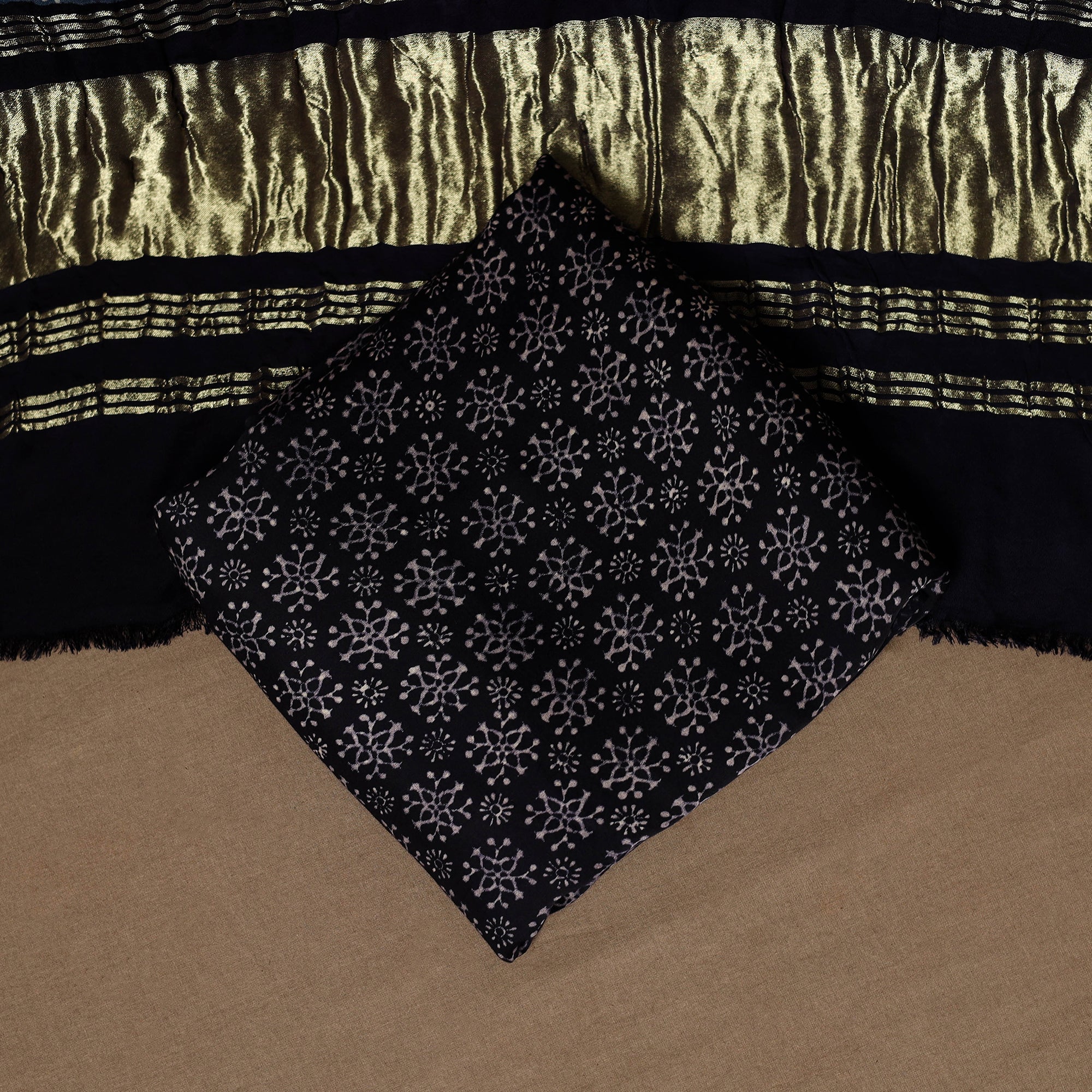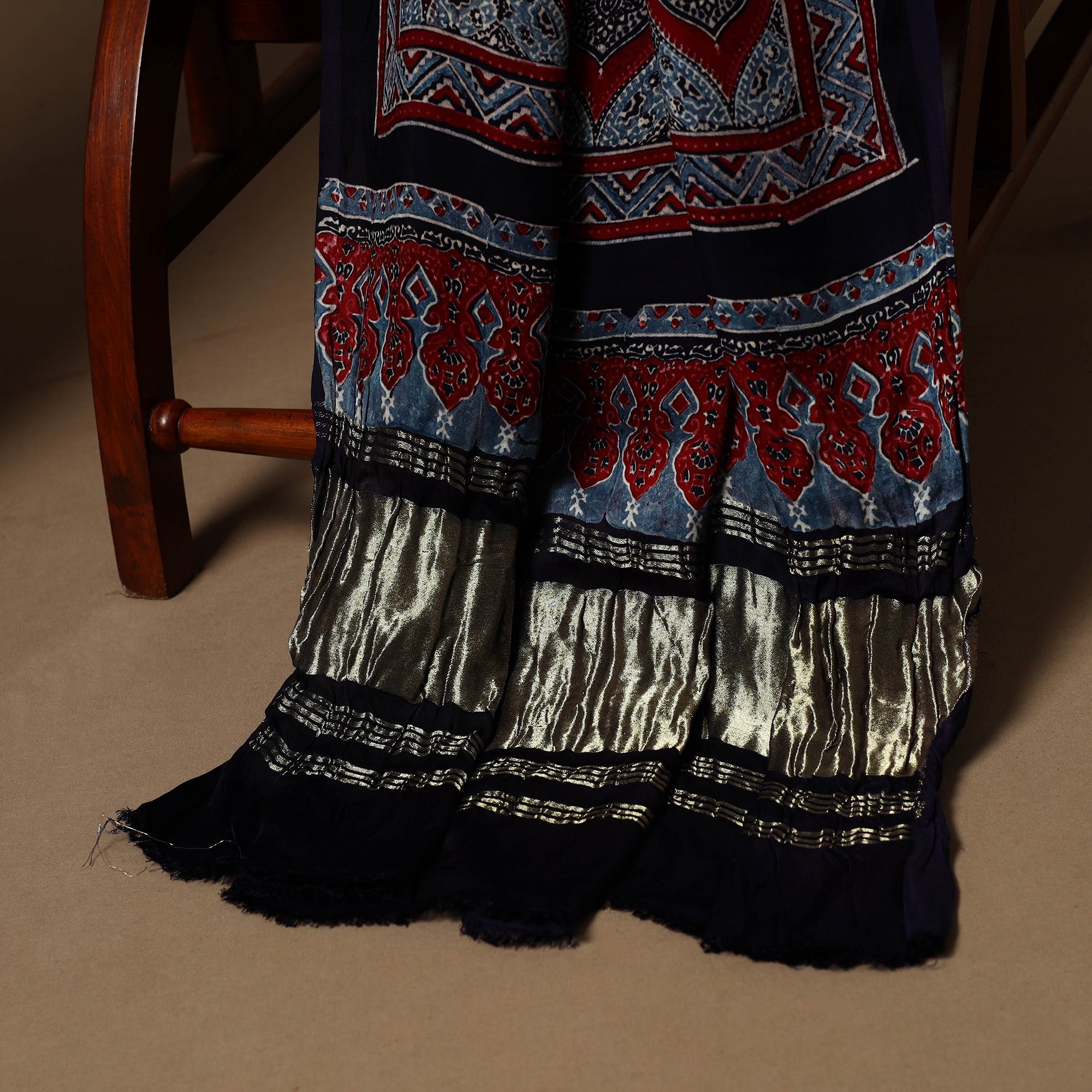 Ajrakh is a well-known traditional vegetable dyeing that resists block-printing techniques on cloth. Originated in Kutch, It is nearly around 4,500 years old practised by Khatri community of Kutch and Sikh.