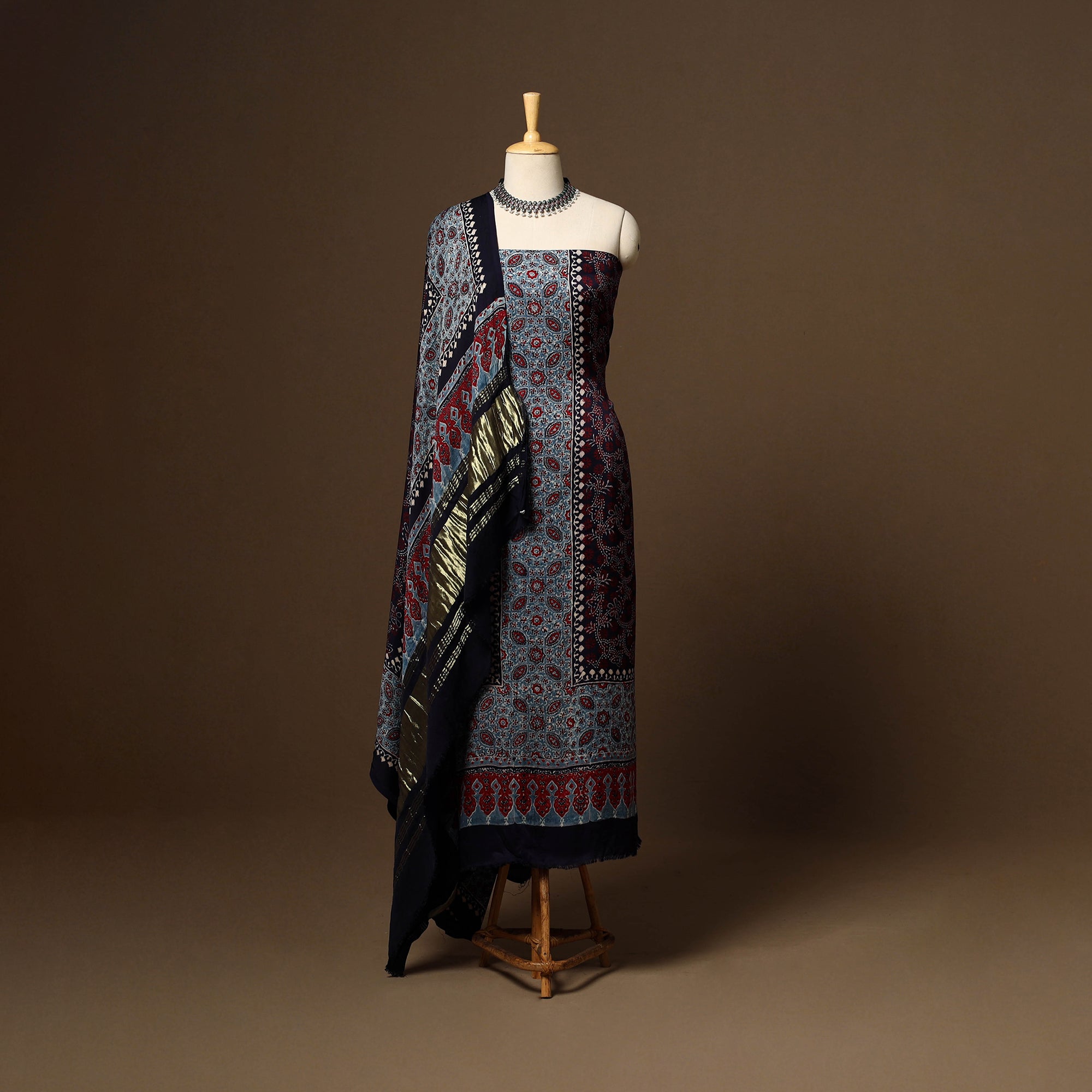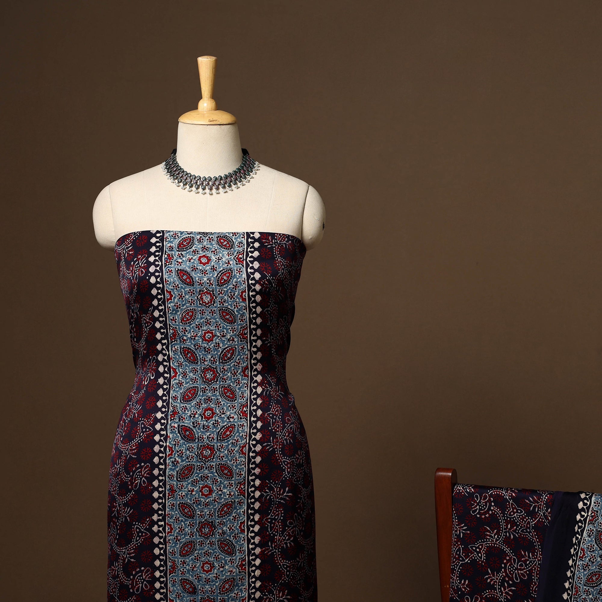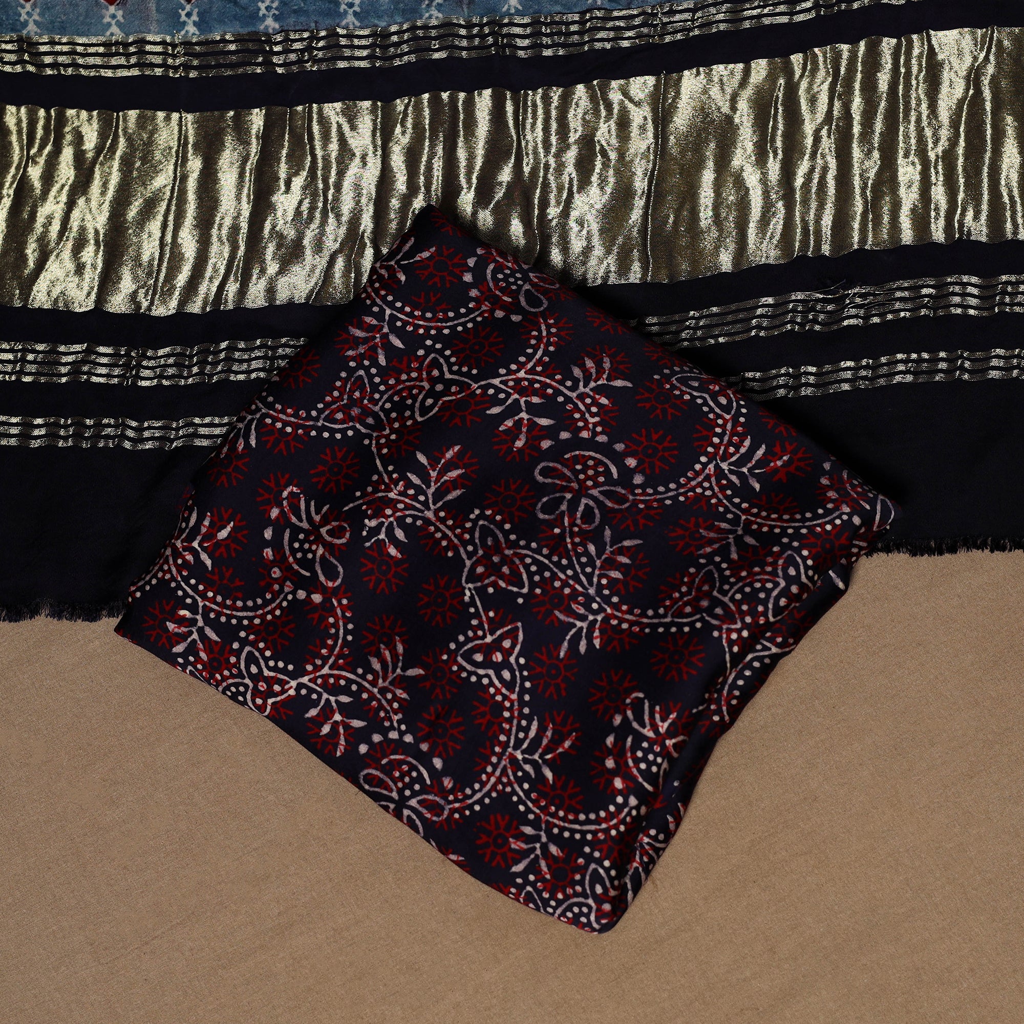 This black modal silk ajrakh 3pc unstitched dress material set includes fabric for a kurta, bottom, and a lagdi patta dupatta. Showcasing traditional block prints with natural dyes, it reflects centuries-old artistry while blending seamlessly into modern wardrobes. Ideal for festive occasions or everyday styling, this ajrak print dress material offers comfort with a touch of cultural elegance.