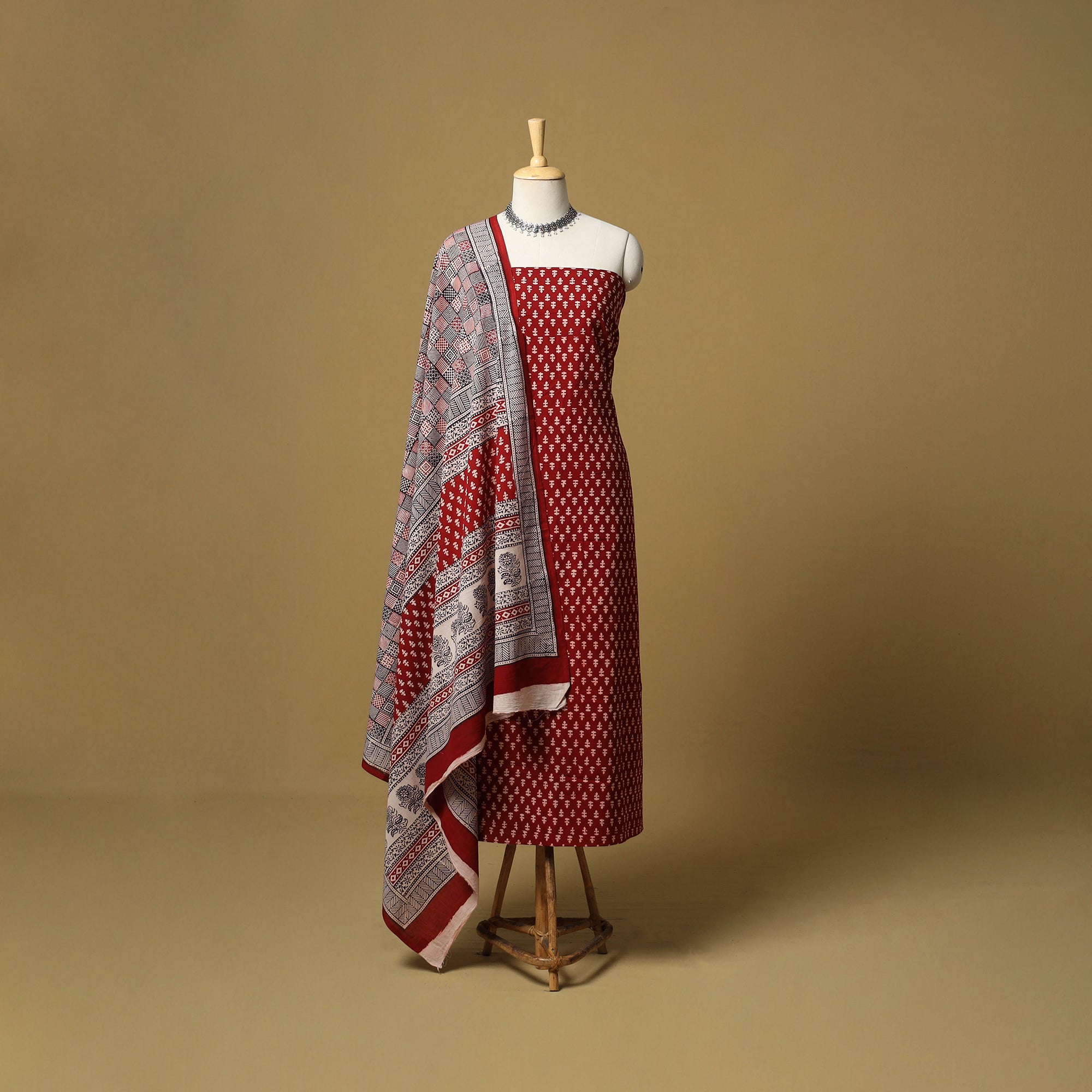 Elevate your wardrobe with this exquisite red 3pc natural dyed cotton bagh print suit material set. Crafted using traditional hand block printing by skilled artisans in Bagh, Madhya Pradesh. The intricate designs are made using natural dyes. The cotton fabric offers comfort, while the vibrant patterns add a timeless appeal.