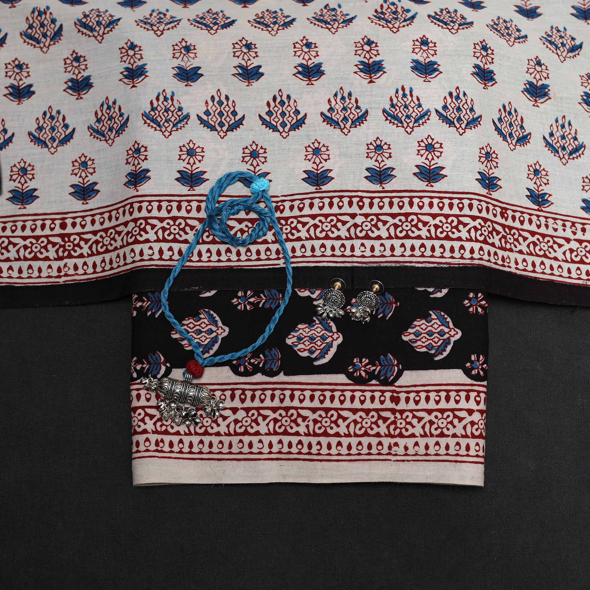 This black bagh hand block printed cotton 3pc suit material is crafted using natural dyes through traditional techniques by master artisan Umar Faruk Khatri from Madhya Pradesh. Crafted from soft and breathable cotton, it ensures all-day comfort and effortless style. The set also includes a matching necklace and earrings, making it a perfect choice for everyday wear and festive occasions.