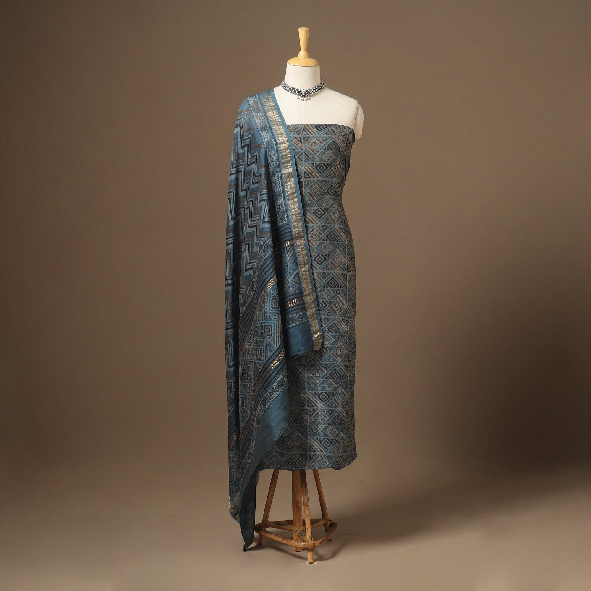 Elevate your wardrobe with this blue 3pc natural dyed maheshwari silk-cotton unstitched dress material, featuring Vanaspati Jahota block prints from Kutch, Gujarat. Known for its intricate detailing and use of natural dyes, this centuries-old craft reflects India’s rich textile legacy. The set includes a maheshwari silk kurta fabric, a beautifully printed dupatta, and a comfortable cotton bottom. Versatile, breathable, and elegant it’s ideal for all-day wear across seasons.