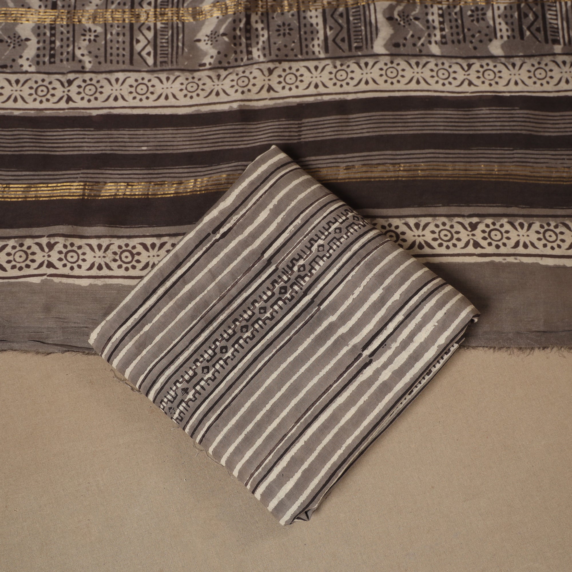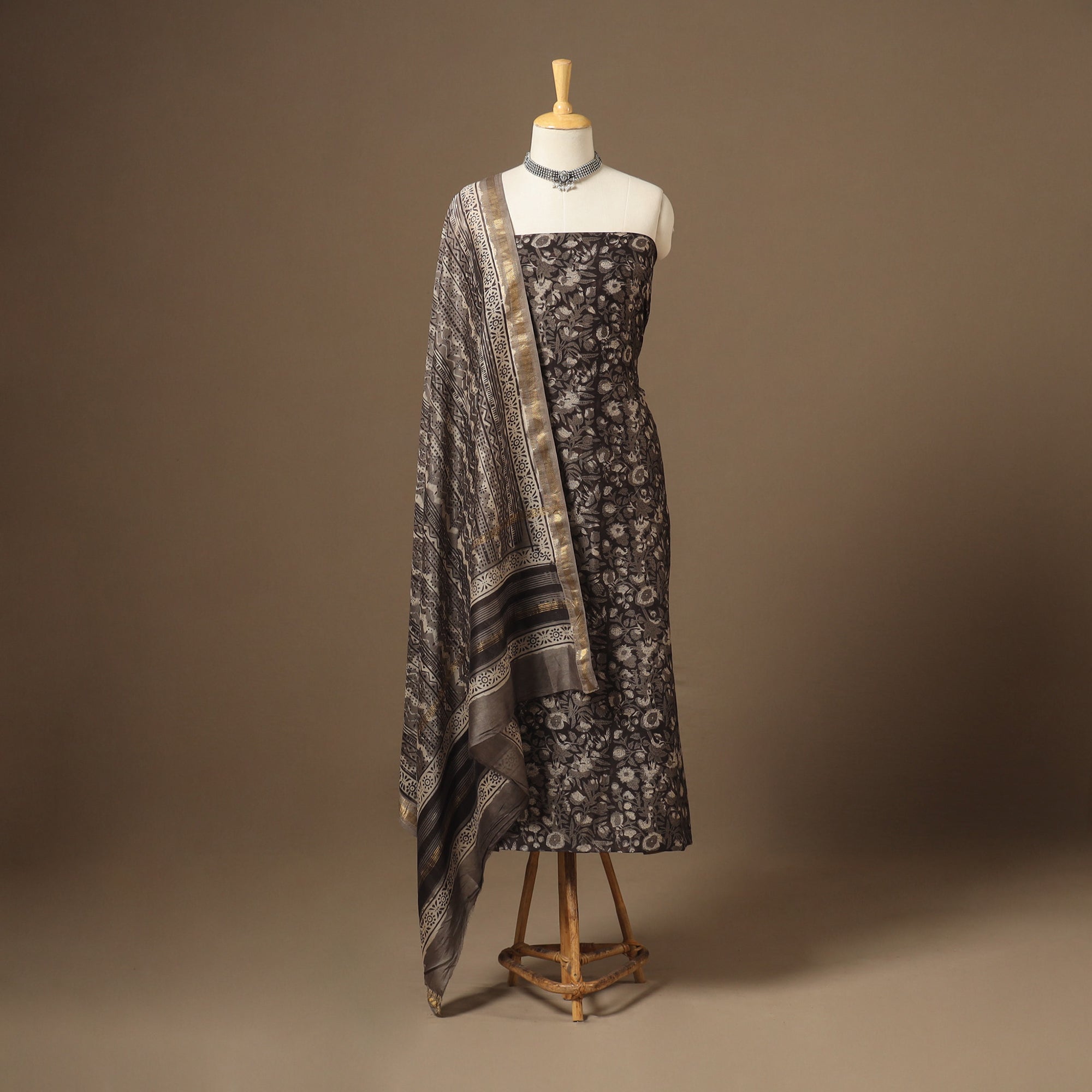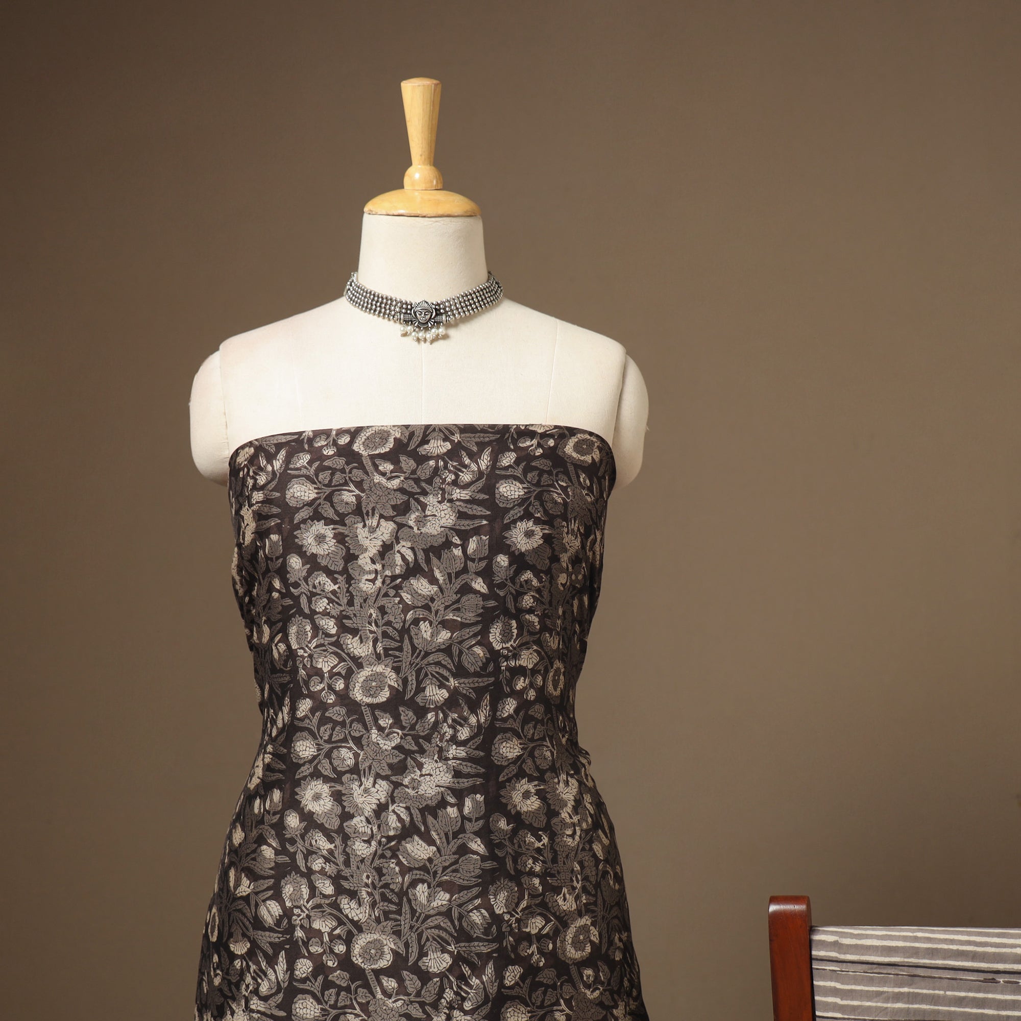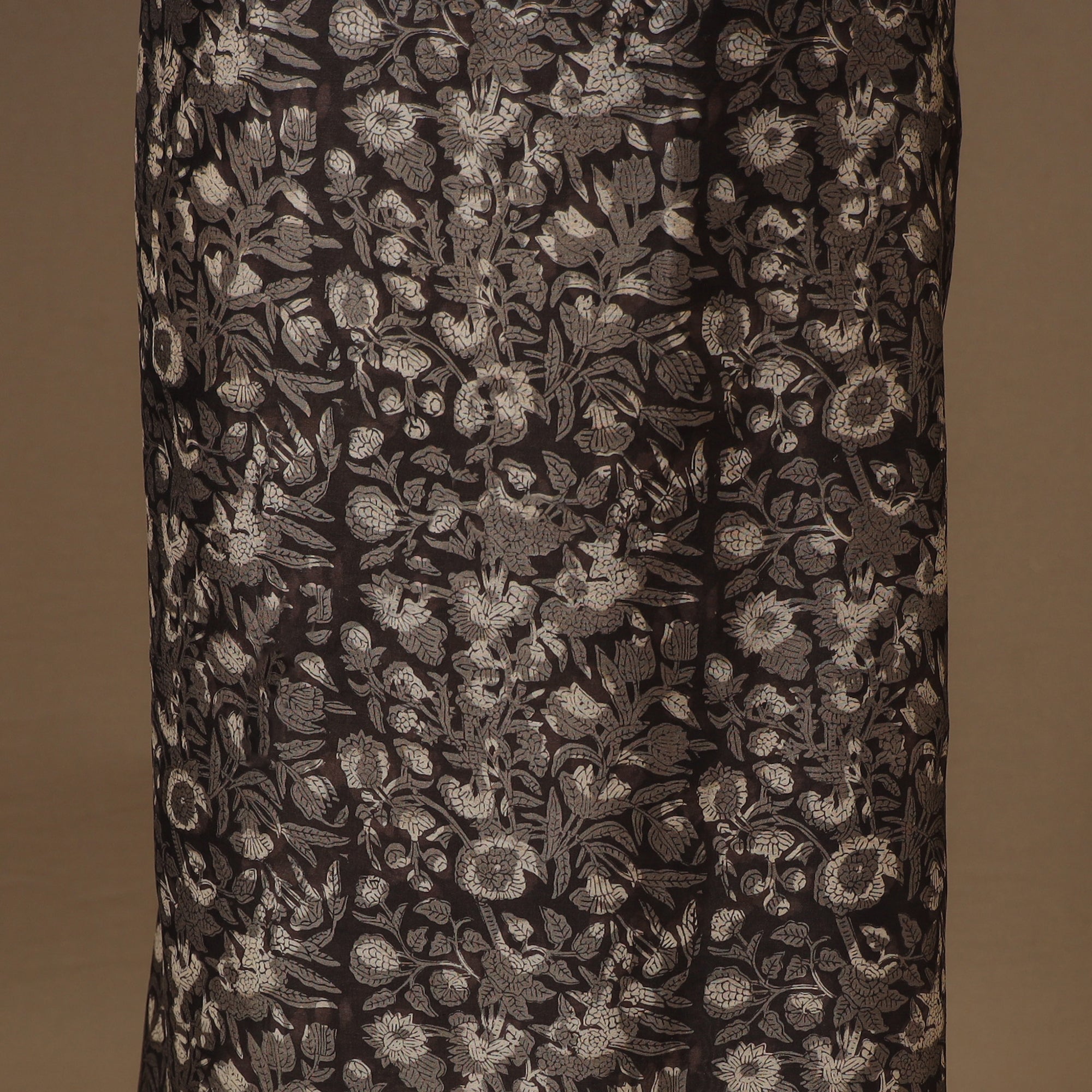 Elevate your wardrobe with this black 3pc natural dyed maheshwari silk-cotton unstitched dress material, featuring Vanaspati Jahota block prints from Kutch, Gujarat. Known for its intricate detailing and use of natural dyes, this centuries-old craft reflects India’s rich textile legacy. The set includes a maheshwari silk kurta fabric, a beautifully printed dupatta, and a comfortable cotton bottom. Versatile, breathable, and elegant it’s ideal for all-day wear across seasons.
