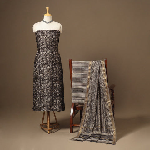 Black - 3pc Natural Dyed Maheshwari Silk Unstitched Vanaspati Jahota Dress Material 21