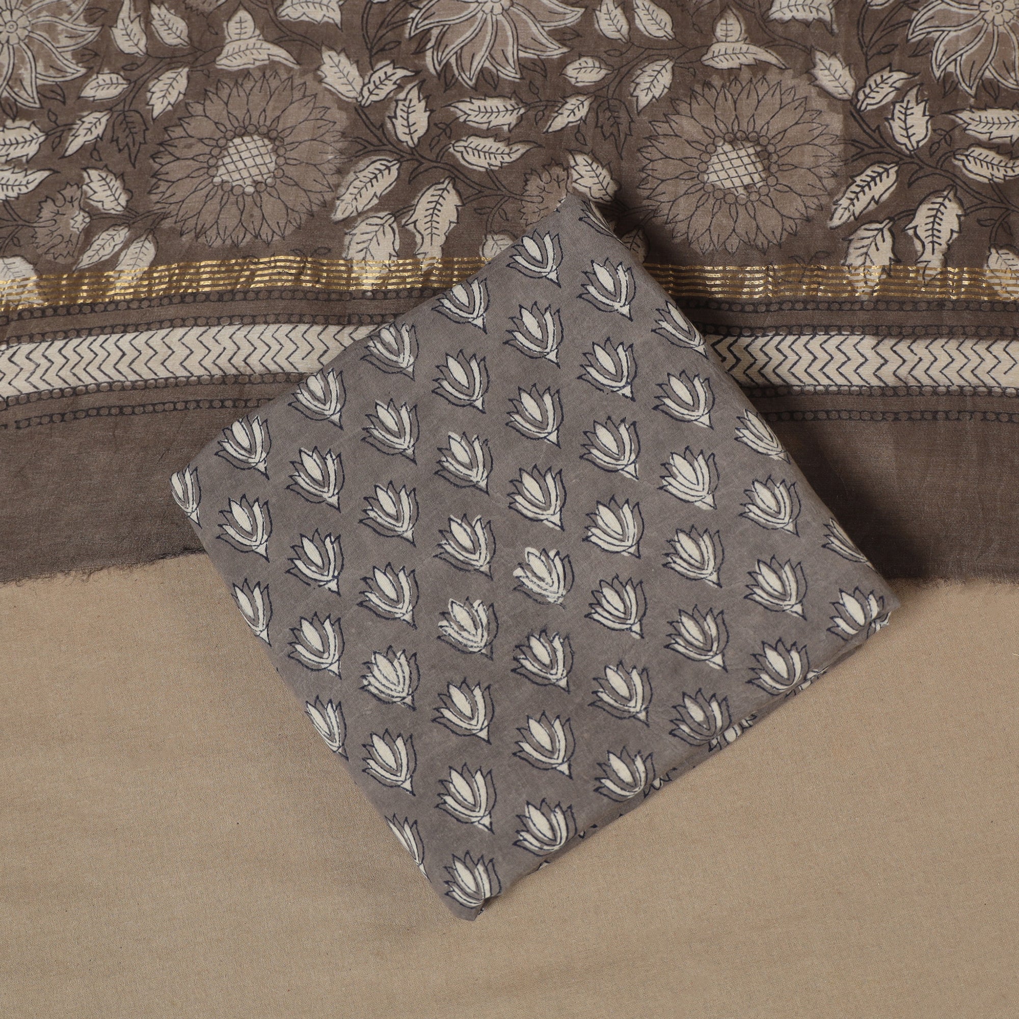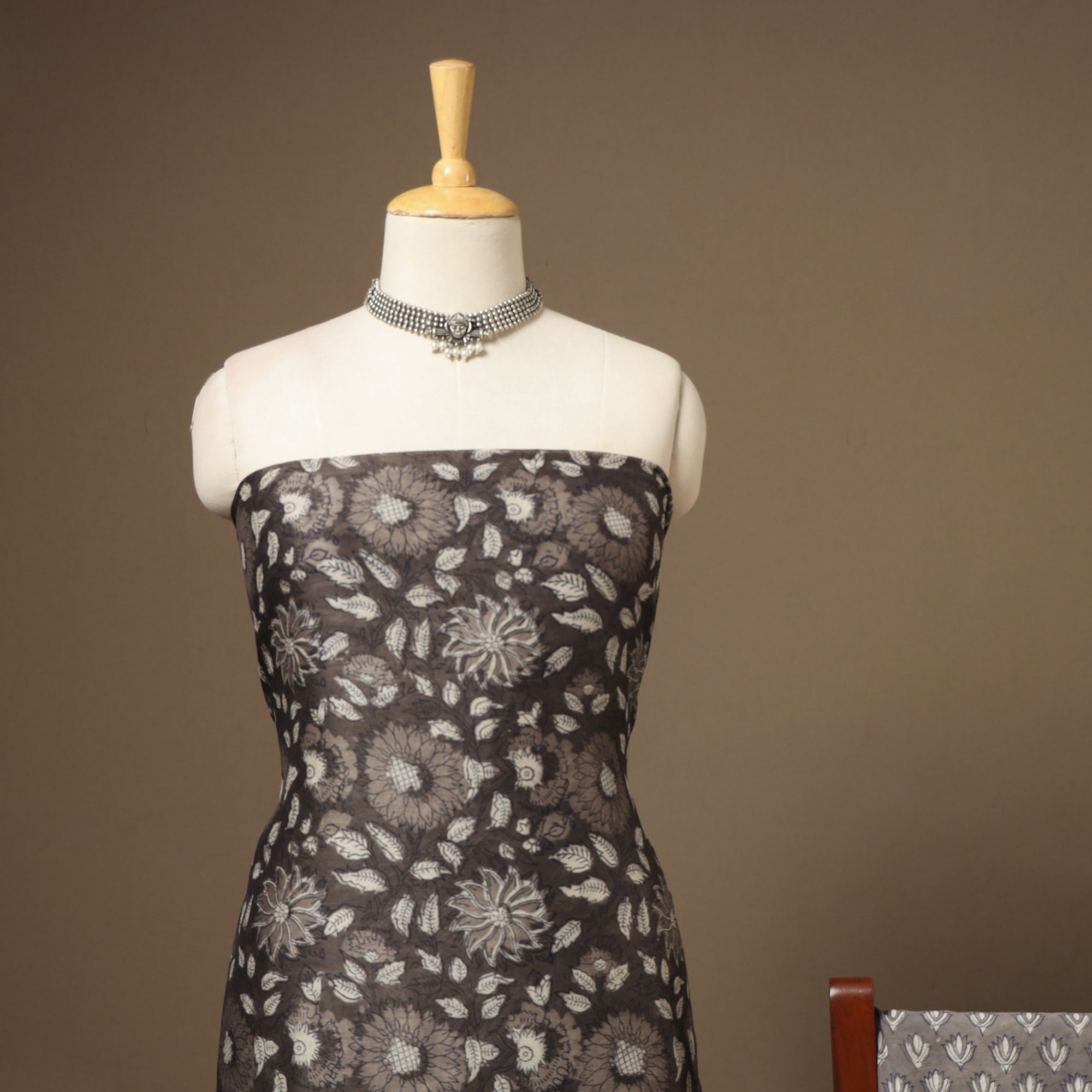 Elevate your wardrobe with this brown 3pc natural dyed maheshwari silk-cotton unstitched dress material, featuring Vanaspati Jahota block prints from Kutch, Gujarat. Known for its intricate detailing and use of natural dyes, this centuries-old craft reflects India’s rich textile legacy. The set includes a maheshwari silk kurta fabric, a beautifully printed dupatta, and a comfortable cotton bottom. Versatile, breathable, and elegant it’s ideal for all-day wear across seasons.
