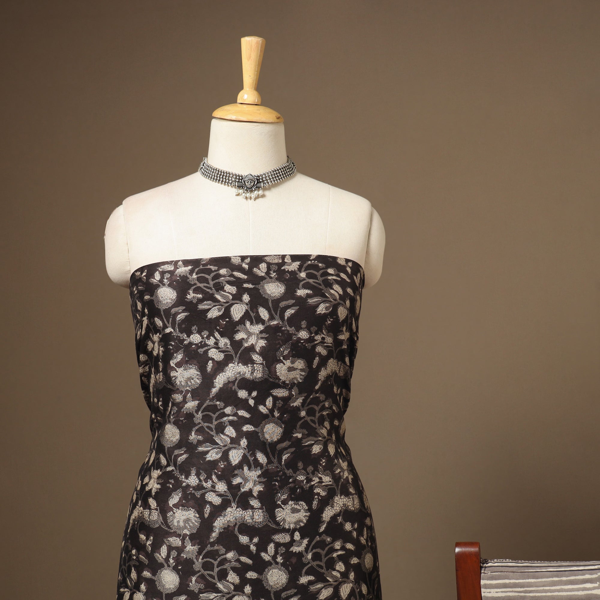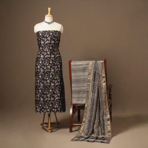 Elevate your wardrobe with this black 3pc natural dyed maheshwari silk-cotton unstitched dress material, featuring Vanaspati Jahota block prints from Kutch, Gujarat. Known for its intricate detailing and use of natural dyes, this centuries-old craft reflects India’s rich textile legacy. The set includes a maheshwari silk kurta fabric, a beautifully printed dupatta, and a comfortable cotton bottom. Versatile, breathable, and elegant it’s ideal for all-day wear across seasons.