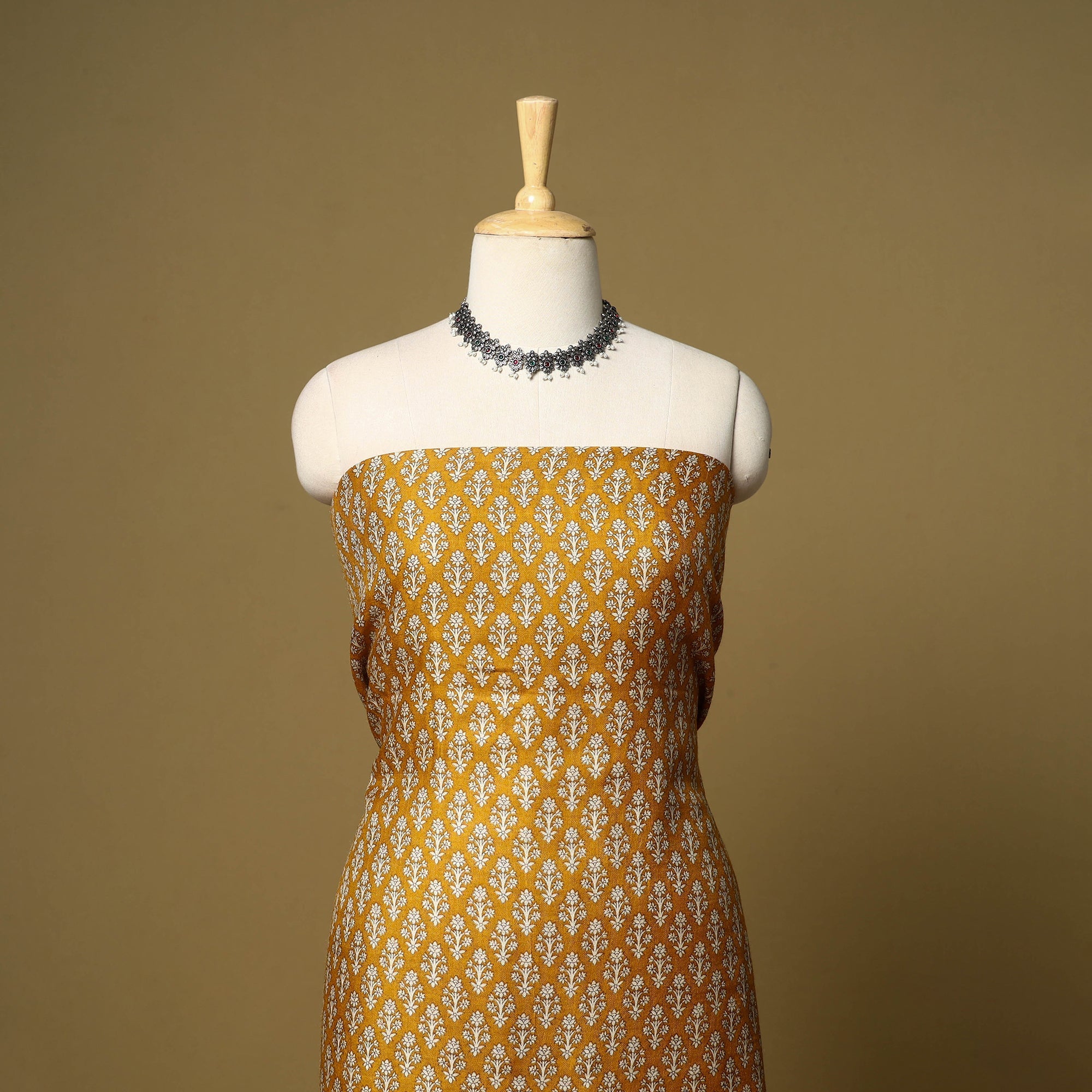 Yellow 3pc handloom sanganeri pashmina wool dress material originates from Sanganer, Jaipur, Rajasthan, where this printing tradition has been practiced for generations. The set is made using the traditional hand block printing process, with artisans imprinting patterns using hand-carved wooden blocks and VAT dyes. Offering natural warmth and comfort suitable for seasonal wear, it includes a kurta, a matching dupatta and a bottom.