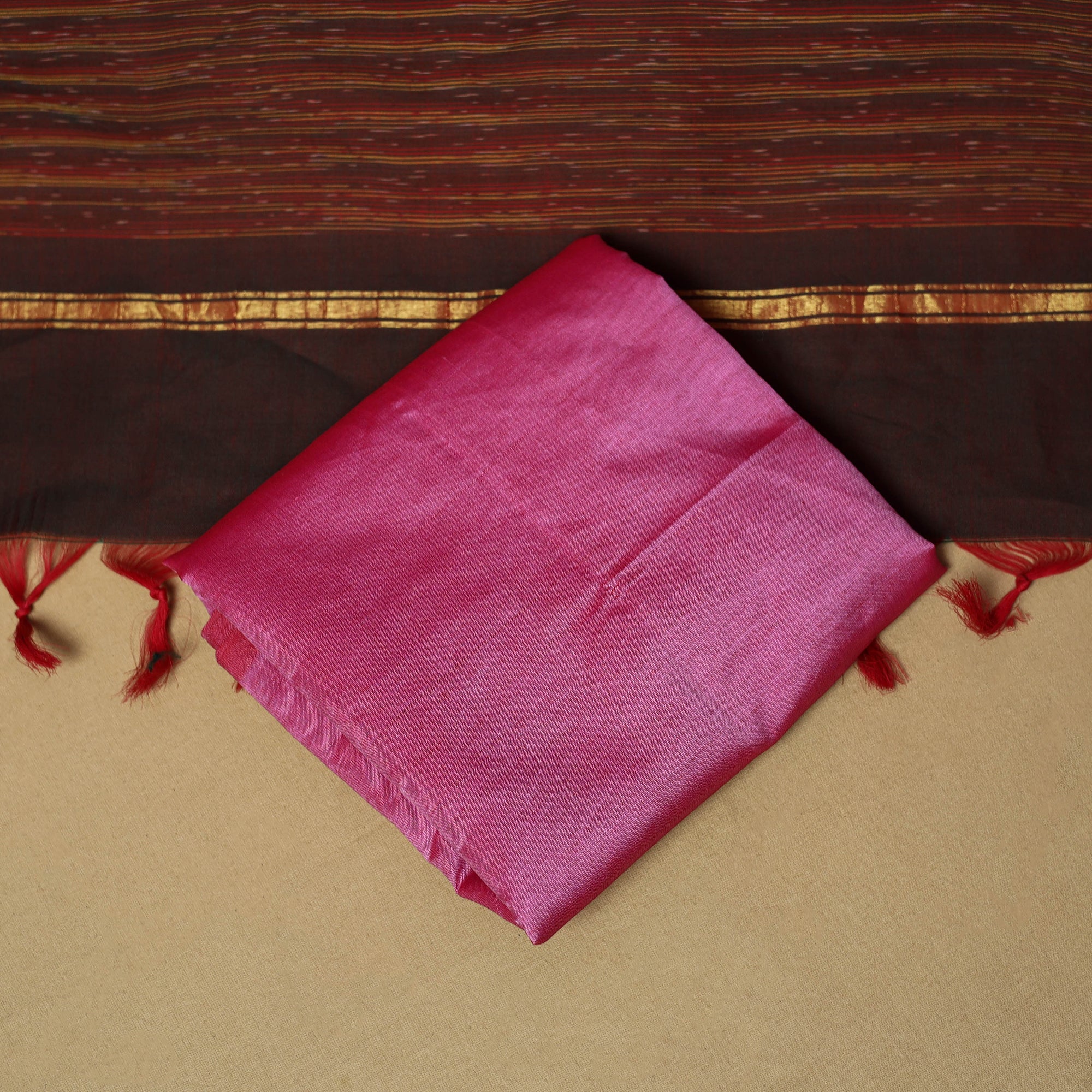 Maroon 3pc handloom pochampally ikat dress material set from Telangana is crafted using the traditional resist-dyeing technique, where threads are dyed before weaving to create signature geometric patterns. The set includes kurta fabric, a dupatta and a plain bottom. This age-old weaving tradition makes every piece unique, perfect for festive occasions, weddings or elegant everyday wear.