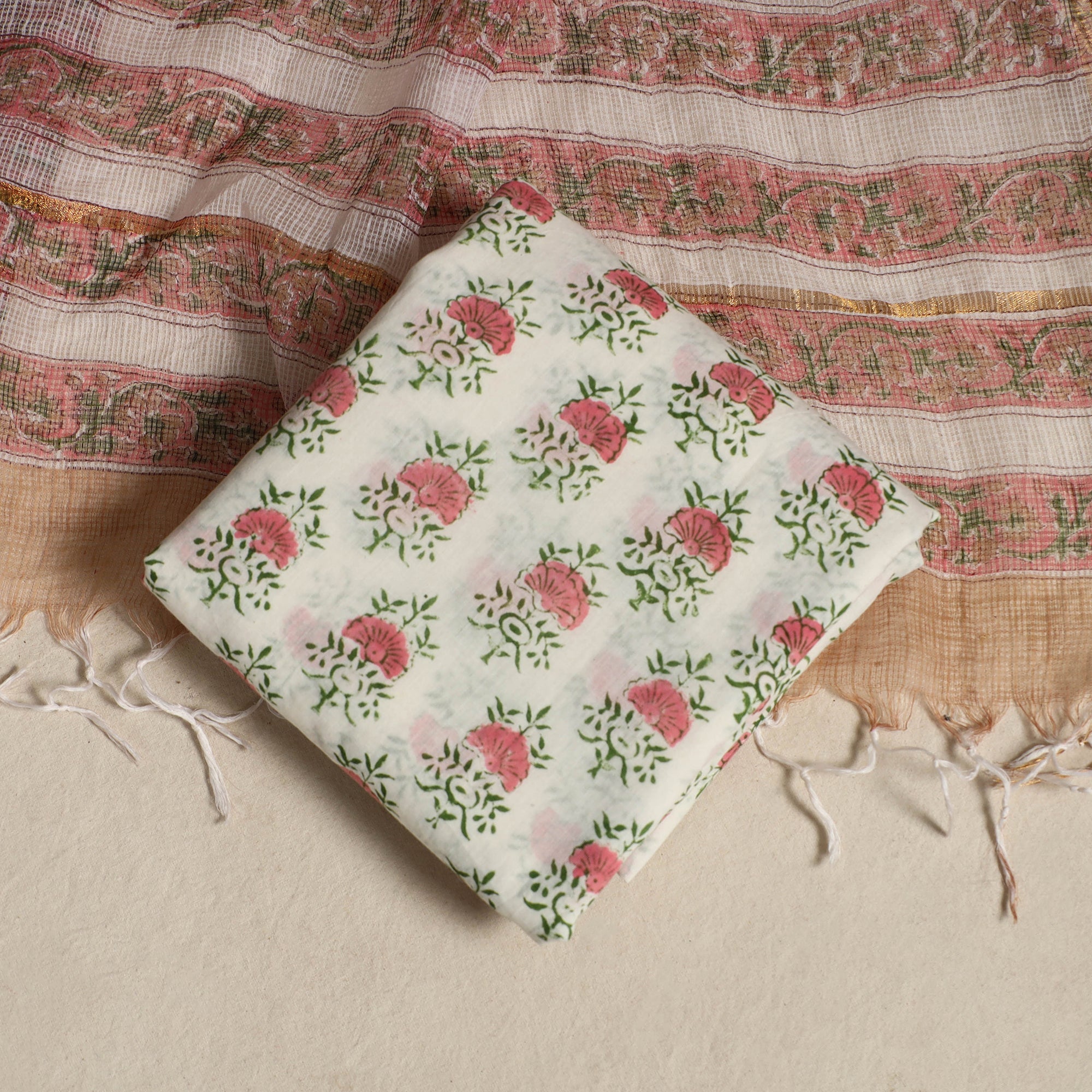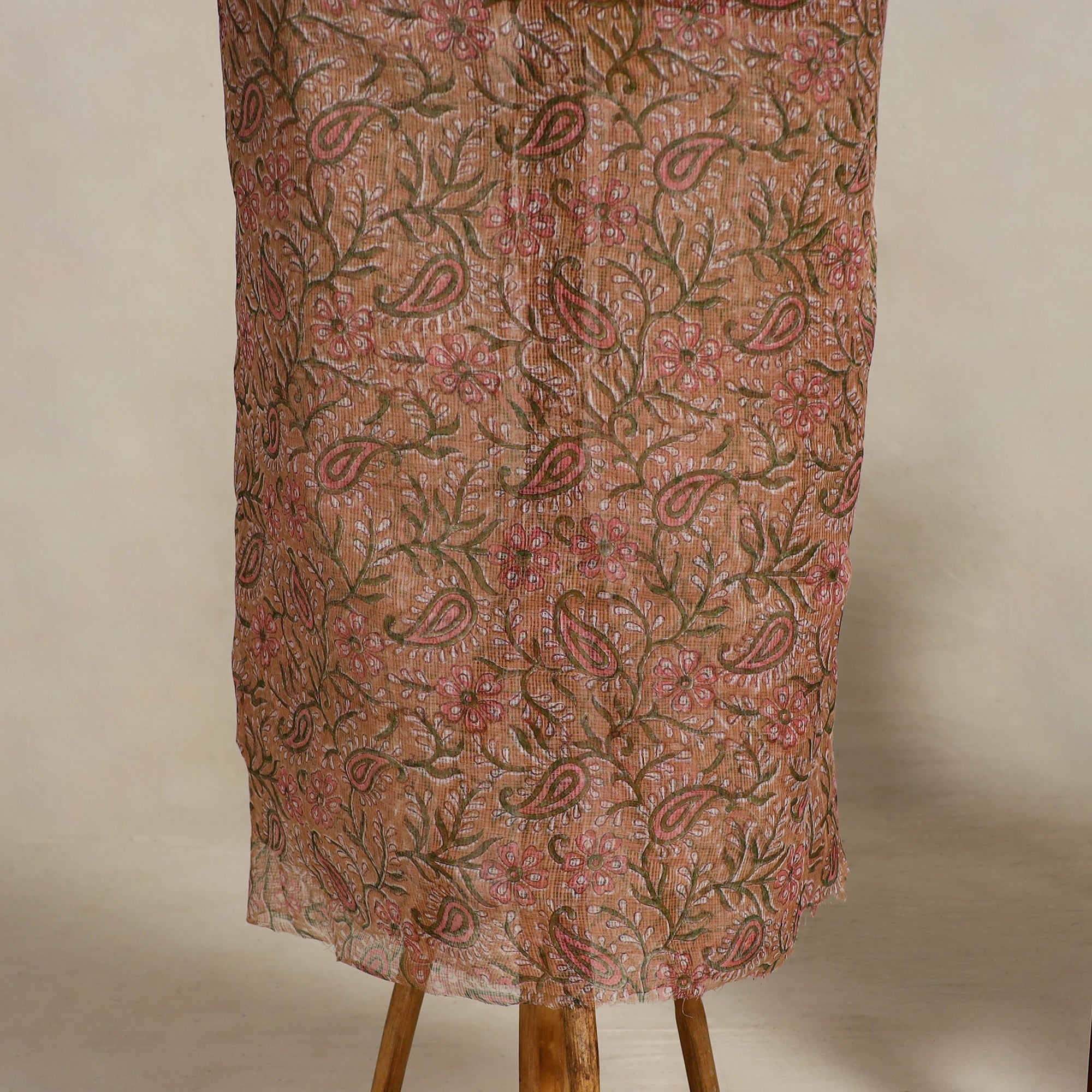 This brown 3pc sanganeri dress material set brings together tradition and comfort. The kurta material and dupatta are crafted from lightweight kota doria cotton, offering a airy feel, while the bottom fabric is cotton for added comfort. Adorned with vibrant hand block prints, the kota doria’s cotton-silk blend gives it a graceful, sheer elegance ideal for casual days and festive celebrations.