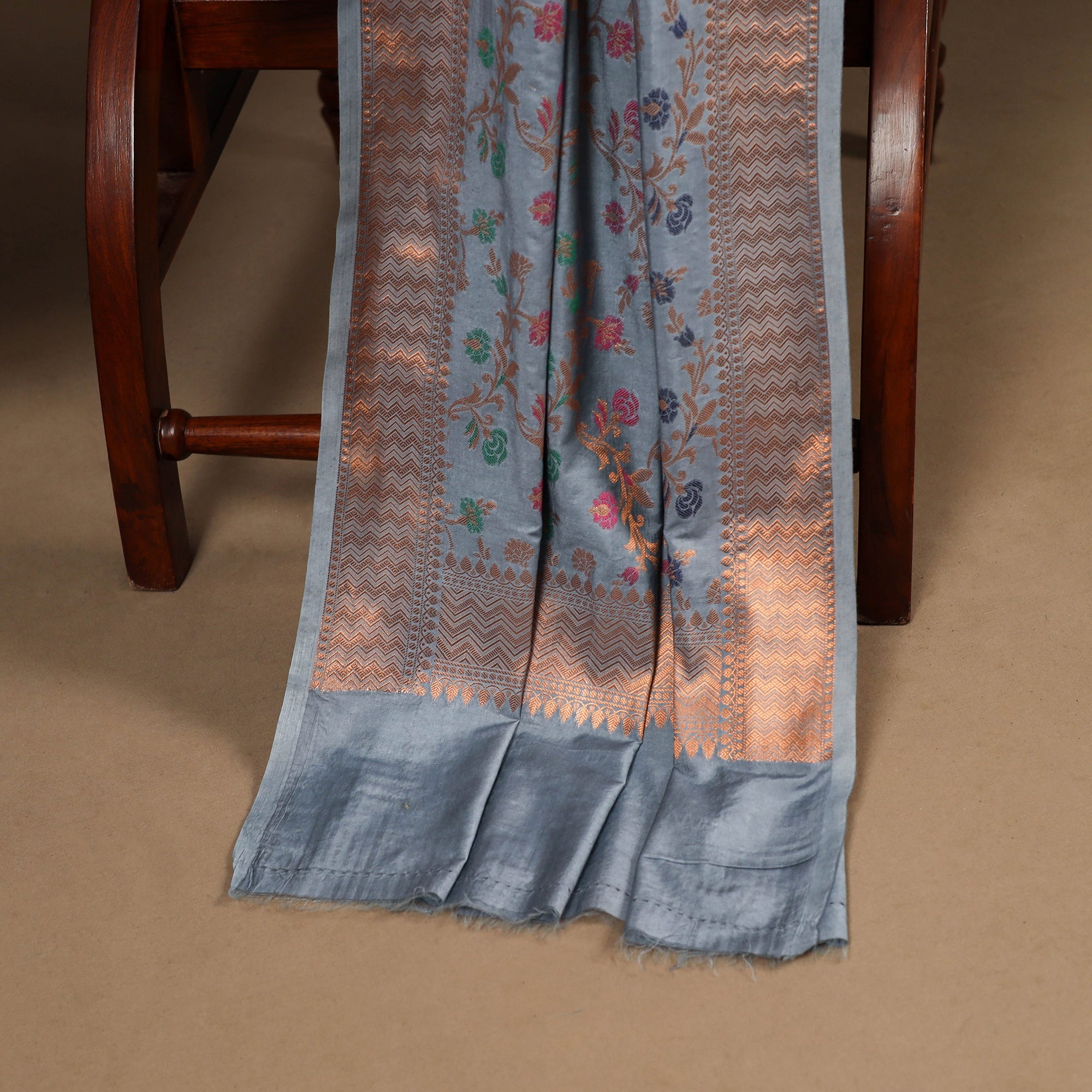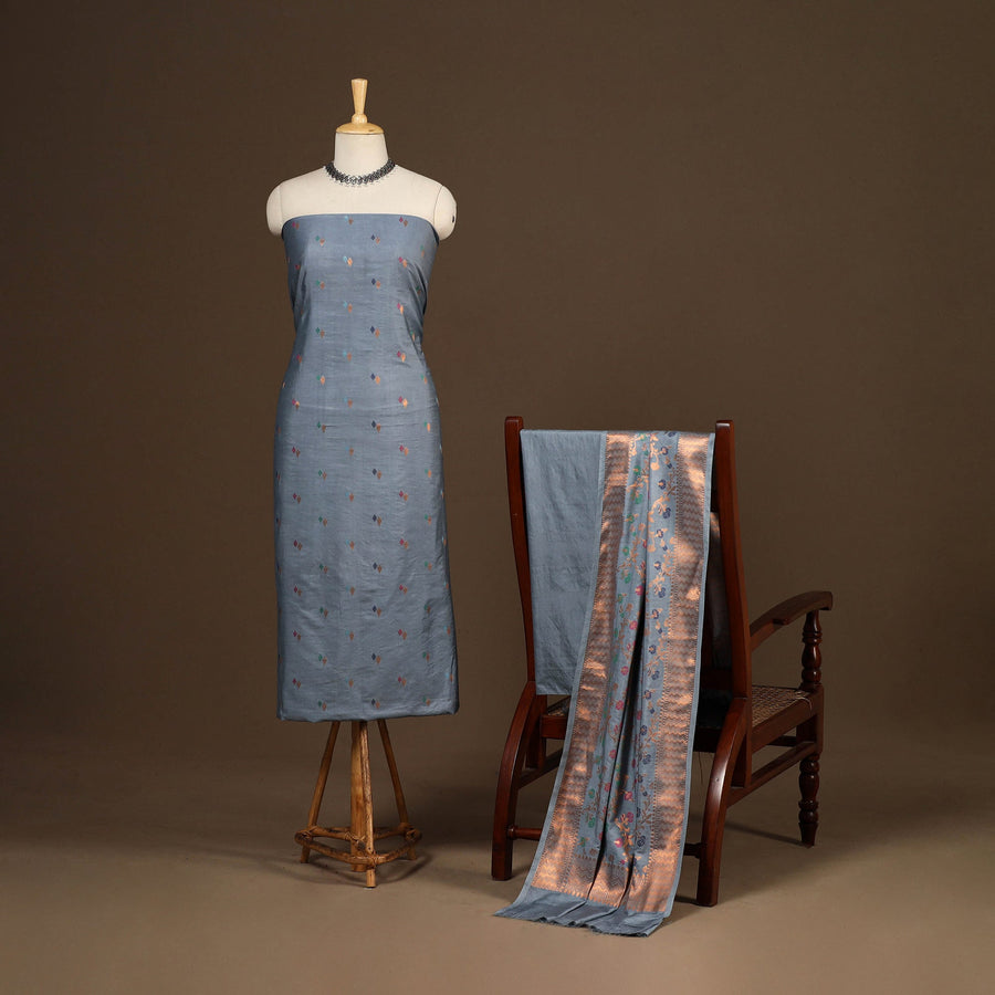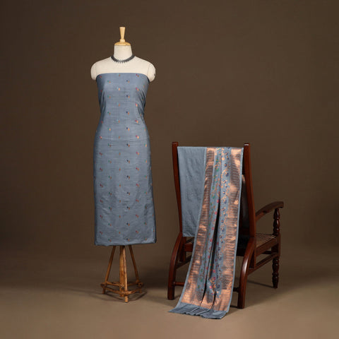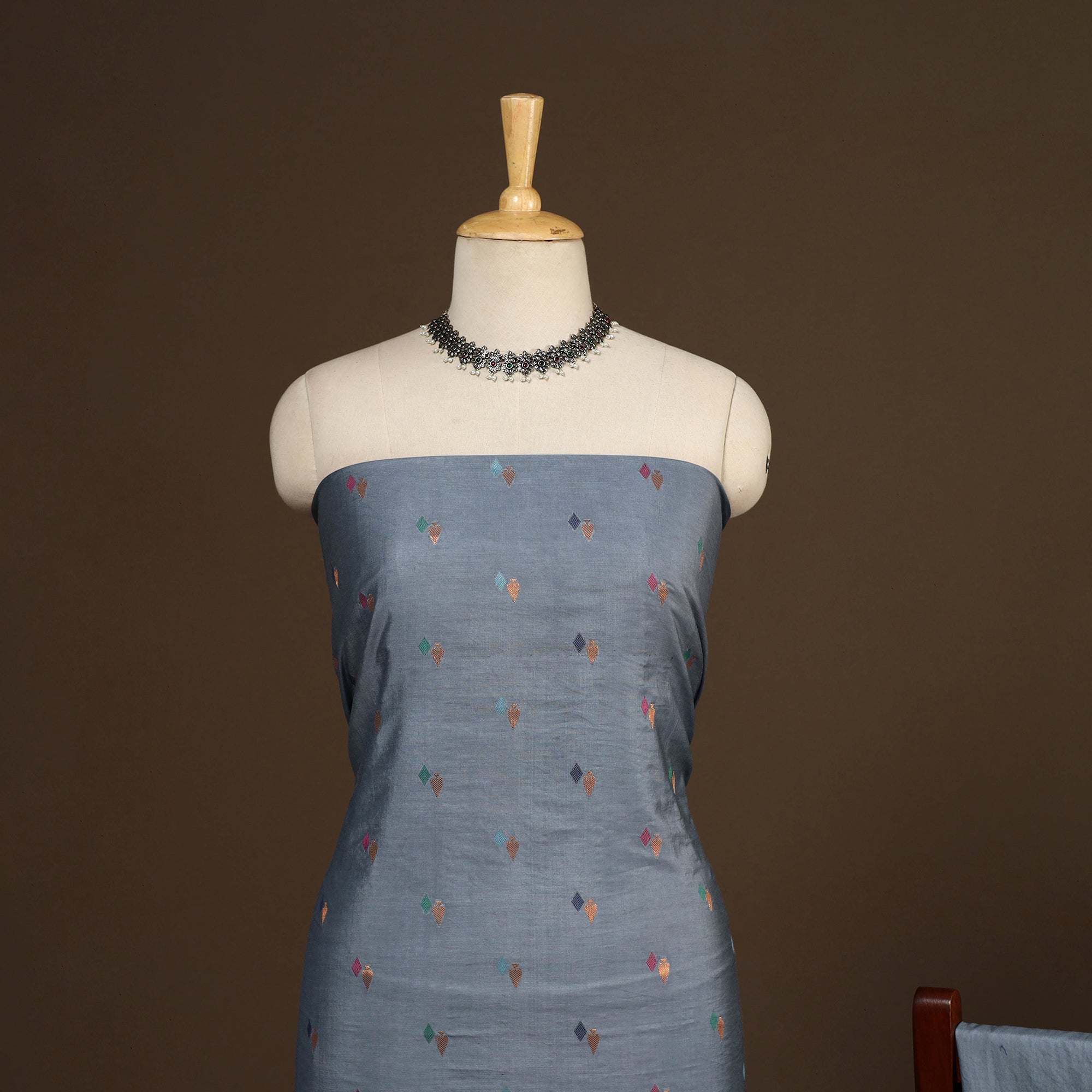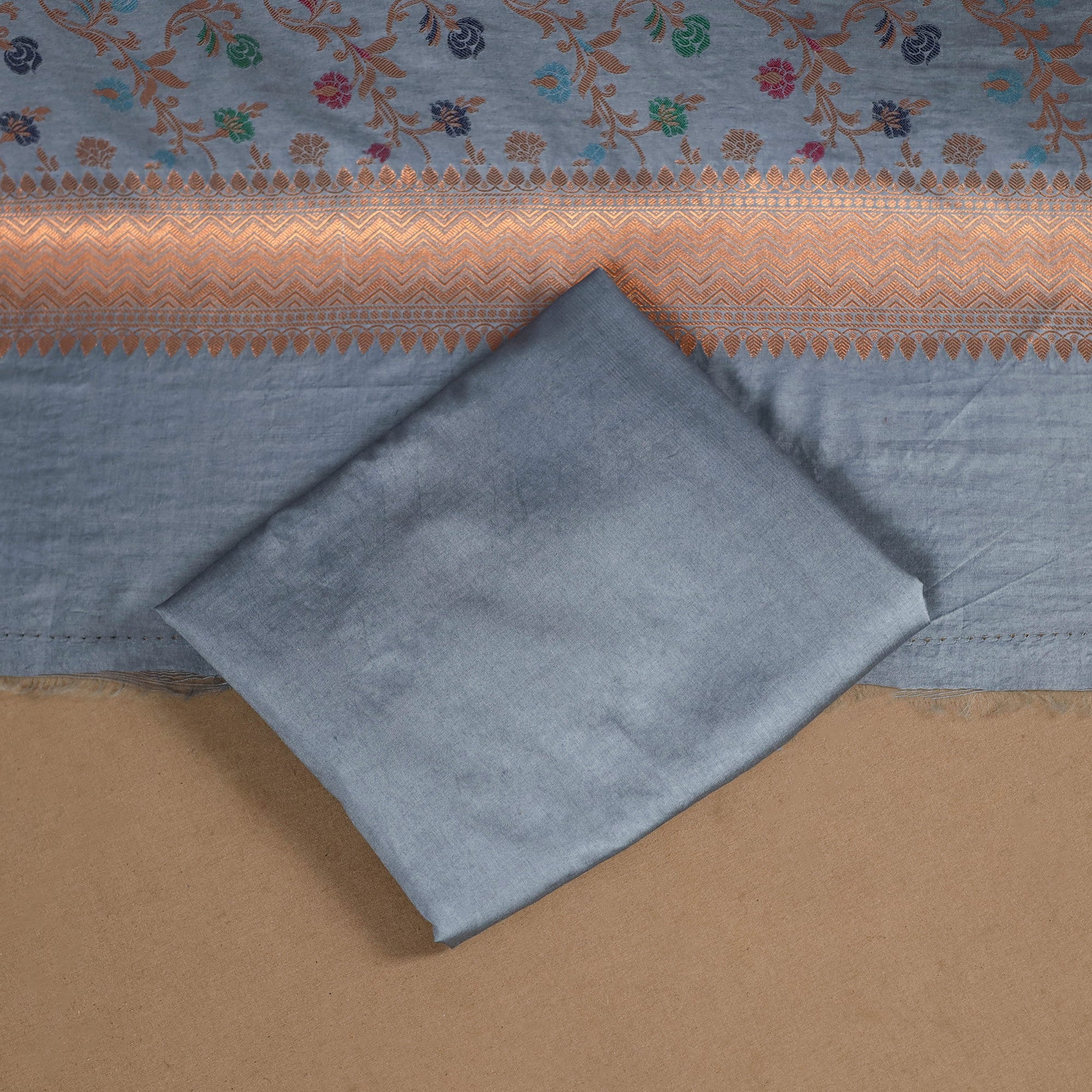 This grey 3pc art silk cotton meena weaving banarasi dress material brings a touch of elegance and festive charm. The set includes fabric for a kurta, bottom, and a beautifully woven dupatta. Showcasing the traditional Meena weaving technique of Banaras, it features intricate zari patterns highlighted with colourful threads in rich jewel tones. Elegant yet versatile, this fabric is ideal for weddings, festive gatherings, and special occasions, creating timeless and graceful outfits.