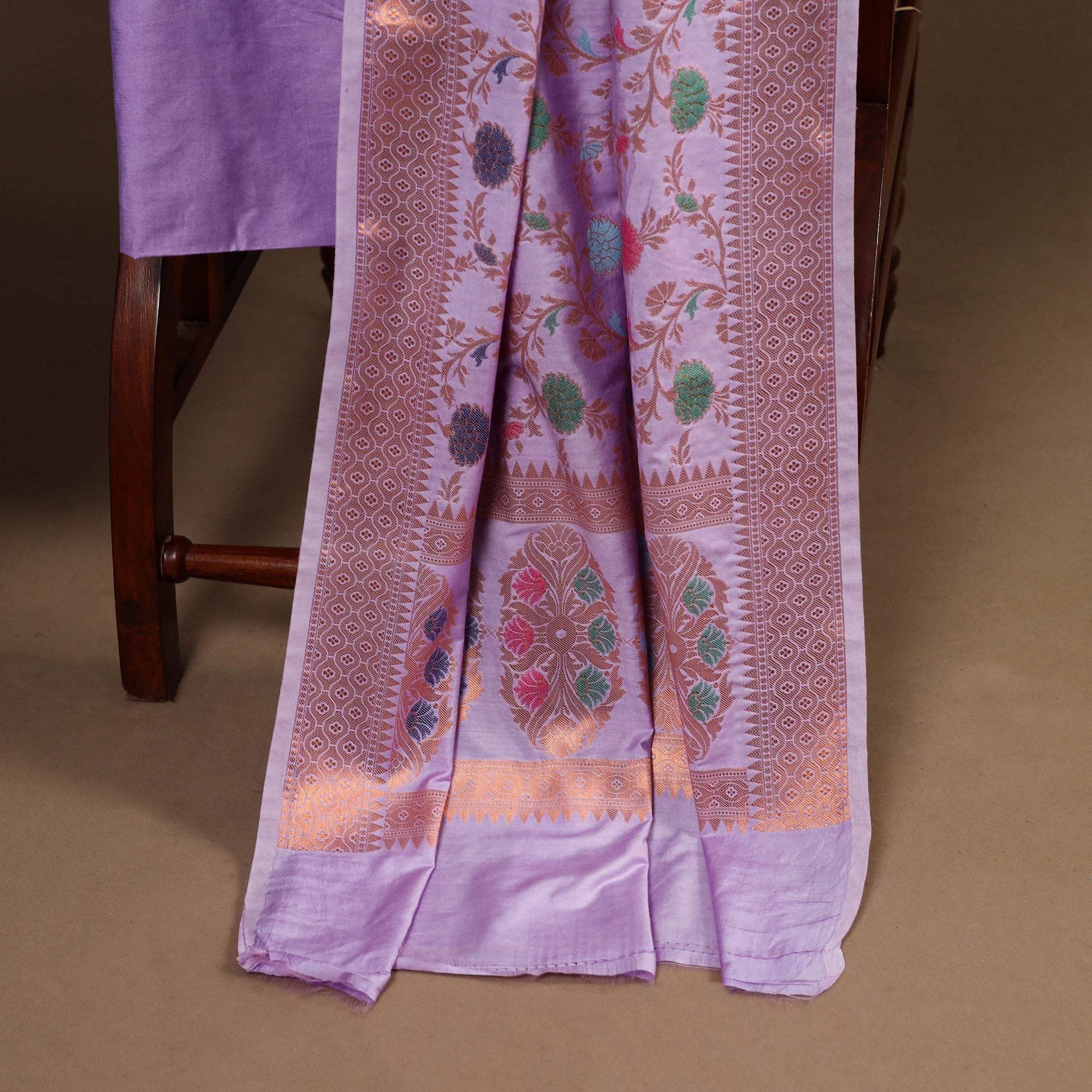 This purple 3pc art silk cotton meena weaving banarasi dress material brings a touch of elegance and festive charm. The set includes fabric for a kurta, bottom, and a beautifully woven dupatta. Showcasing the traditional Meena weaving technique of Banaras, it features intricate zari patterns highlighted with colourful threads in rich jewel tones. Elegant yet versatile, this fabric is ideal for weddings, festive gatherings, and special occasions, creating timeless and graceful outfits.
