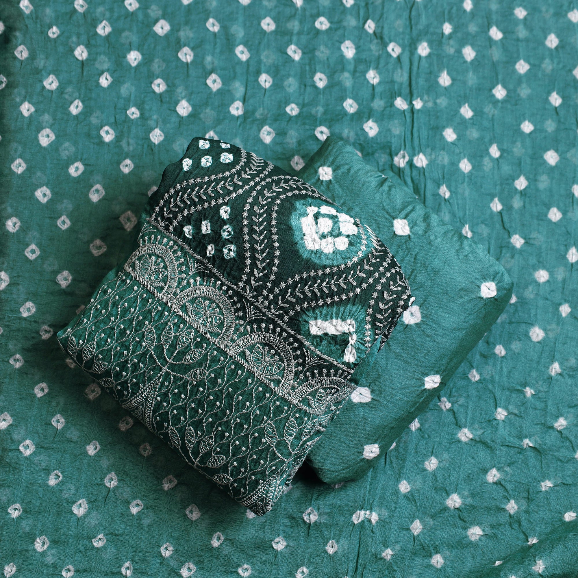 This green 3pc bandhani embroidery dress material brings alive the timeless tie-dye artistry of Kutch in vibrant hues and intricate patterns. Made from soft satin cotton, the set includes a kurta, matching bottom, and dupatta, all adorned with intricate patterns tied and dyed by hand. The detailed motifs are created using the traditional bandhani method. This set adds an elegant touch to your wardrobe.