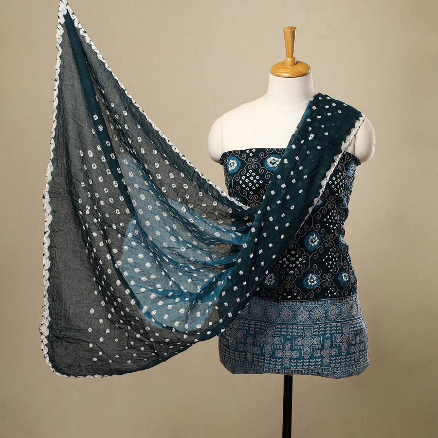 This green 3pc bandhani embroidery dress material brings alive the timeless tie-dye artistry of Kutch in vibrant hues and intricate patterns. Made from soft satin cotton, the set includes a kurta, matching bottom, and dupatta, all adorned with intricate patterns tied and dyed by hand. The detailed motifs are created using the traditional bandhani method. This set adds an elegant touch to your wardrobe.