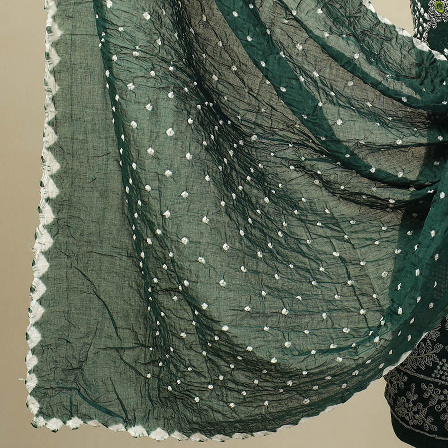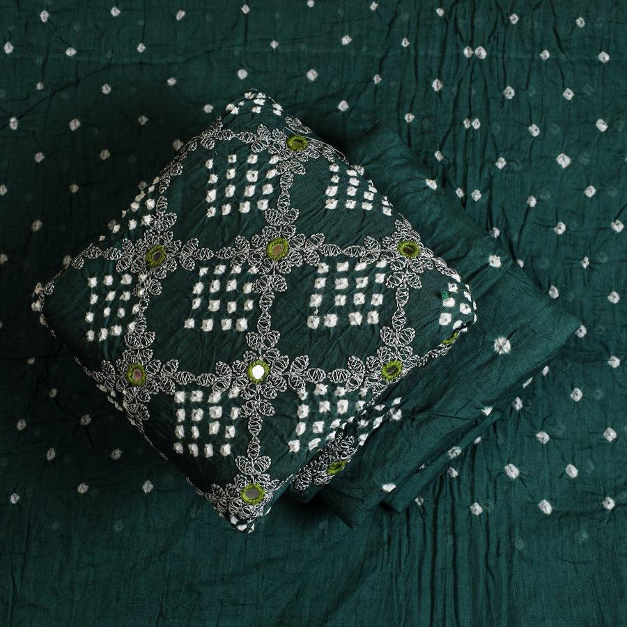 Infuse your wardrobe with cultural richness with this stunning 3pc tie-dye satin cotton dark green bandhani dress material, showcasing traditional tie-dye techniques by skilled Kutch artisans. This set includes an embroidered mirror work kurta, a coordinating bottom, and a matching bandhani dupatta. Crafted from satin cotton, this dress material ensures all-day comfort. Perfect for festive occasions or everyday elegance.