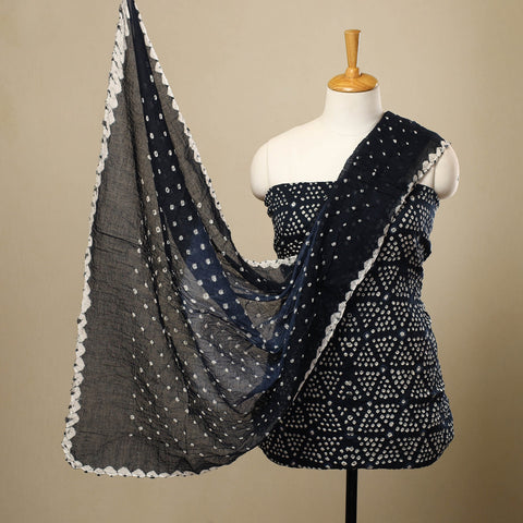 This blue 3pc bandhani dress material brings alive the timeless tie-dye artistry of Kutch in vibrant hues and intricate patterns. Made from soft satin cotton, the set includes a kurta, matching bottom, and dupatta with all adorned with intricate patterns tied and dyed by hand. The detailed motifs are created using the traditional bandhani method. This set adds an elegant touch to your wardrobe.