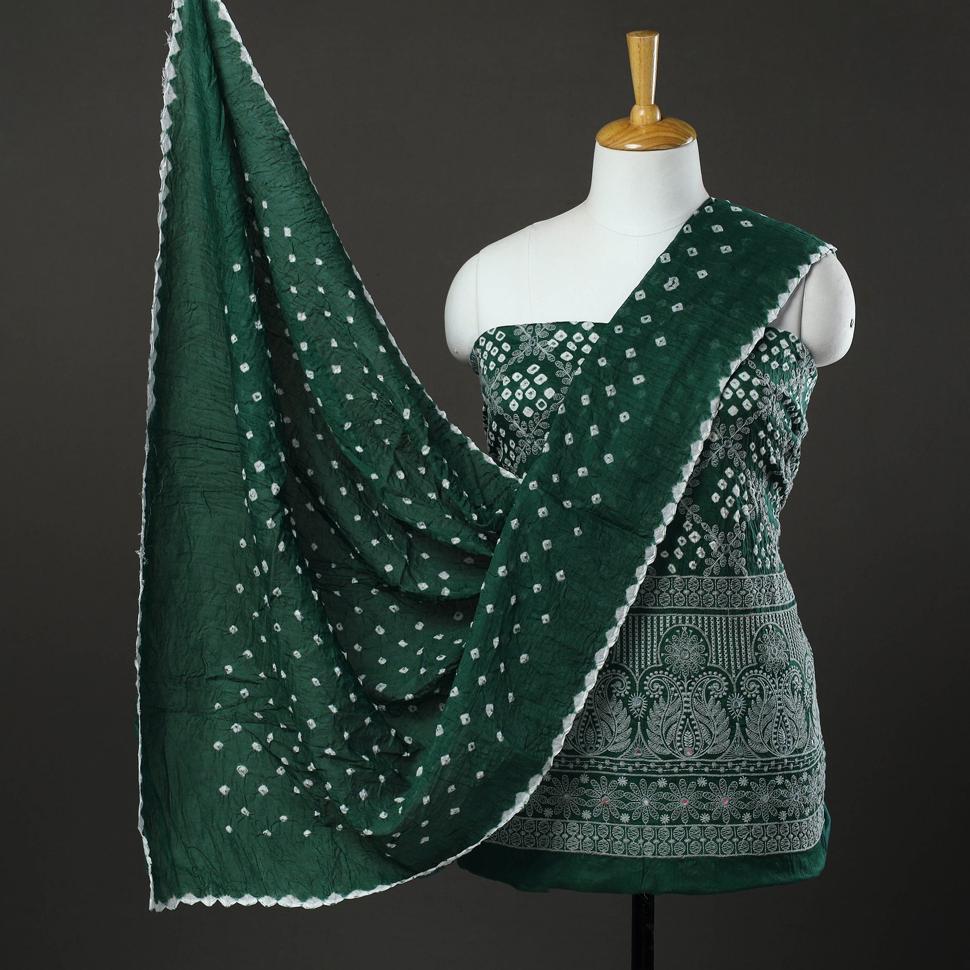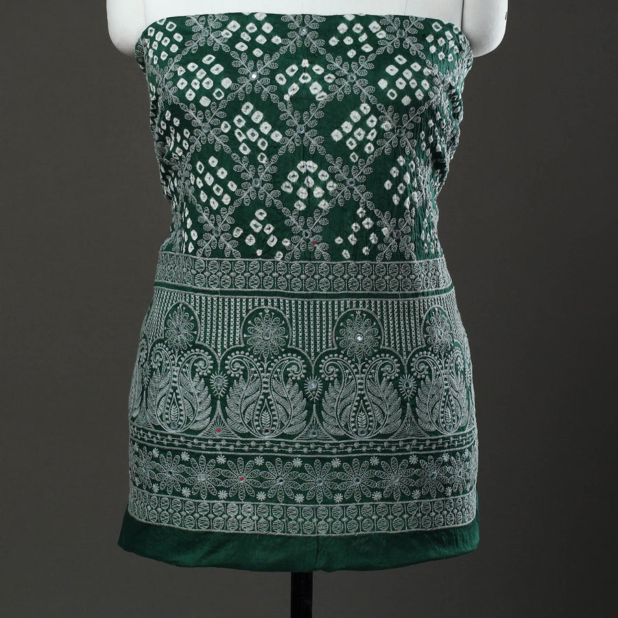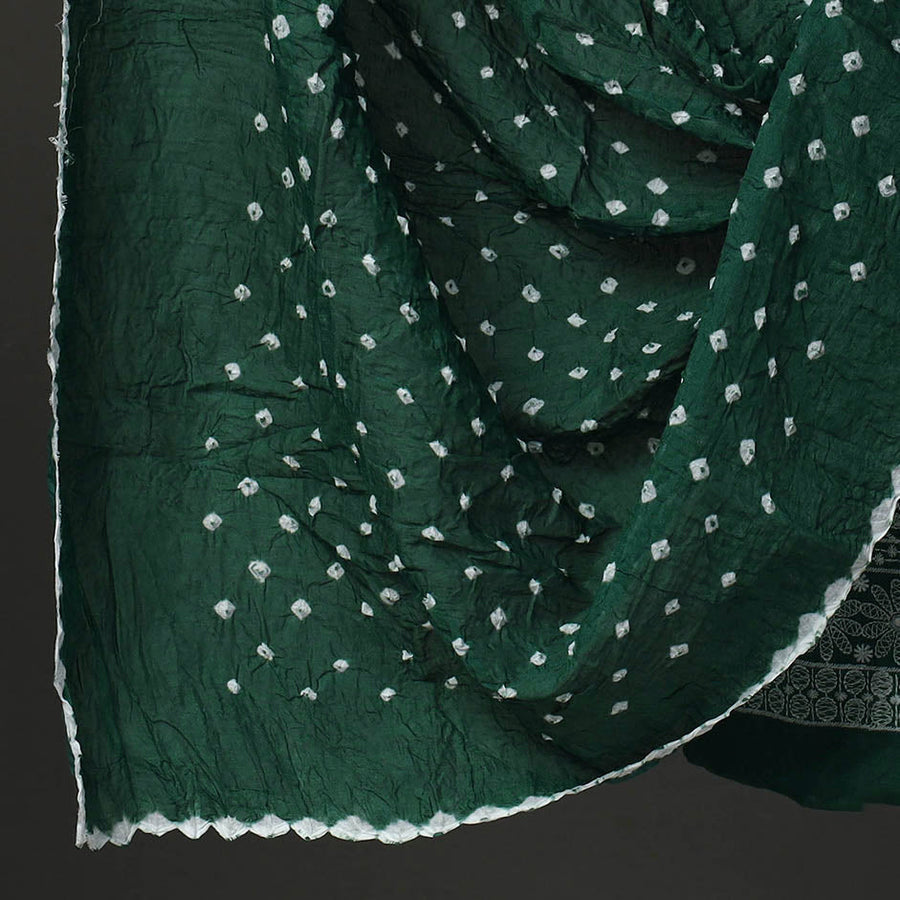 Green 3pc tie & dye satin cotton bandhani dress material by Kutch artisans. This set includes an mirror work embroidered kurta, a coordinating bottom, and a matching dupatta, all adorned with vibrant bandhani patterns. The traditional tie & dye technique, involving precise thread tying to create unique motifs, ensures that each piece is as unique as the wearer.