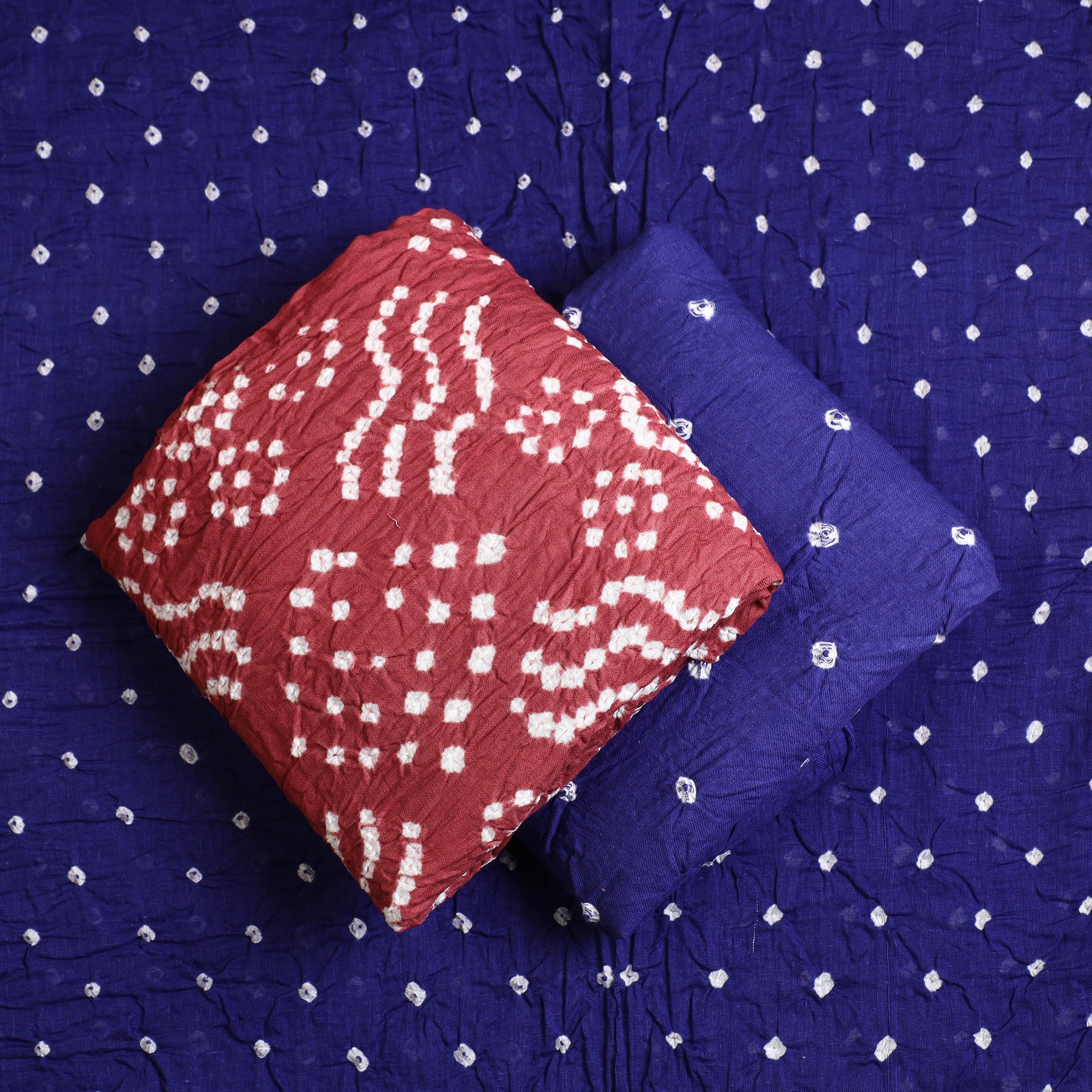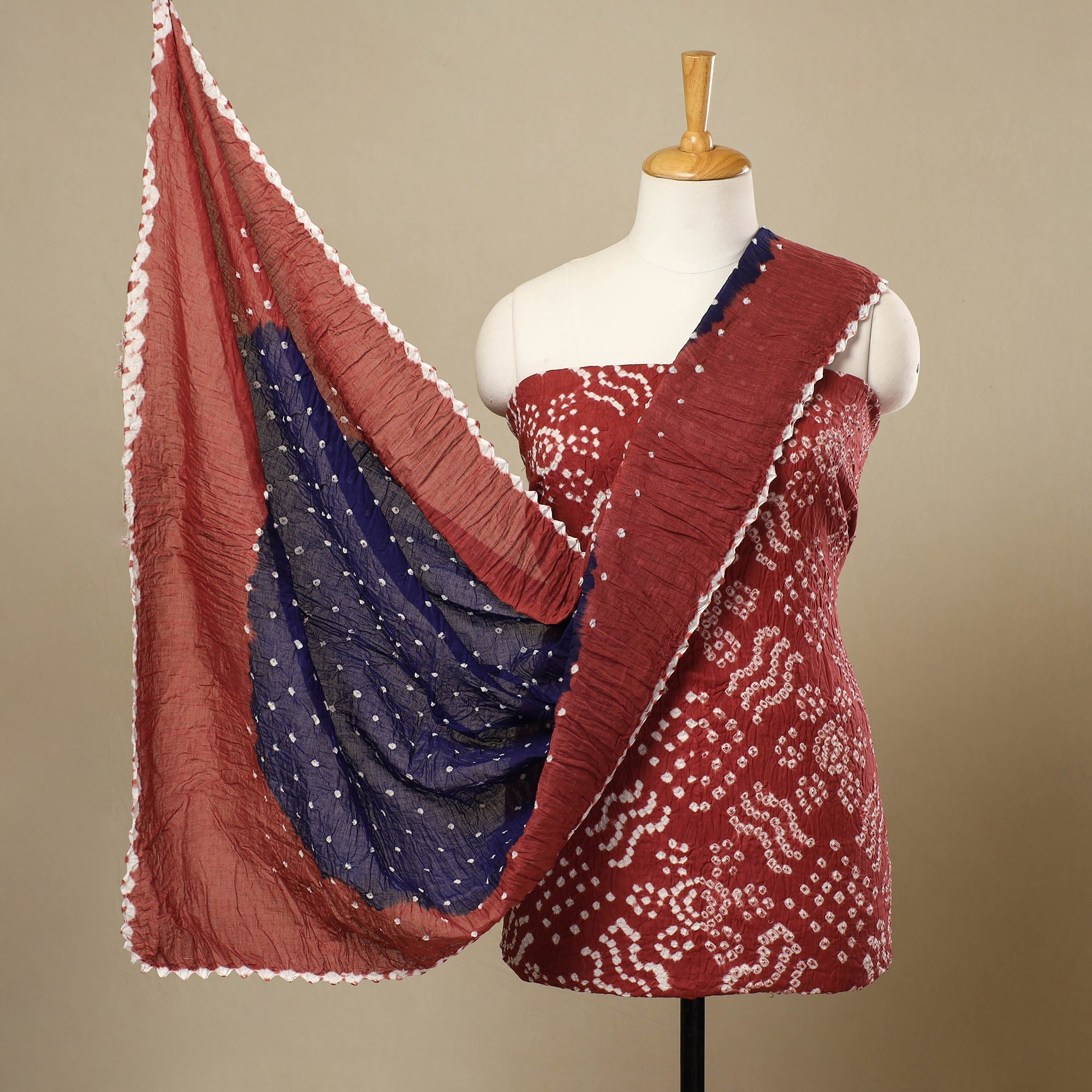 Celebrate tradition in style with this elegant 3pc satin cotton brown bandhani dress material set. Lovingly created by Kutch artisans with ancient tie-dye artistry, this set offers a kurta fabric, bottom fabric, and a graceful dupatta, showcasing lively bandhani motifs. Soft on the skin and rich in heritage, it’s suited for festive wear or daily sophistication.