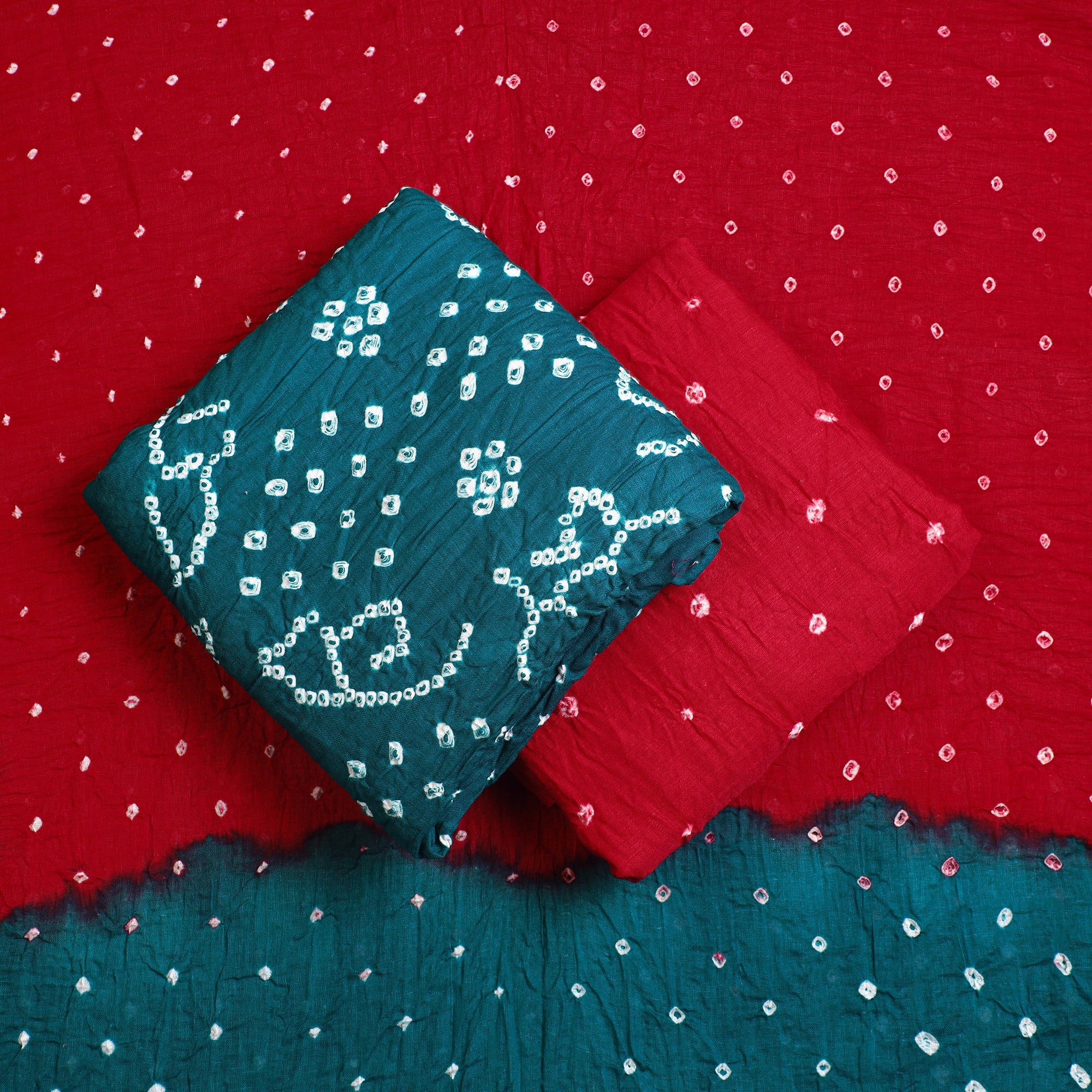 Celebrate tradition in style with this elegant 3pc satin cotton green bandhani dress material set. Lovingly created by Kutch artisans with ancient tie-dye artistry, this set offers a kurta fabric, bottom fabric, and a graceful dupatta, showcasing lively bandhani motifs. Soft on the skin and rich in heritage, it’s suited for festive wear or daily sophistication.