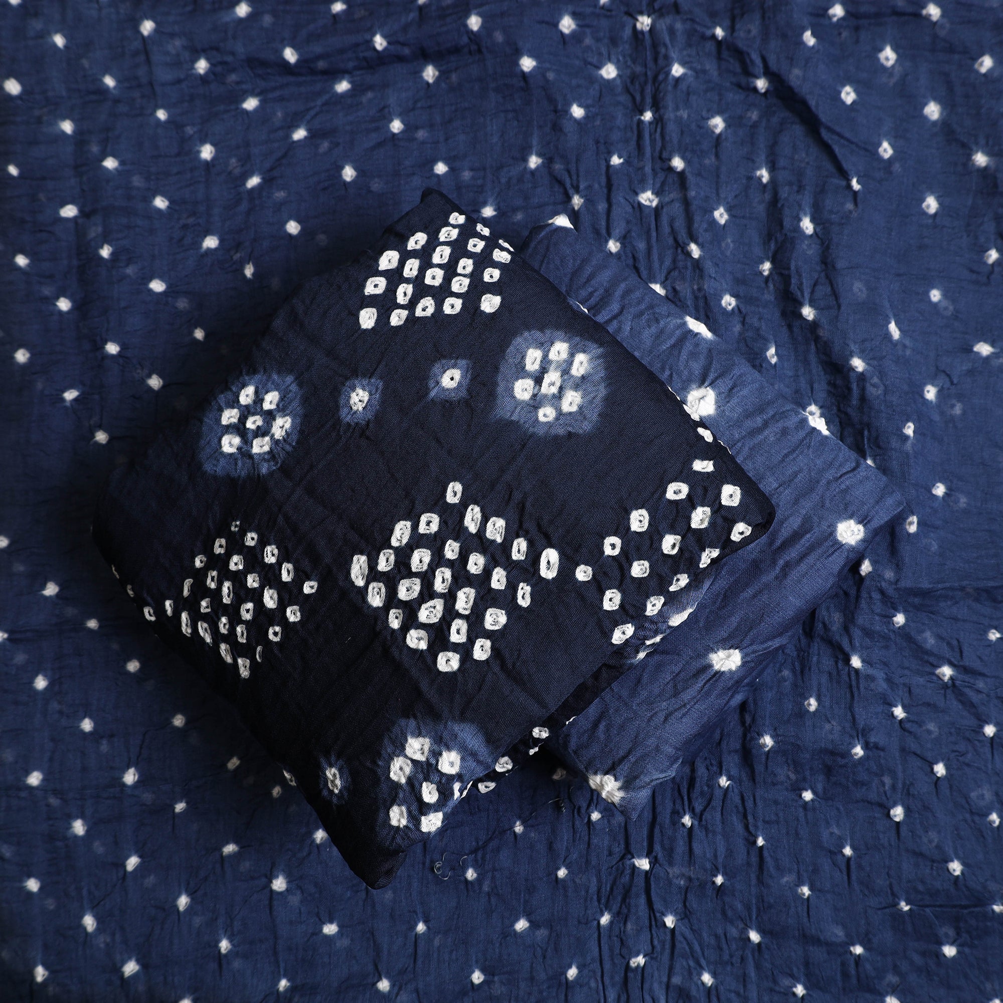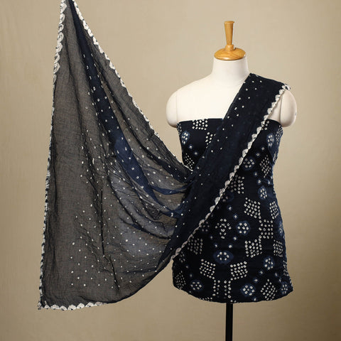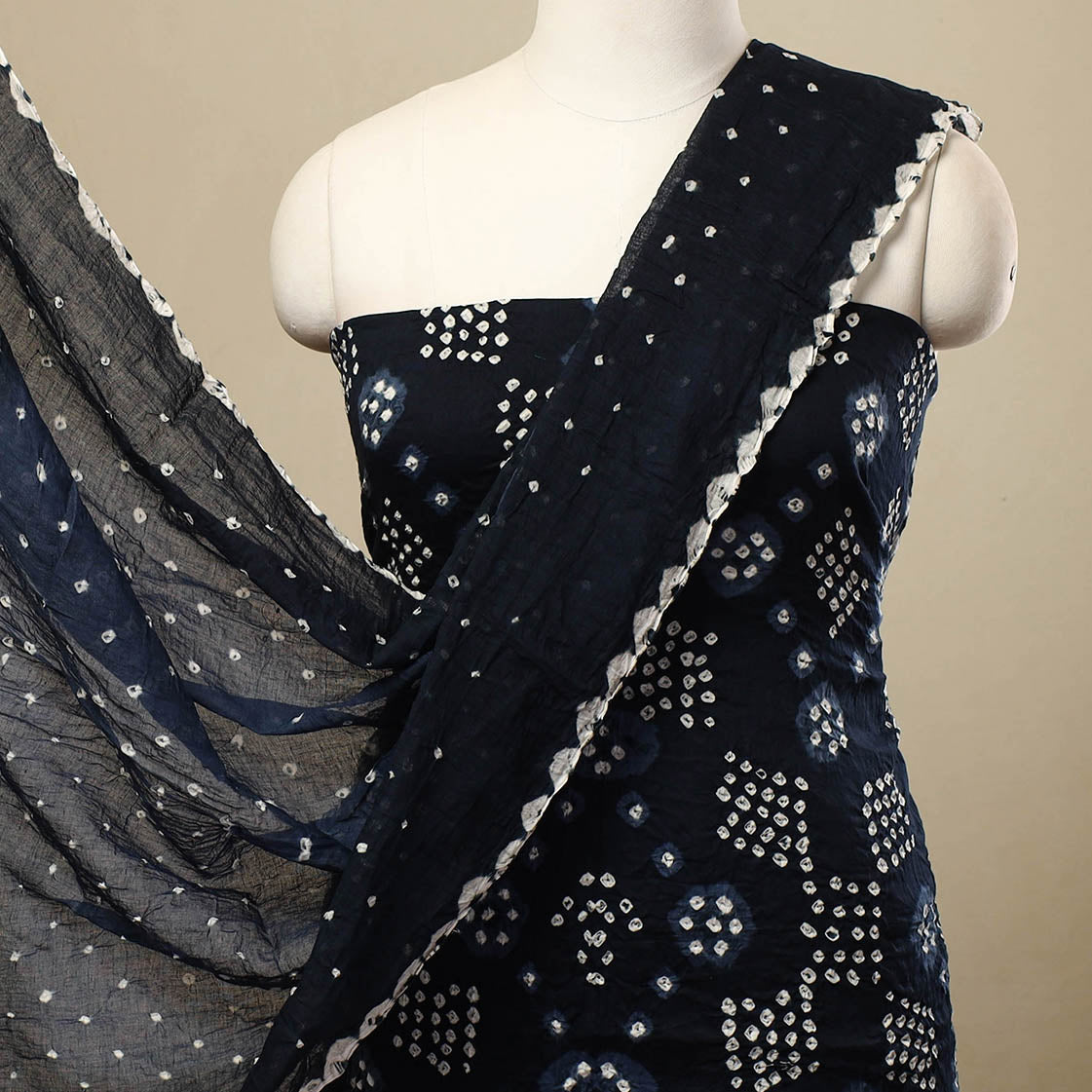 This blue 3pc bandhani dress material brings alive the timeless tie-dye artistry of Kutch in vibrant hues and intricate patterns. Made from soft satin cotton, the set includes a kurta, matching bottom, and dupatta with all adorned with intricate patterns tied and dyed by hand. The detailed motifs are created using the traditional bandhani method. This set adds an elegant touch to your wardrobe.