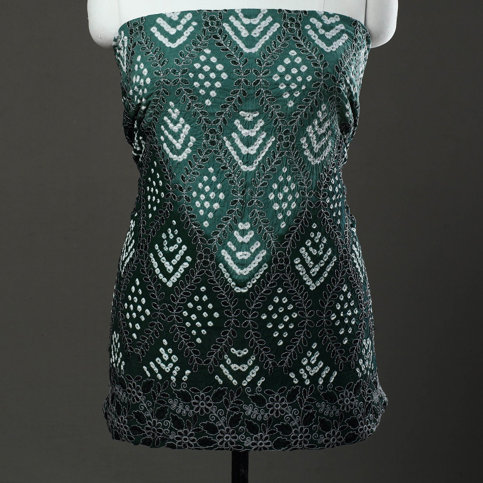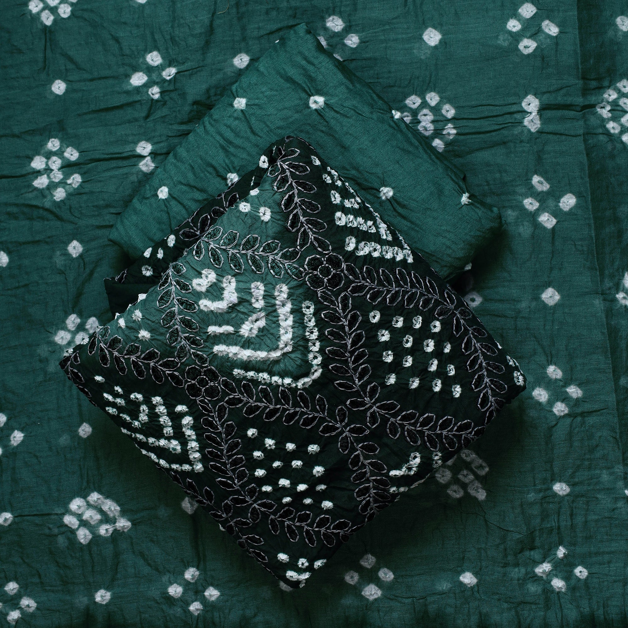 Green 3pc tie & dye satin cotton bandhani dress material by Kutch artisans. This set includes an embroidered kurta, a coordinating a bottom, and a matching dupatta, all adorned with vibrant bandhani patterns. The traditional tie & dye technique, involving precise thread tying to create unique motifs, ensures that each piece is as unique as the wearer.
